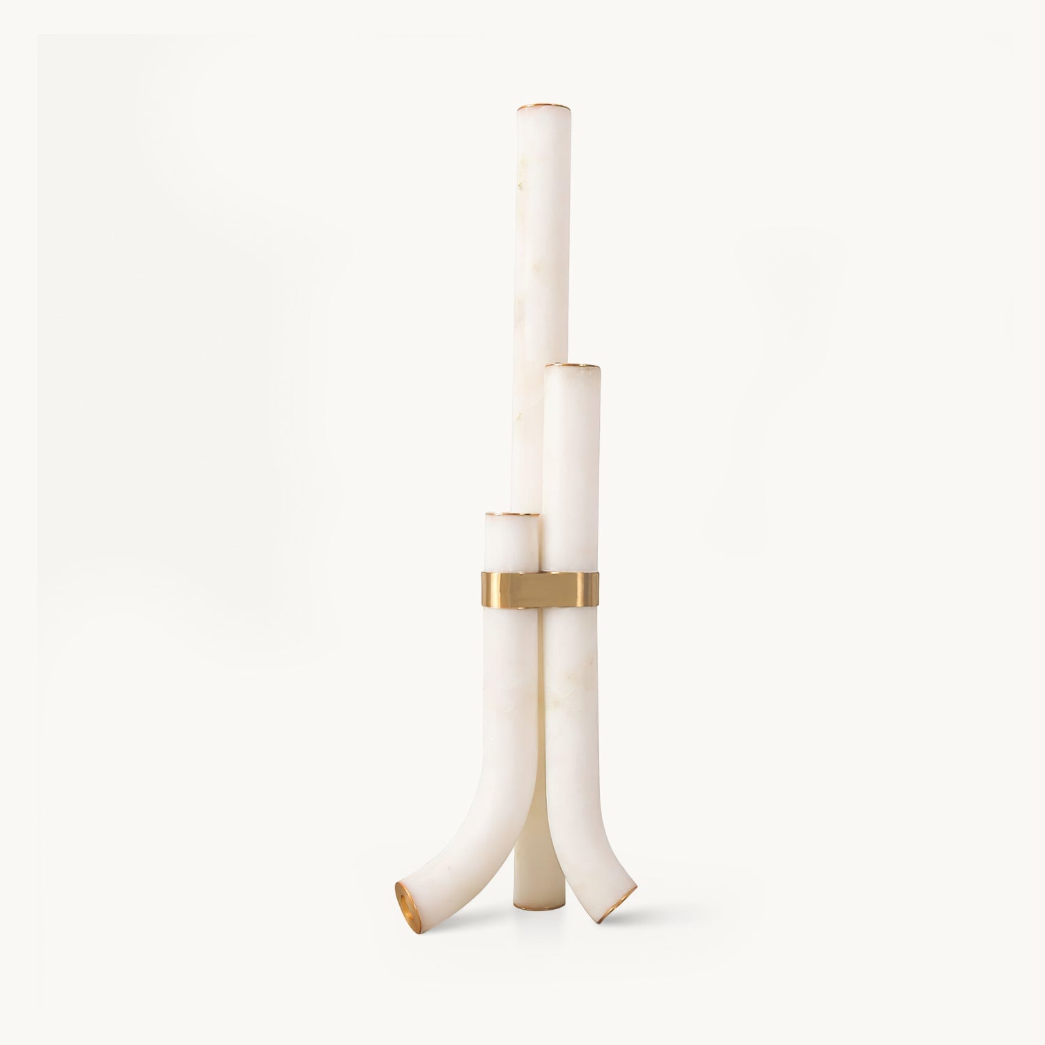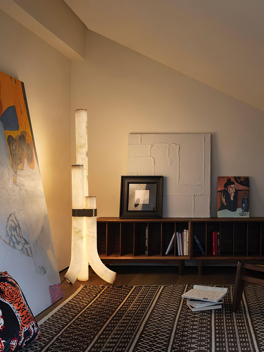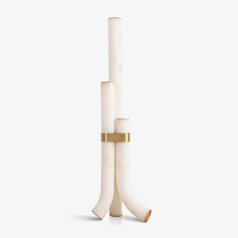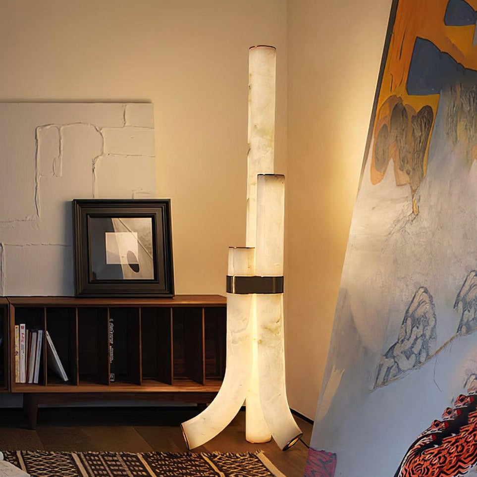 The Galawai Alabaster Floor Lamp by Mooijane showcases a sculptural composition of three piped alabaster shades arranged in a striking geometric form. Crafted from natural stone, each shade emits a soft, warm glow that highlights the stone's organic veining. Minimalist yet elegant, this floor lamp brings a refined, architectural presence to modern interiors—perfect for living rooms, reading corners, or sophisticated lounge spaces.