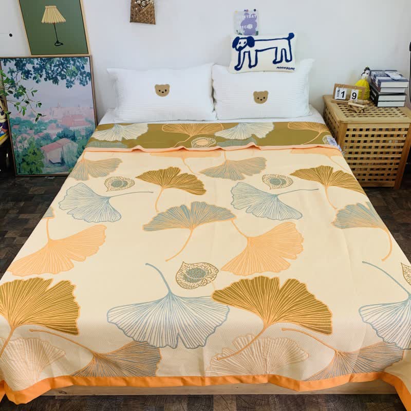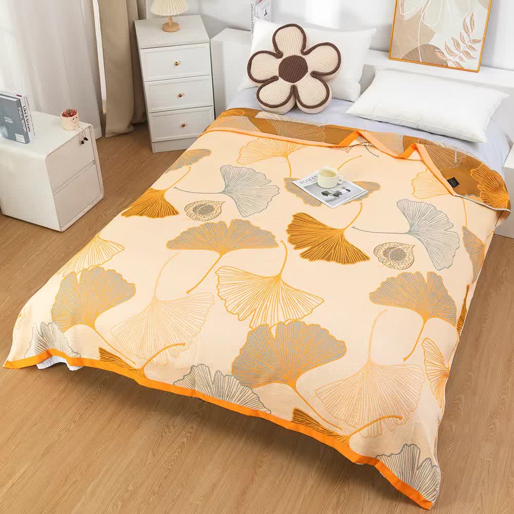 The reversible design quilt with ginkgo leaf Jacquard and bright color options allows you to change the look of your room in an instant. The high-quality cotton material used in its construction ensures a soft and comfortable sleeping experience. Adopted with reactive printing and jacquard technology. This quilt is suitable as a daily blanket for summer or a bedsheet on your bed. It also can be used as an air conditioning blanket, airplane blanket, bedside towel, sofa blanket, shawl blanket.