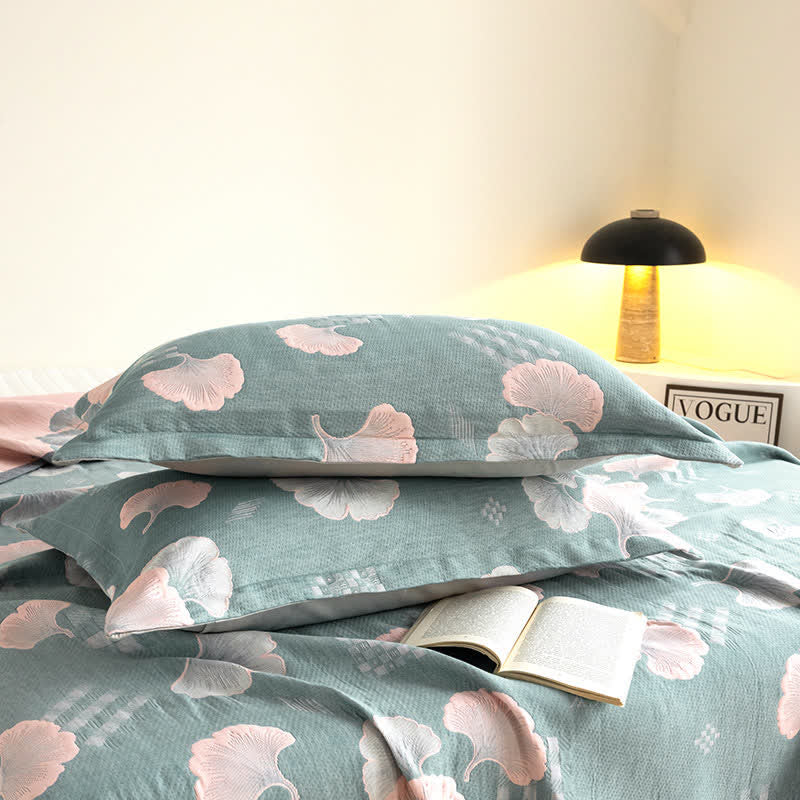 Instantly transform your room with our reversible quilt featuring a vibrant ginkgo leaf jacquard pattern. Made with environmentally friendly reactive printing and jacquard technology, it's fade-resistant and stylish. The ergonomic stitching ensures a perfect fit to reduce stress and anxiety, promoting quick relaxation and better sleep. Enjoy comfort and versatility in this exquisite quilt.