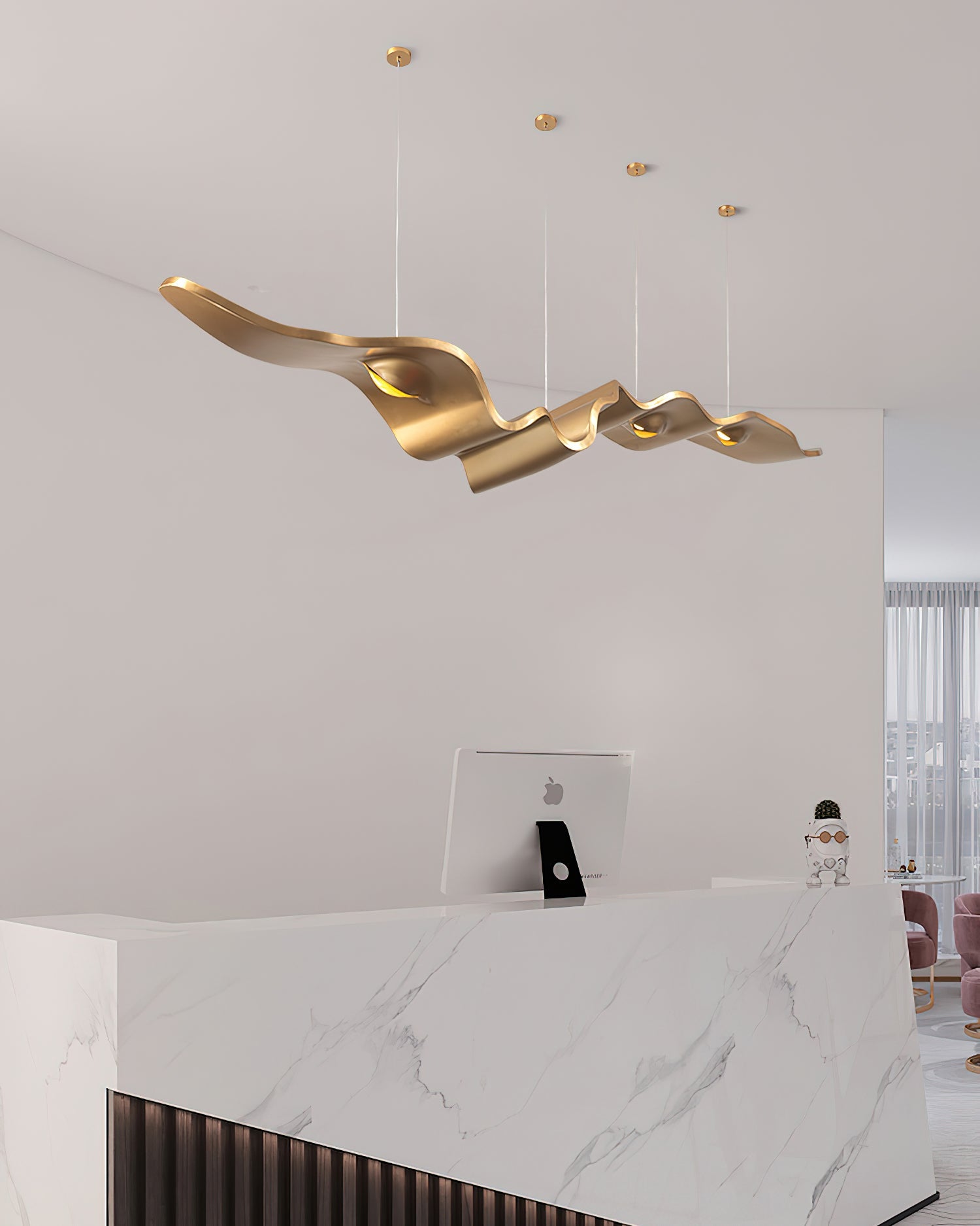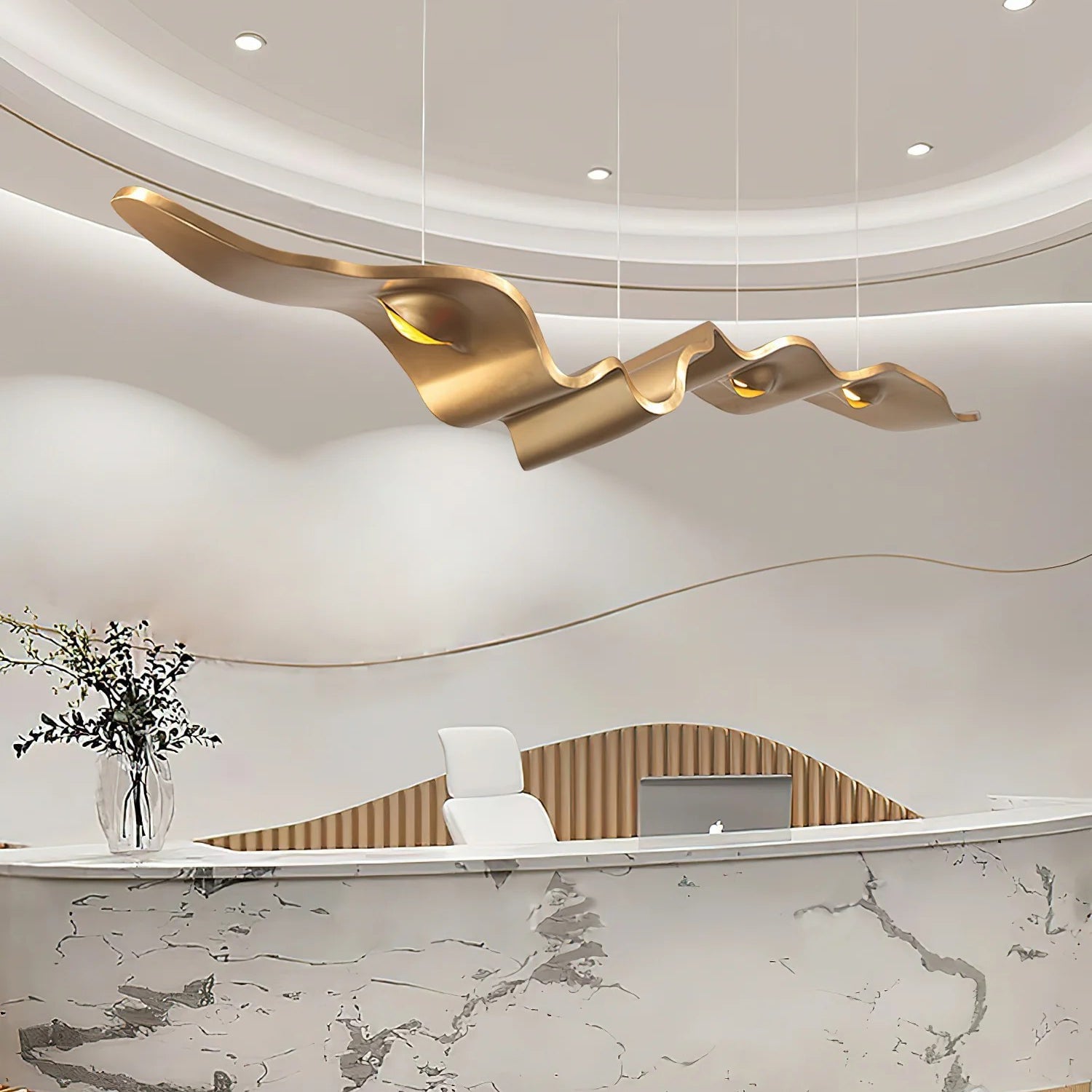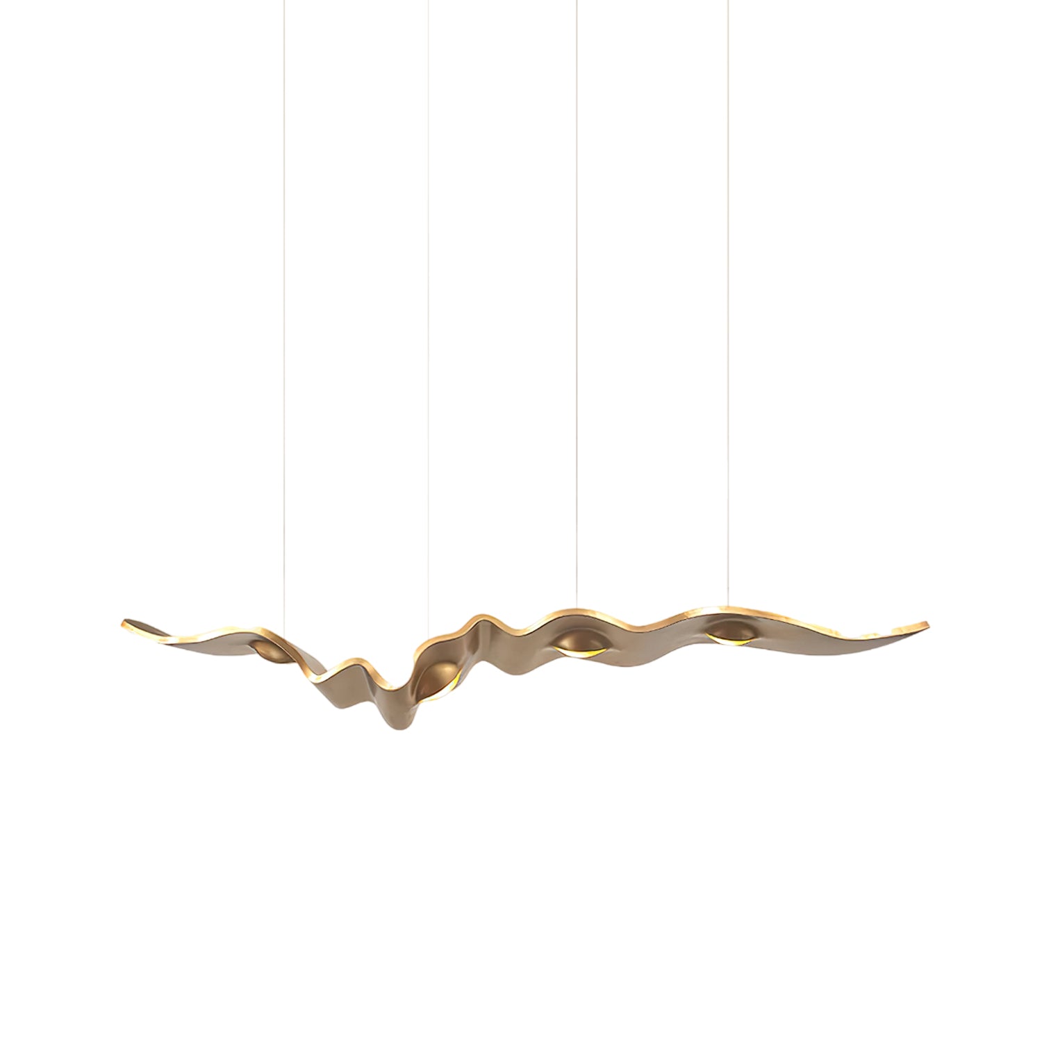 Crafted in aluminum, the Gold Ribbon Chandelier has a unique expression and shape, accentuated by its glowing surface and varying brightness levels. A light source within the body shines through an opening, creating a captivating centerpiece for any room. Elevate your space with this expertly crafted chandelier.