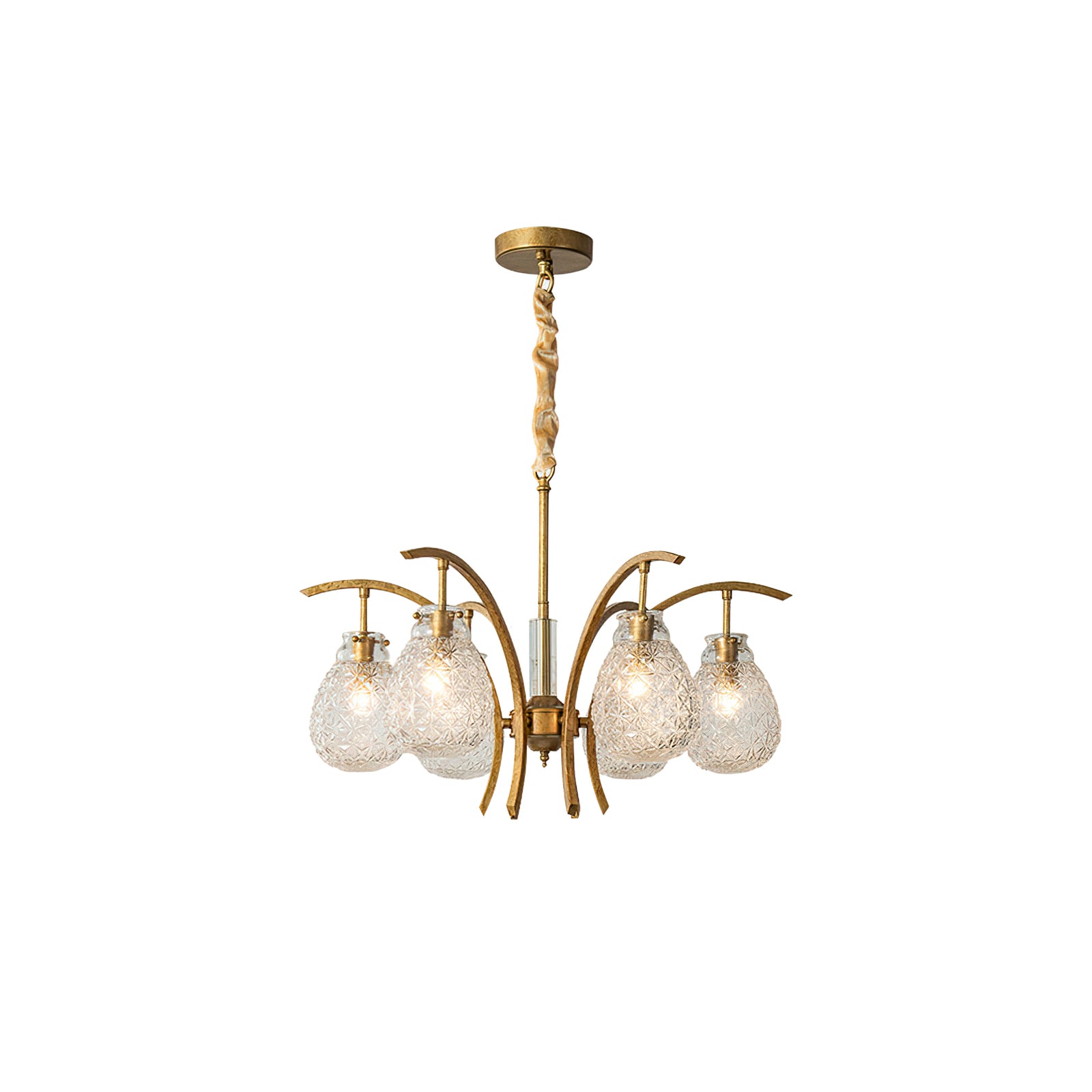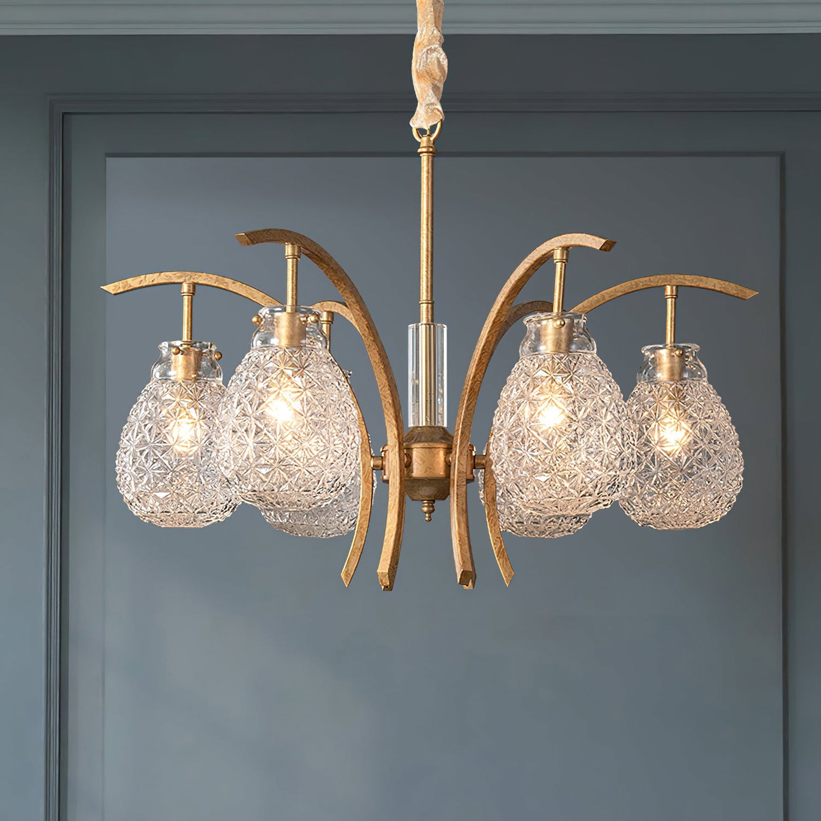 The Gold Floral Glass Chandelier features a traditional curved lampshade made of clear striped glass with a warm brass frame that mimics the beauty of a blooming flower with eye-catching details. Use it to add a touch of elegance to your dining room, living room, bedroom, and more.