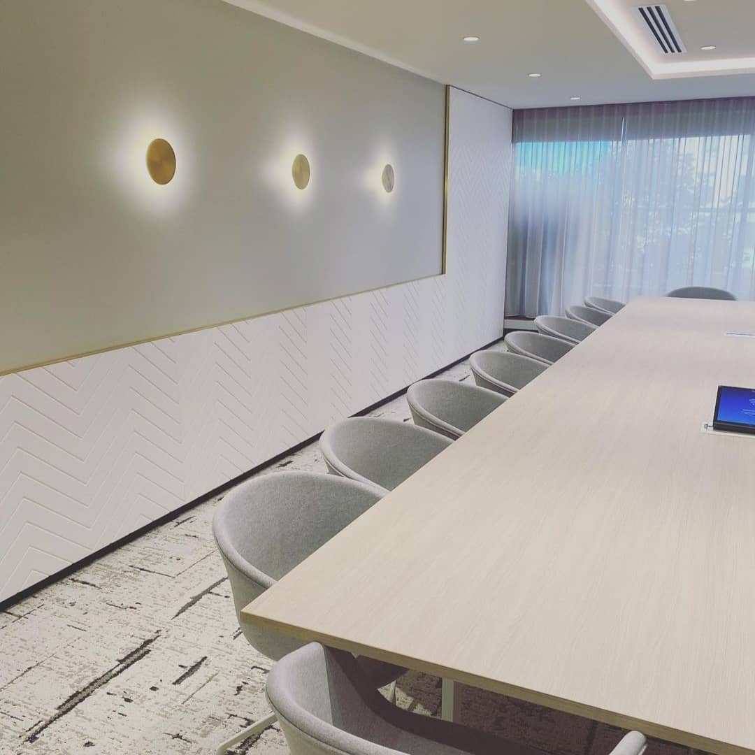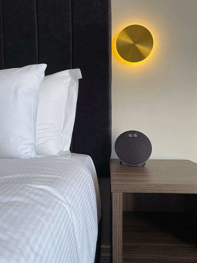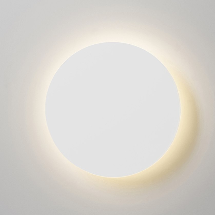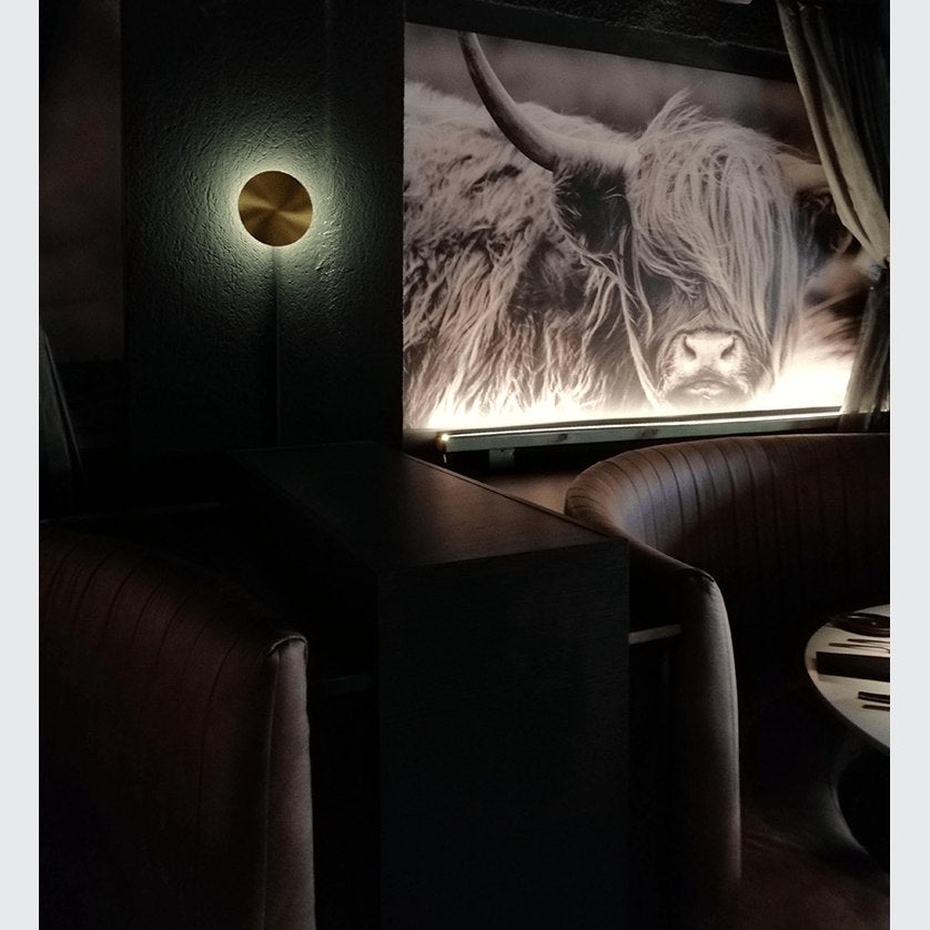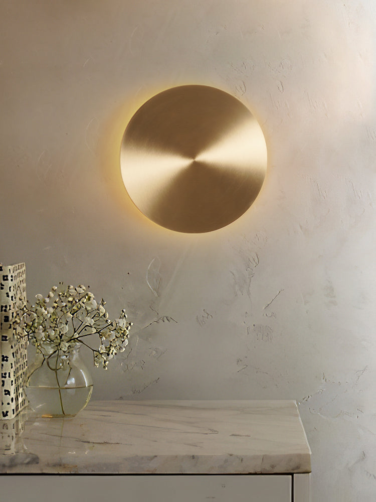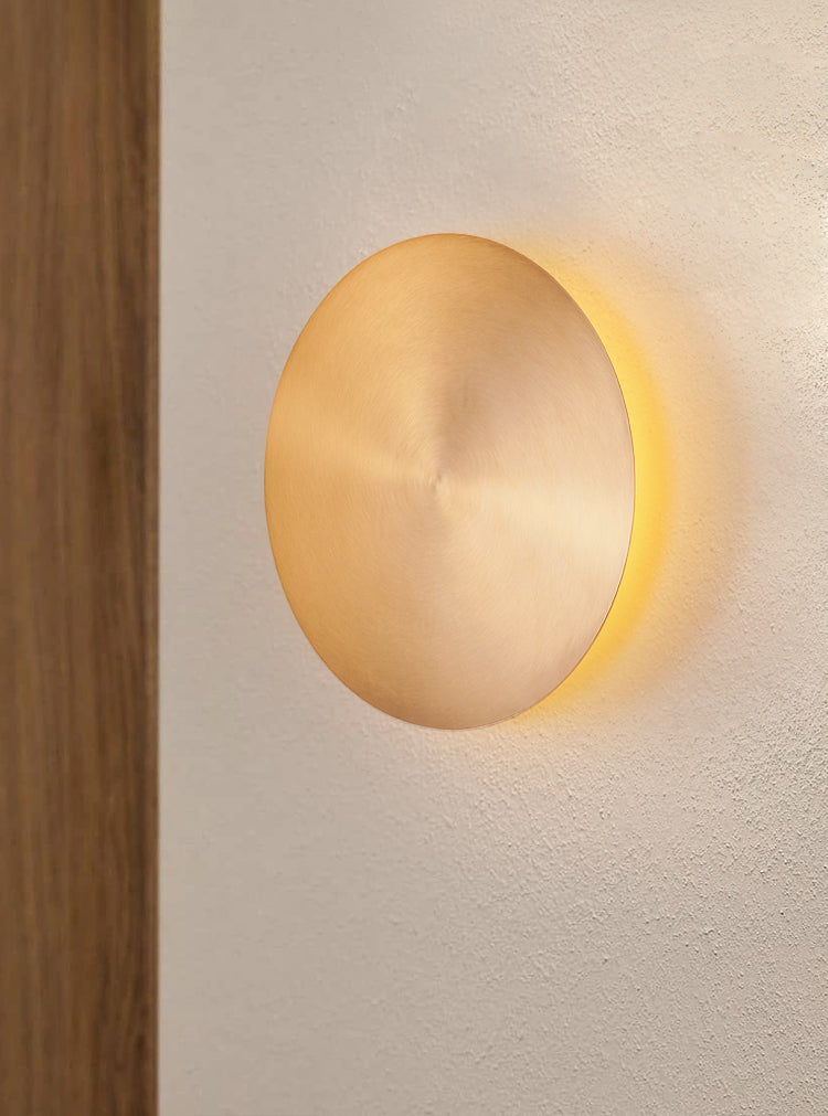 A streamlined disk structure, the GOSSA wall light from MOOIJANE is made from metal. It presents light in a ring from underneath the disc, like a halo. The light is available in white or brass finishes.
