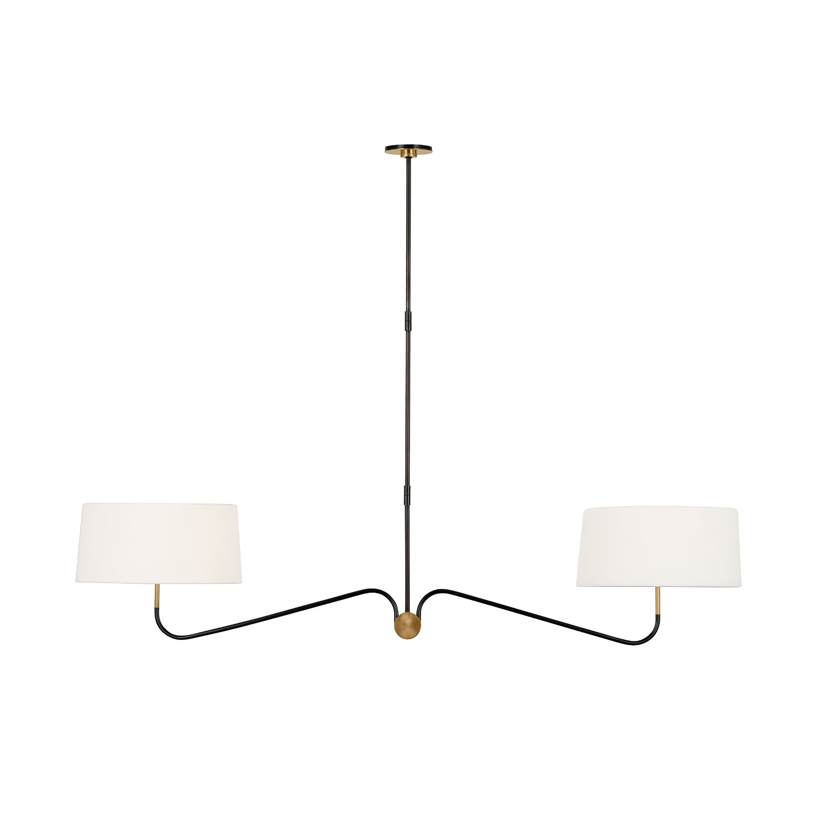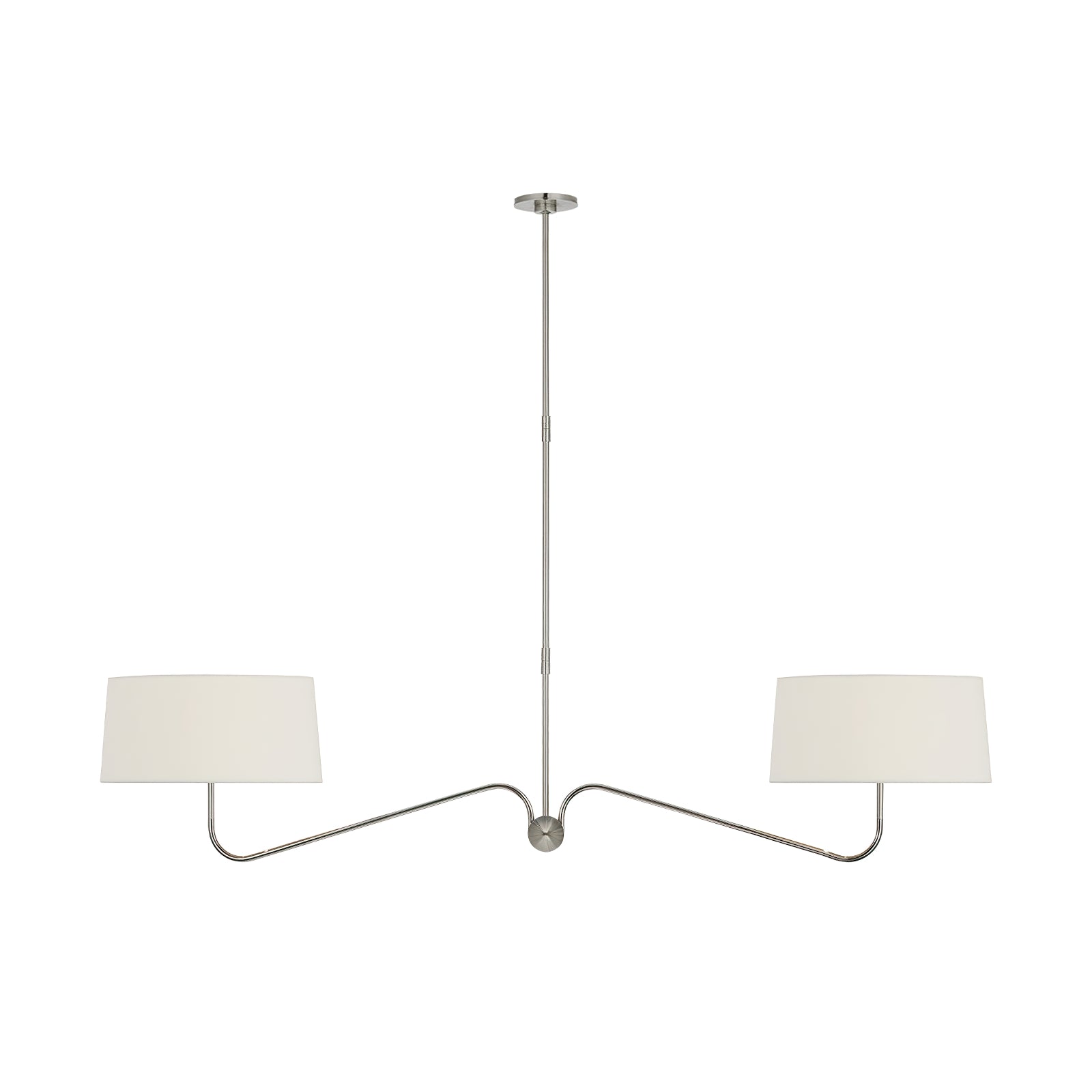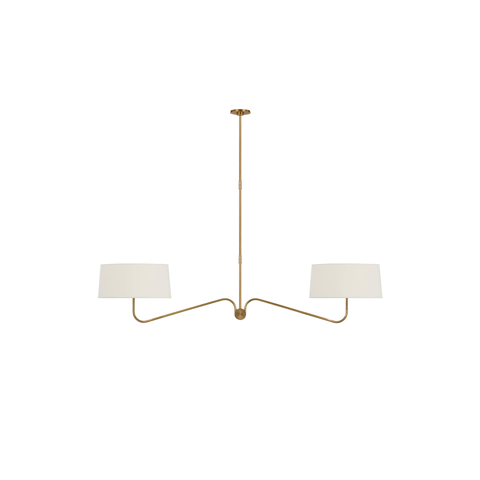 Achieve a sleek and refined aesthetic with the Grande Two-Arm Chandelier. Its minimalist metal frame, balanced by the white linen shades, offers an effortless blend of form and function. Perfect for highlighting dining areas or entryways, this chandelier embodies timeless elegance with its clean lines and modern appeal.