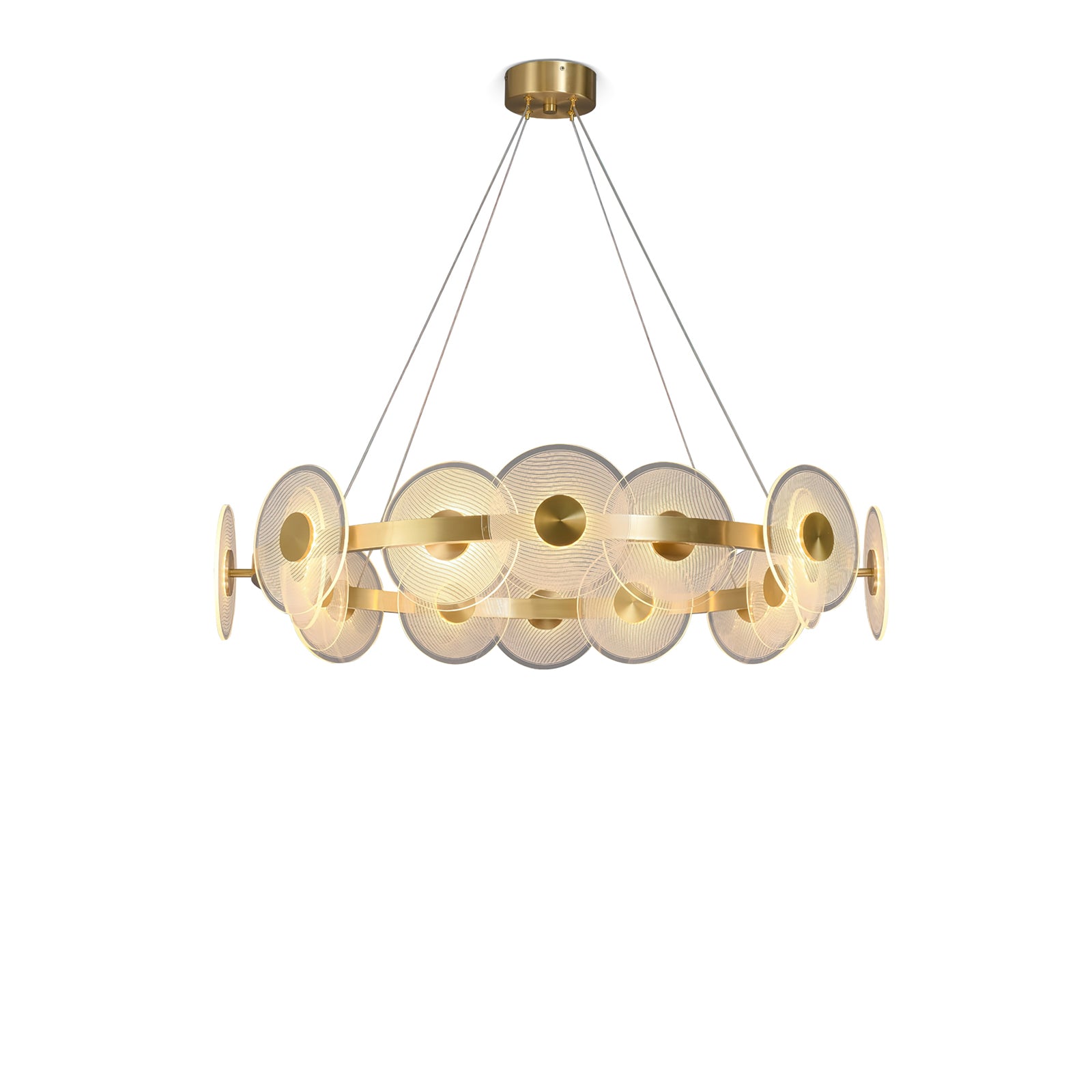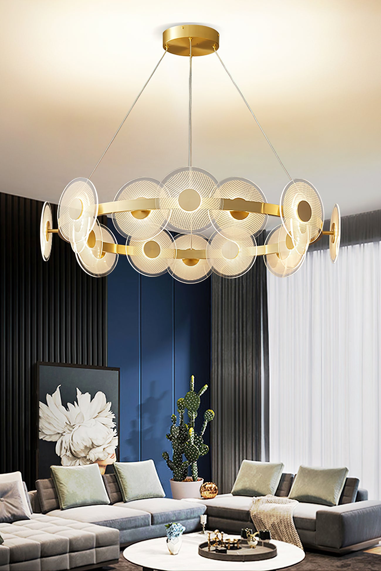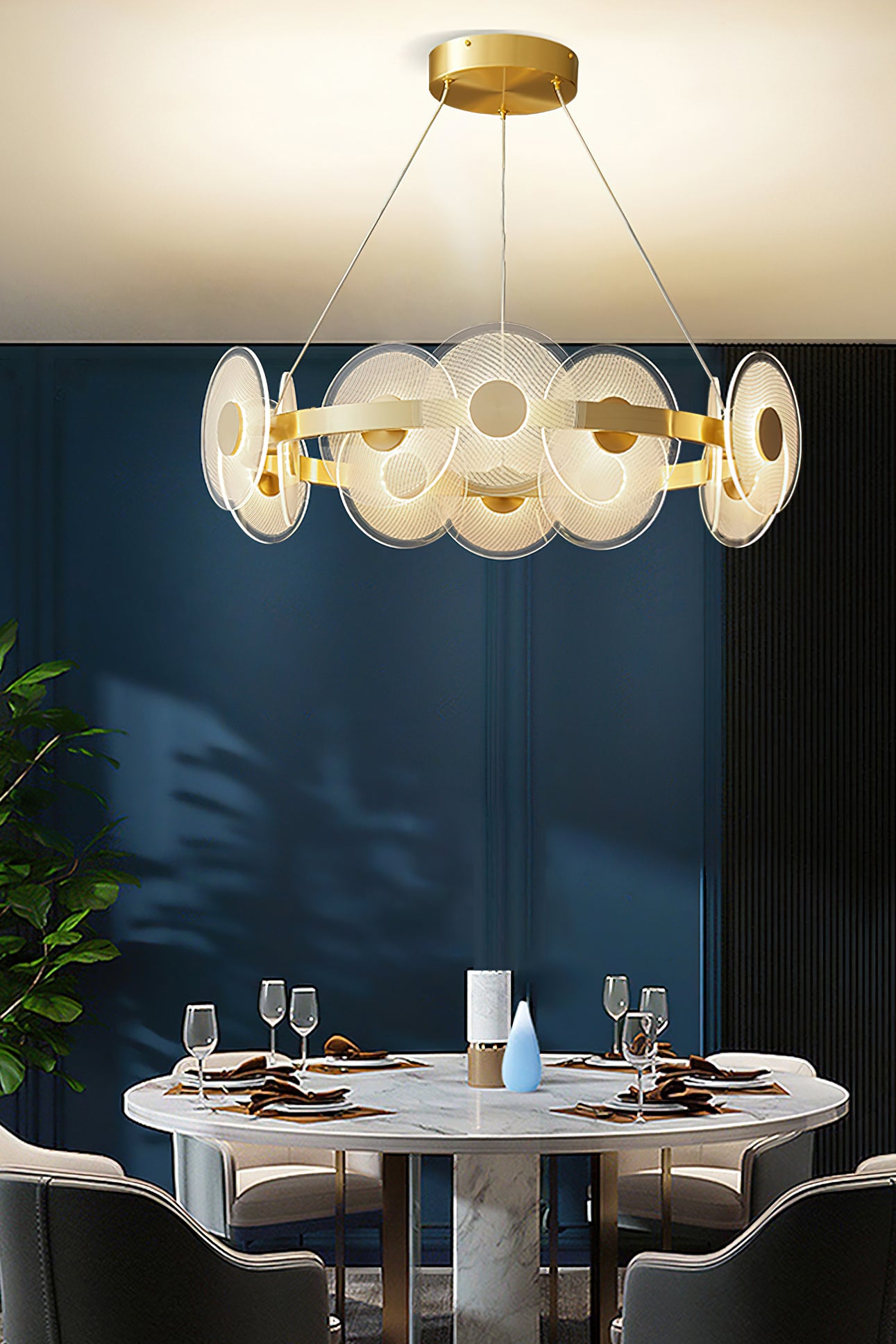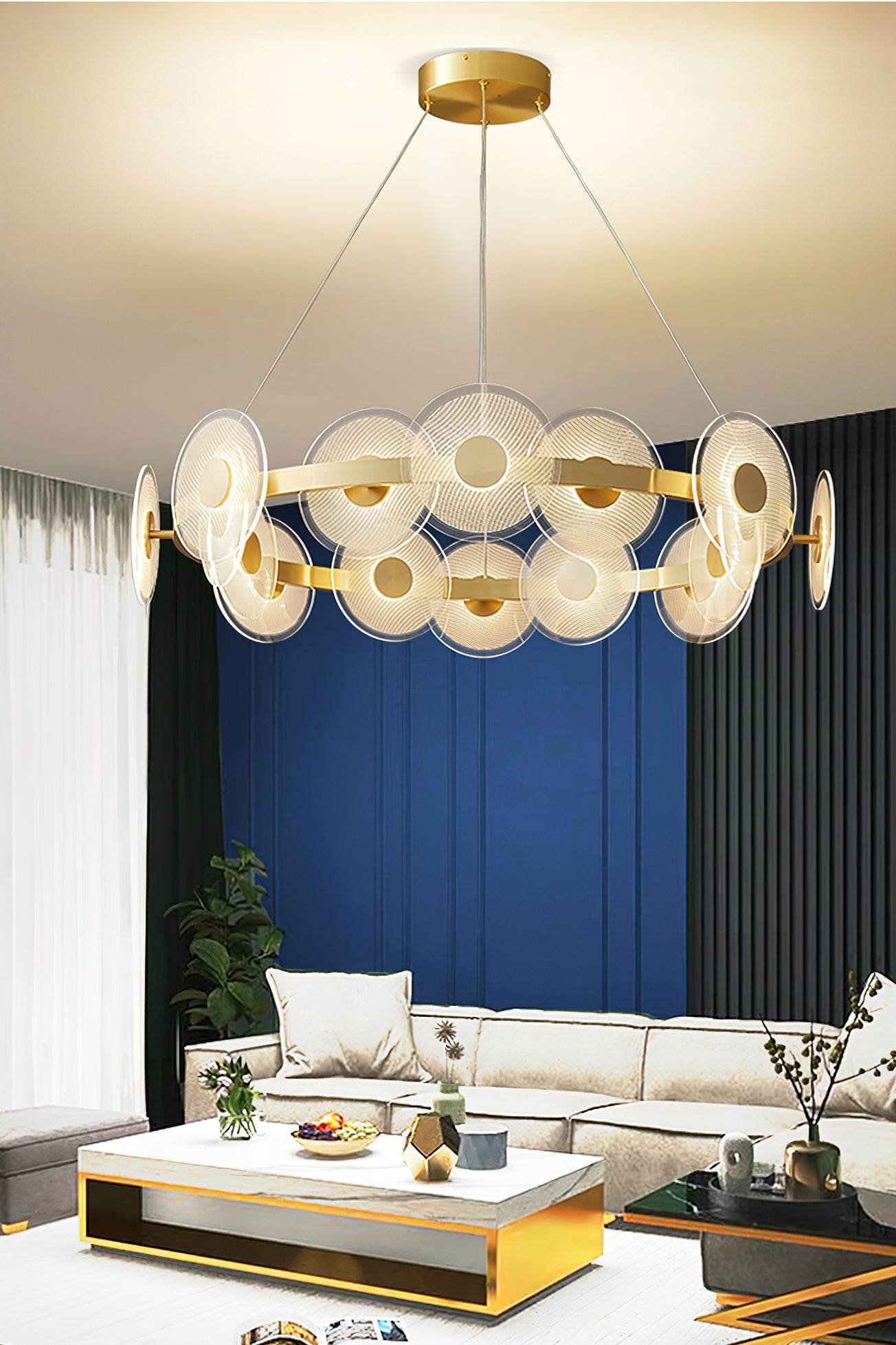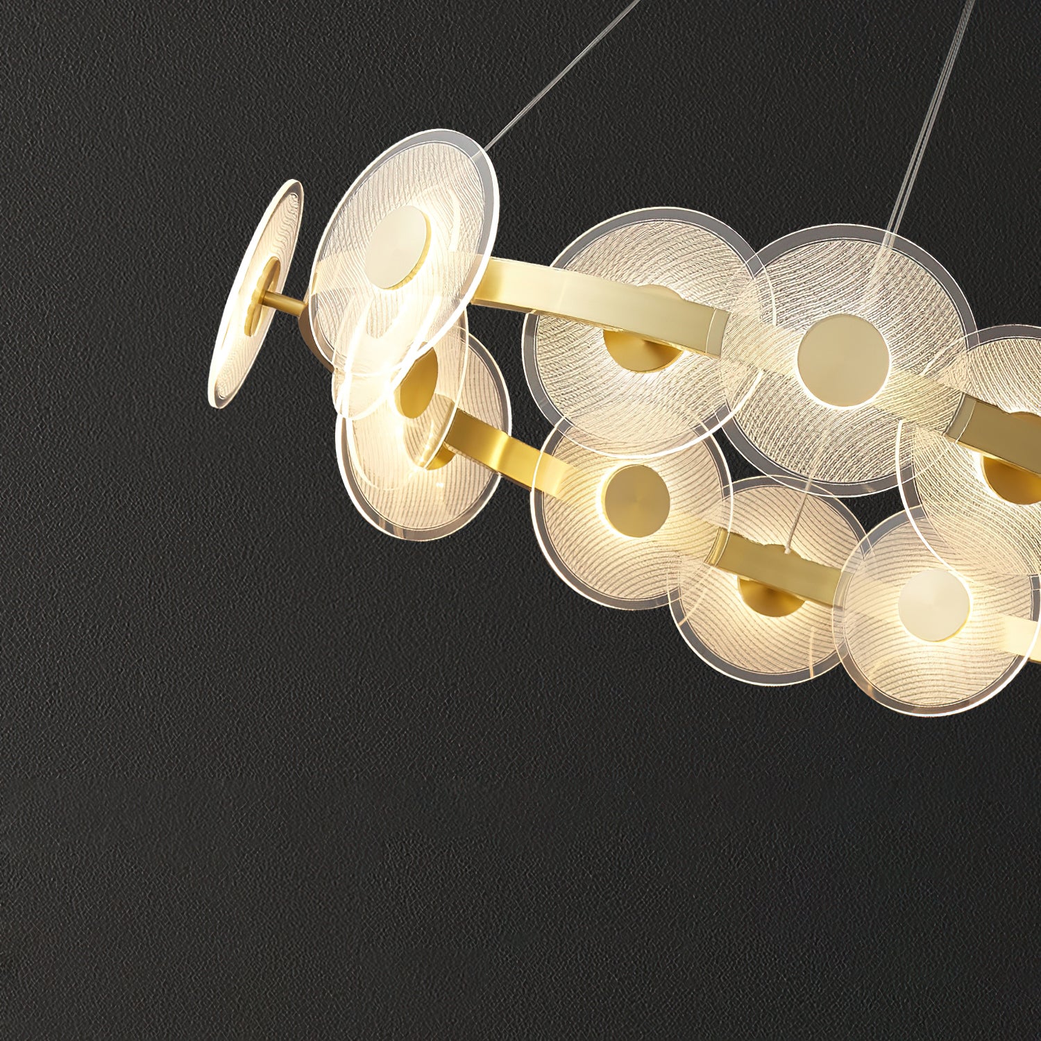 The Halo Chandelier illuminates any space with its stunning design. Its brass lamp body is brushed and suspended, making it corrosion-resistant and rust-free for long-lasting performance. The high-quality acrylic lampshade provides a clear, soft light, while the all-copper ceiling panel ensures a stable and reliable design. Choose from three colors and adjust the brightness and color temperature with each.