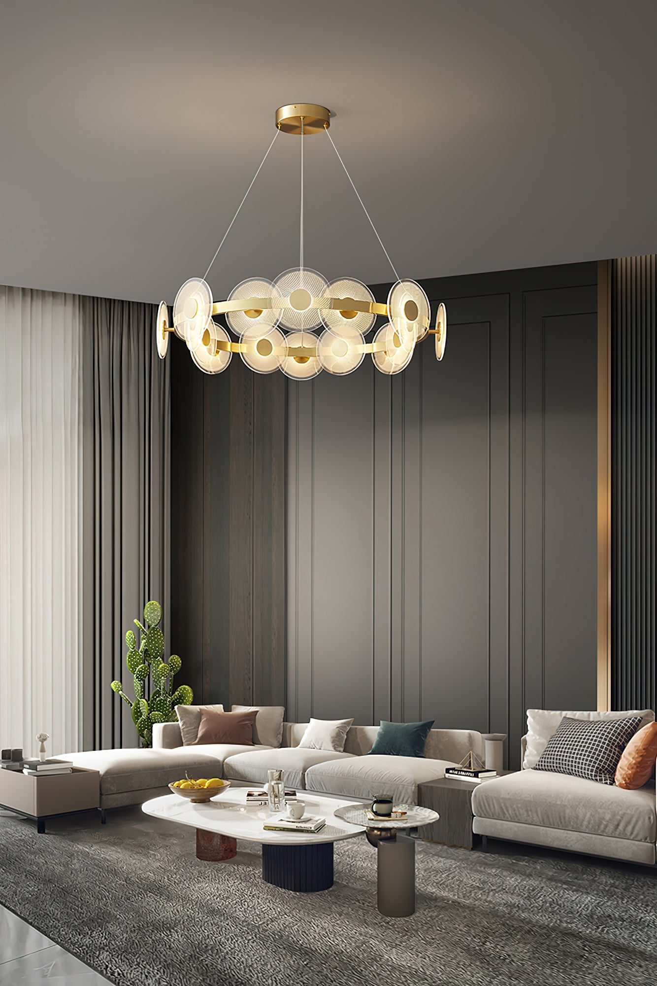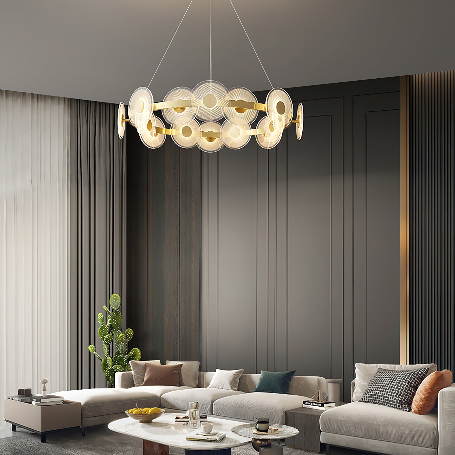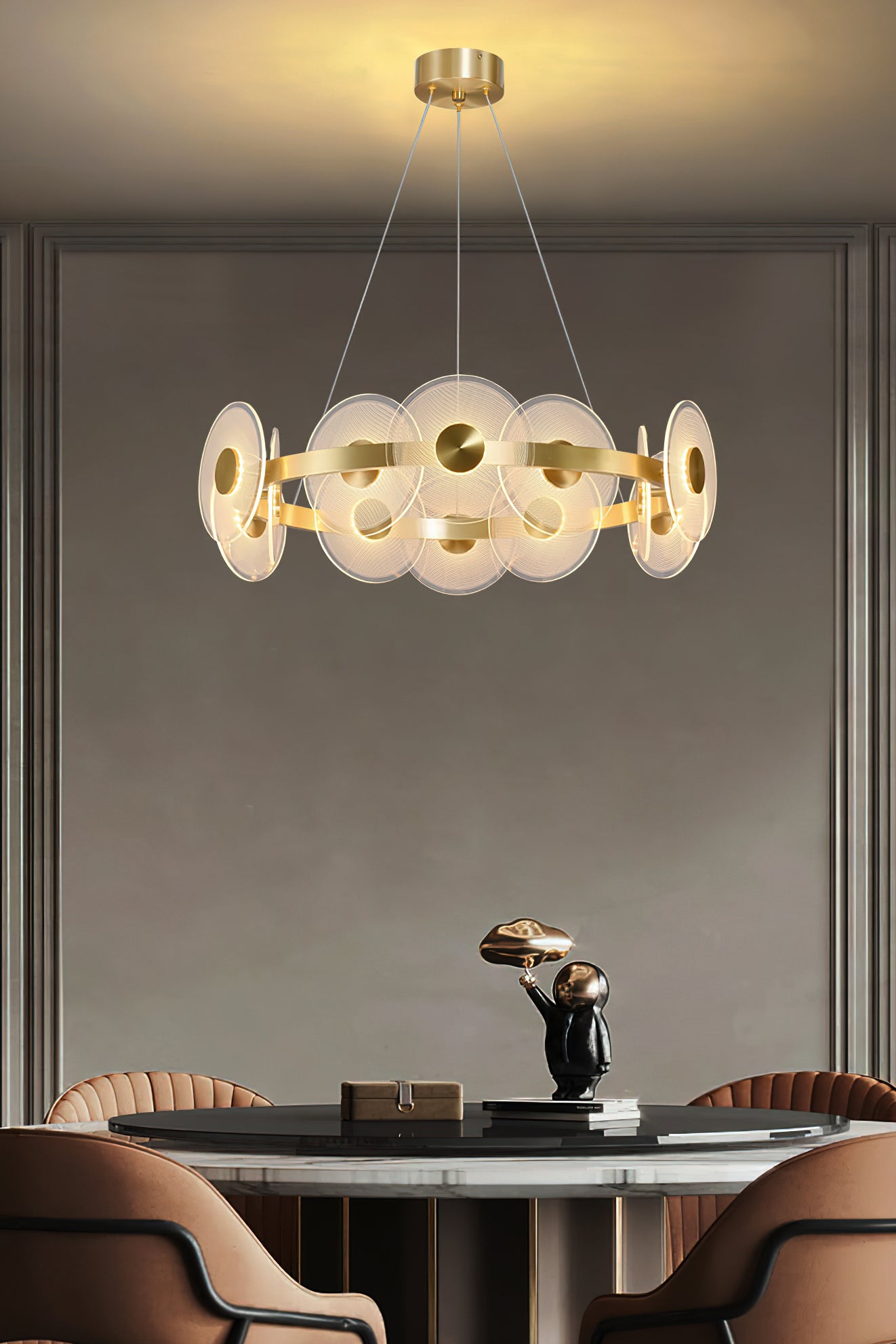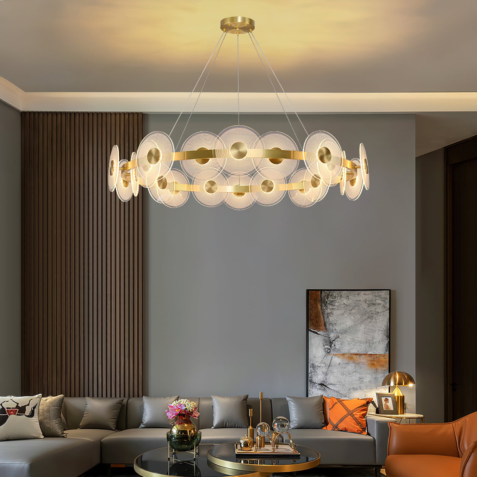 The Halo Chandelier illuminates any space with its stunning design. Its brass lamp body is brushed and suspended, making it corrosion-resistant and rust-free for long-lasting performance. The high-quality acrylic lampshade provides a clear, soft light, while the all-copper ceiling panel ensures a stable and reliable design. Choose from three colors and adjust the brightness and color temperature with each.