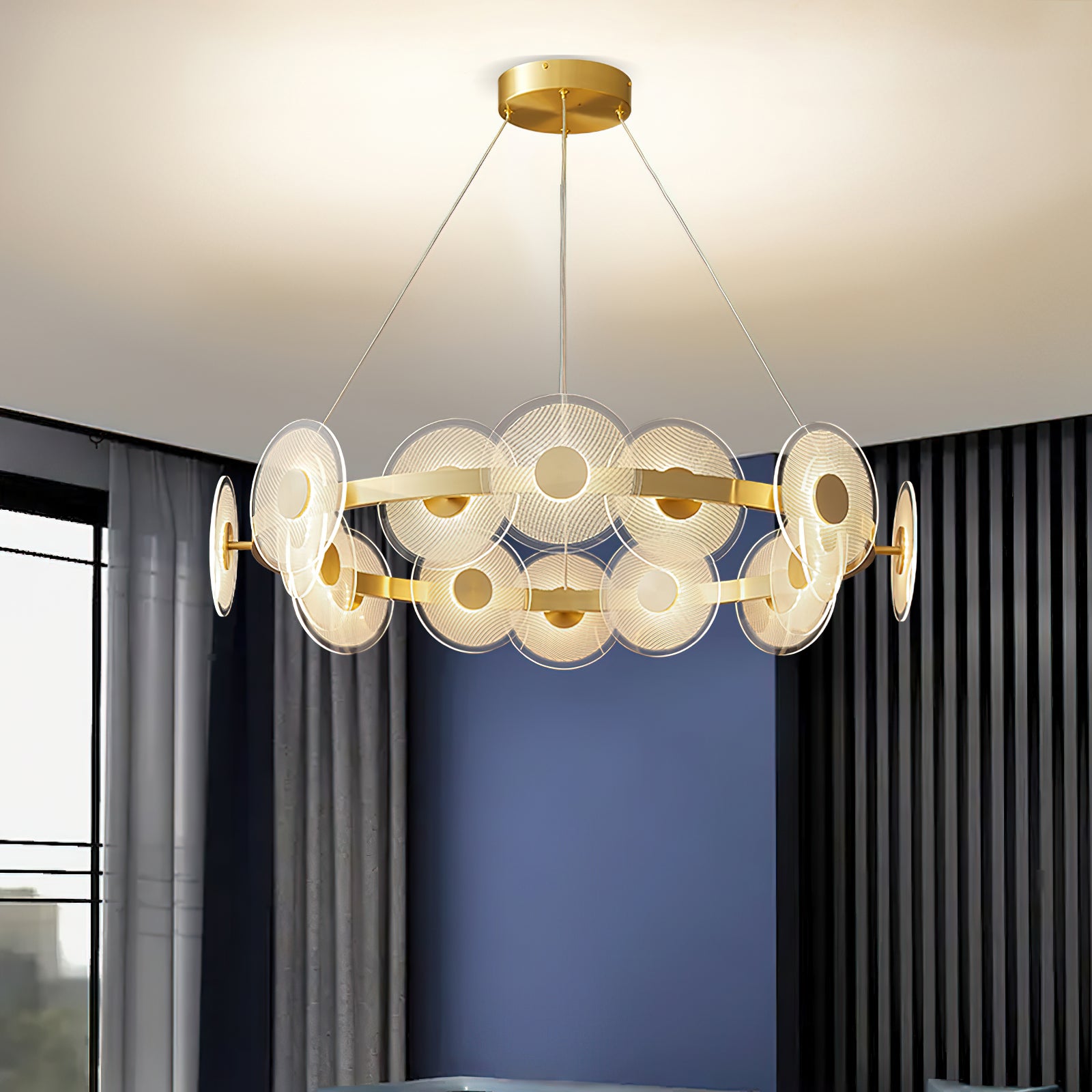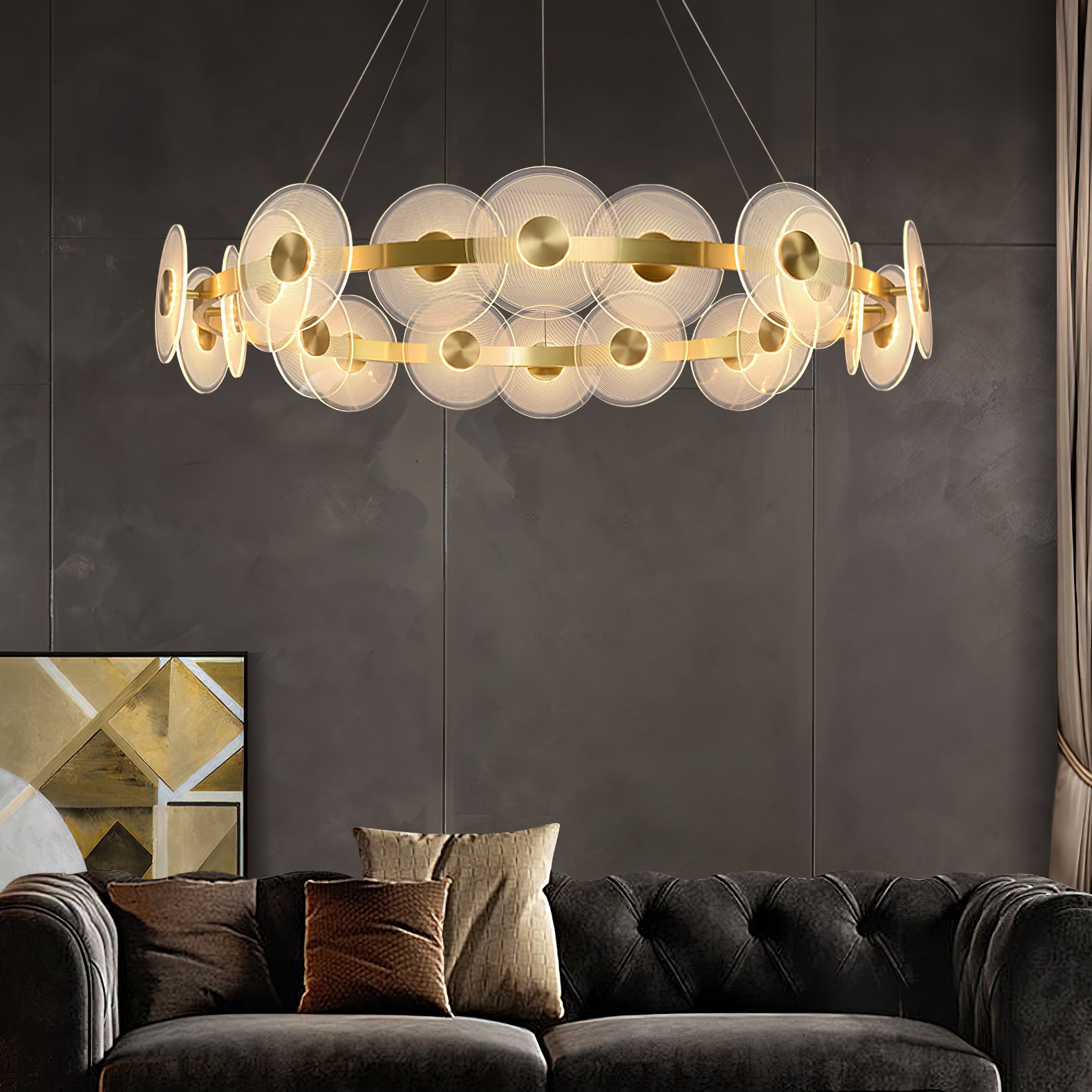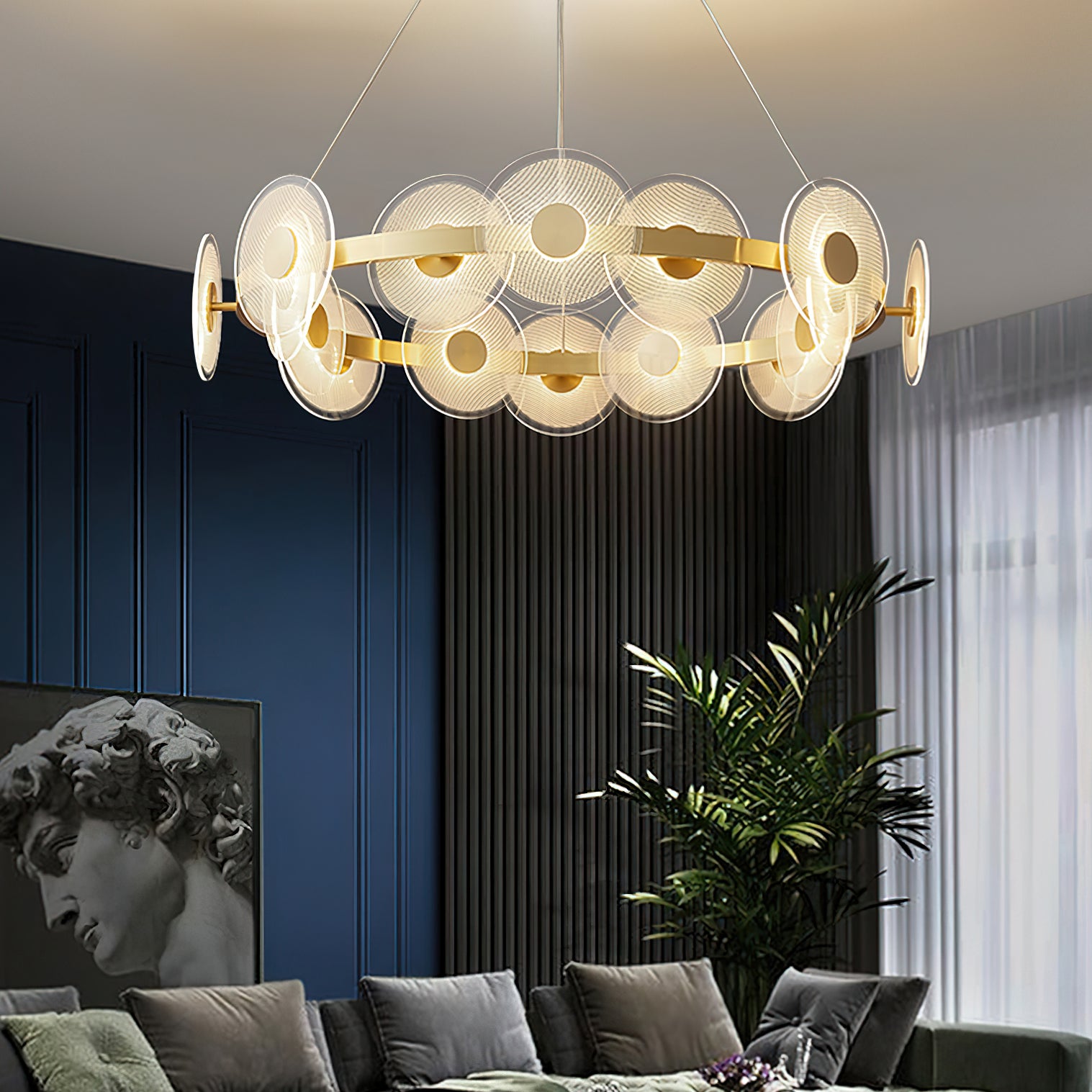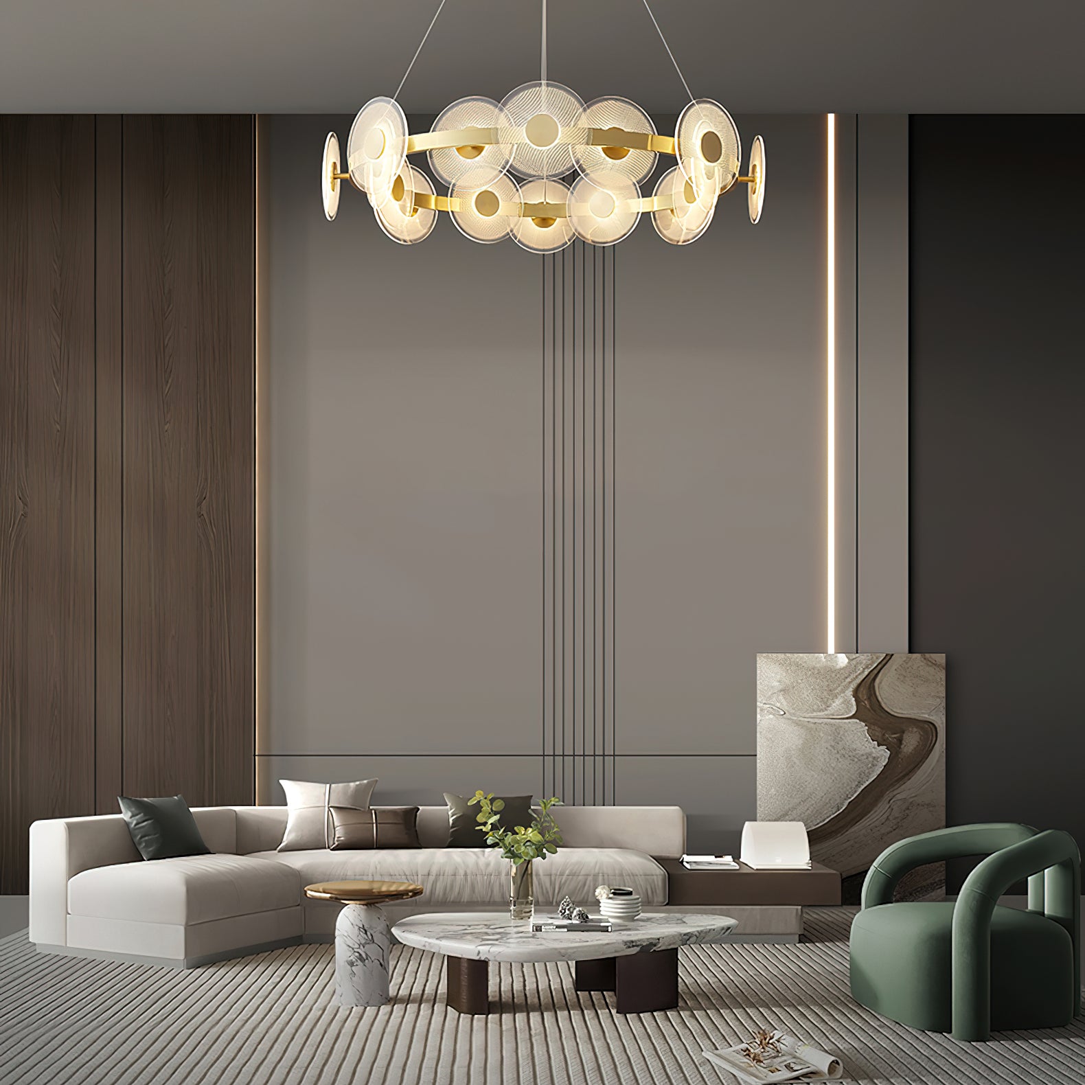 The Halo Chandelier illuminates any space with its stunning design. Its brass lamp body is brushed and suspended, making it corrosion-resistant and rust-free for long-lasting performance. The high-quality acrylic lampshade provides a clear, soft light, while the all-copper ceiling panel ensures a stable and reliable design. Choose from three colors and adjust the brightness and color temperature with each.