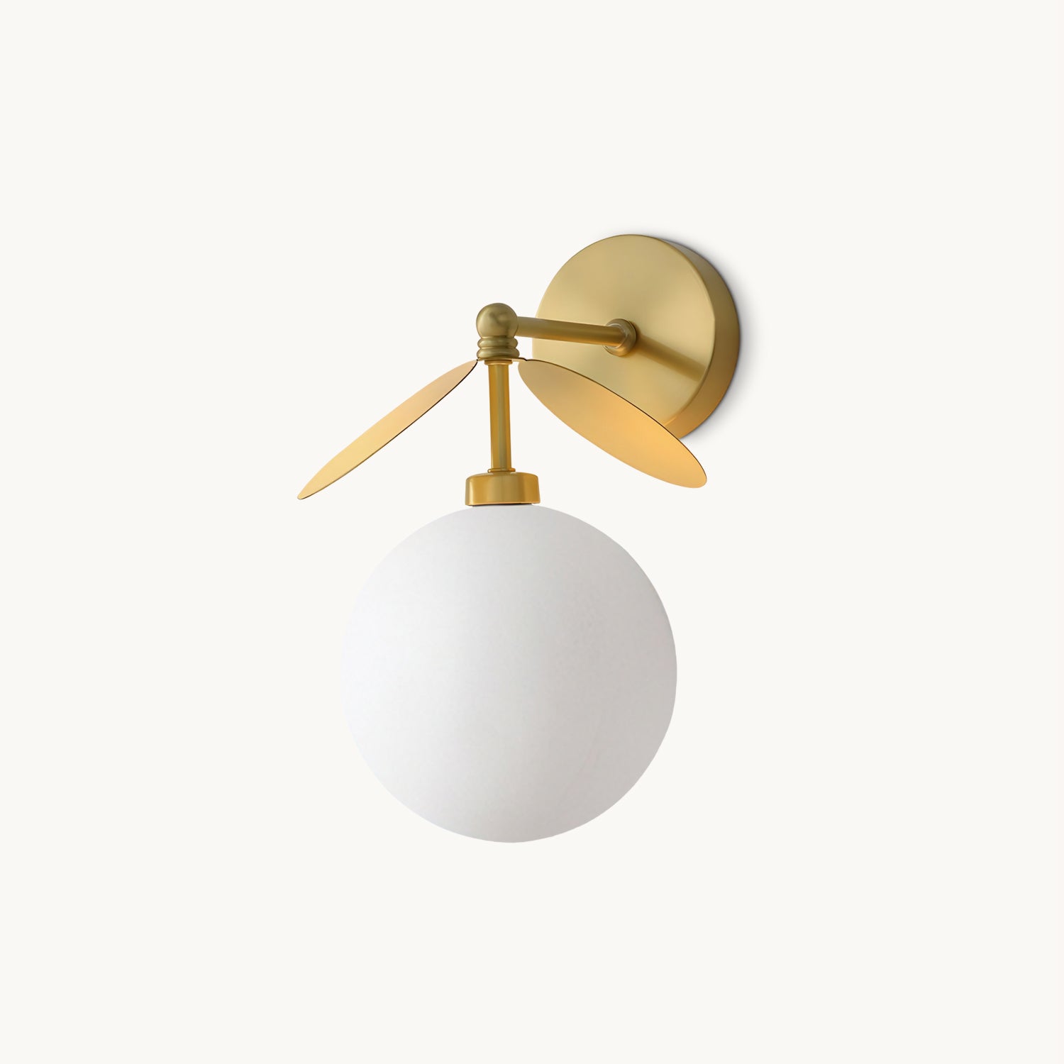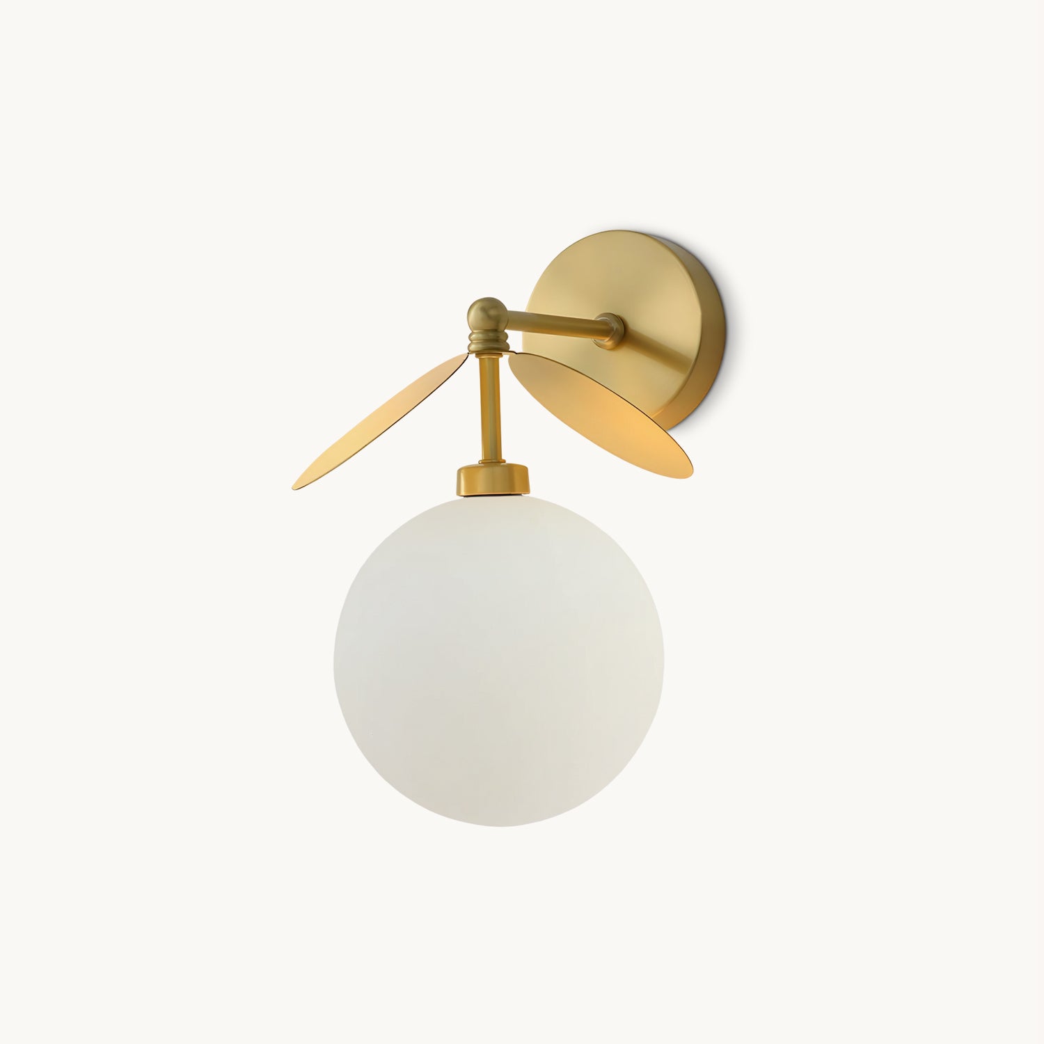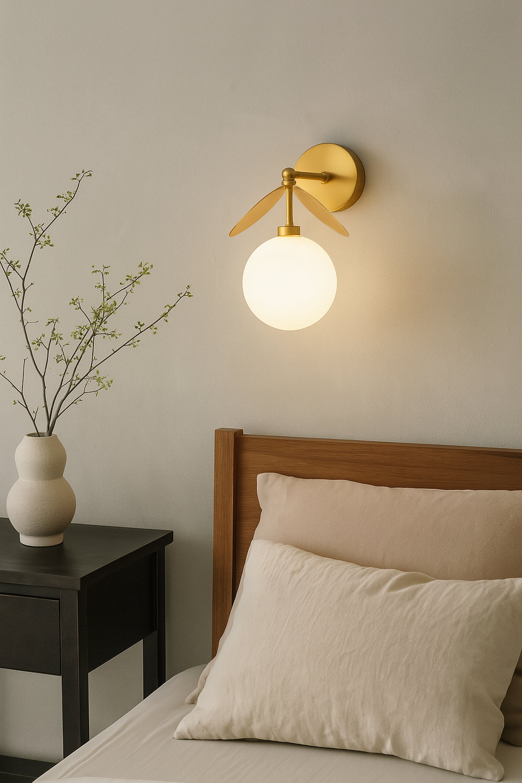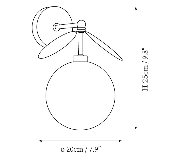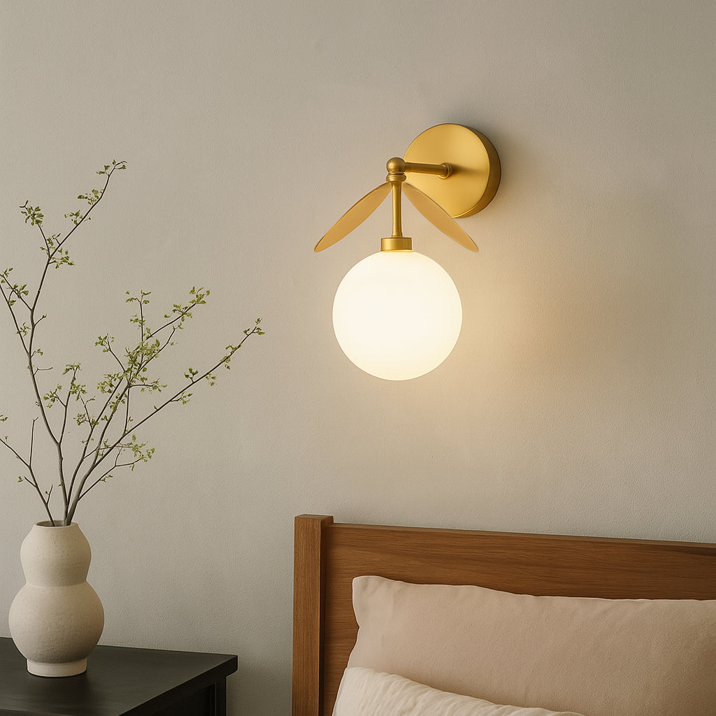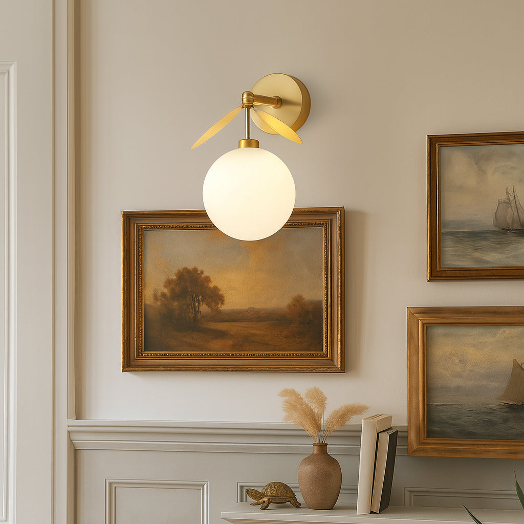 The Hanson Wall Light by Mooijane perfectly blends modern design with artistic details. Crafted from metal, it features clean lines and a soft finish for a simple yet sophisticated look. The opalescent glass globe emits a warm, ambient glow, while two sculptural metal "blades" add depth and visual interest. Perfect for a hallway, bedside, or accent wall, this wall light combines lighting and decoration to bring comfort and personality to any space.