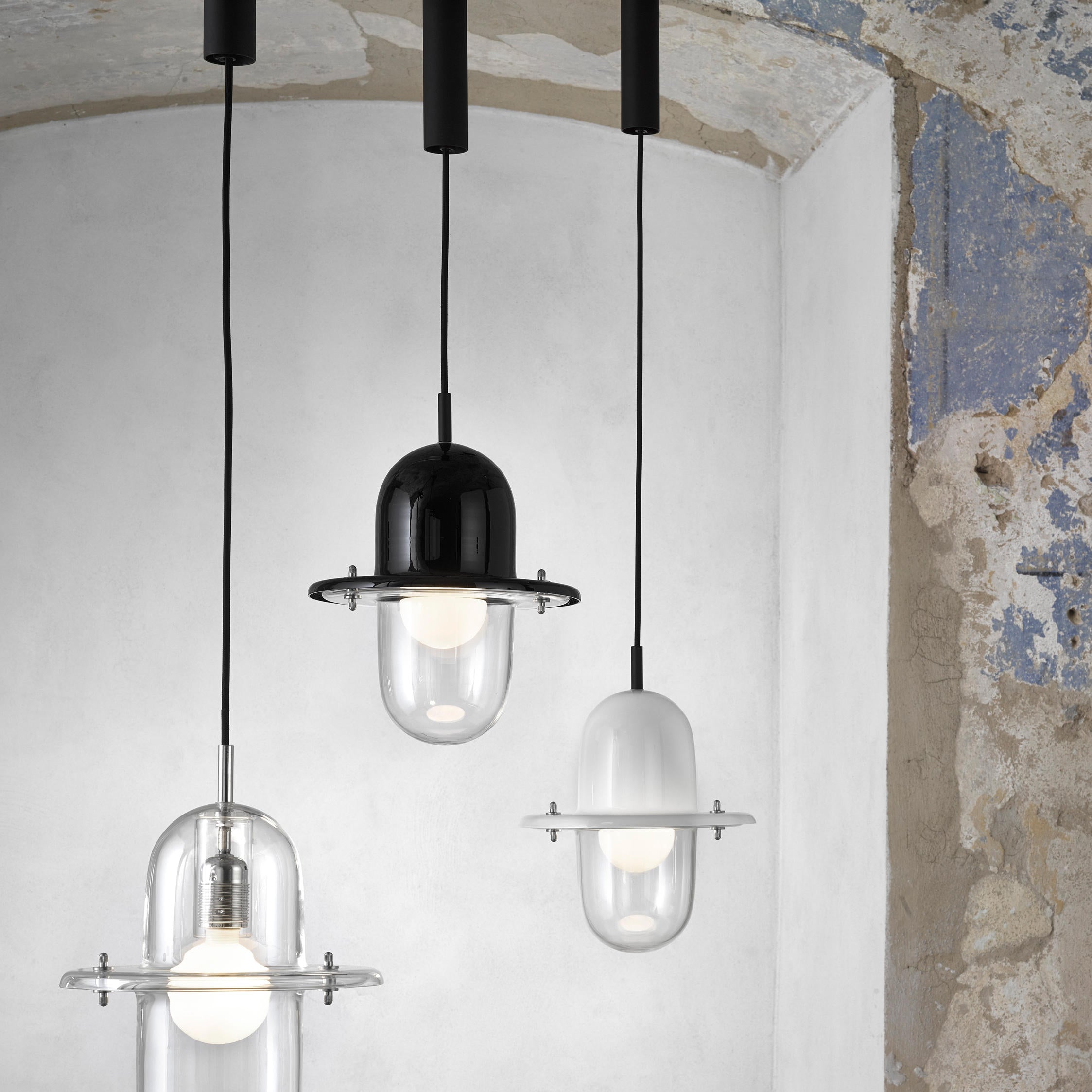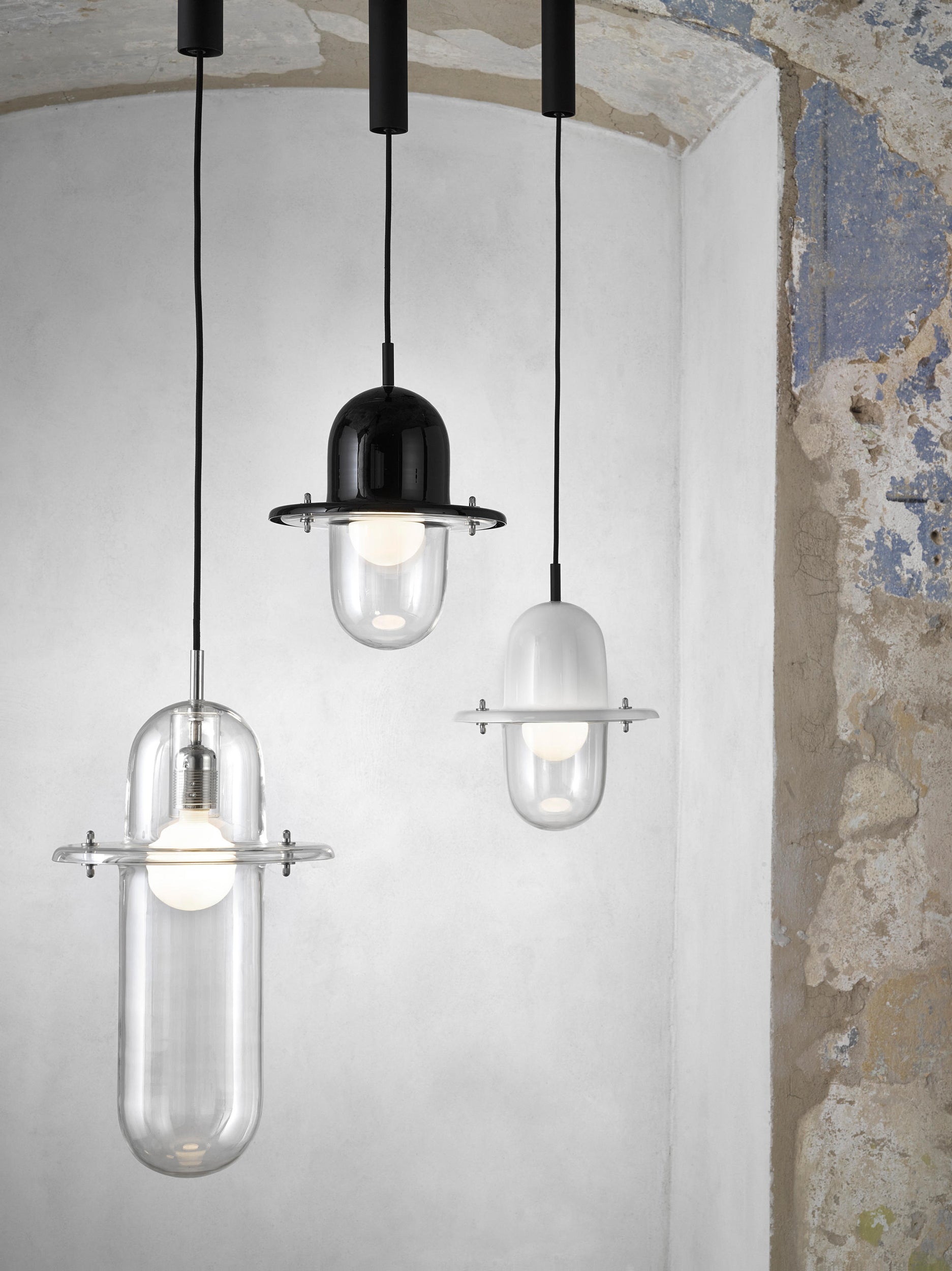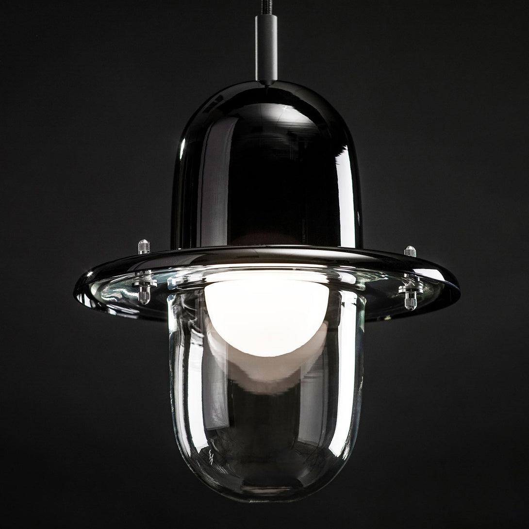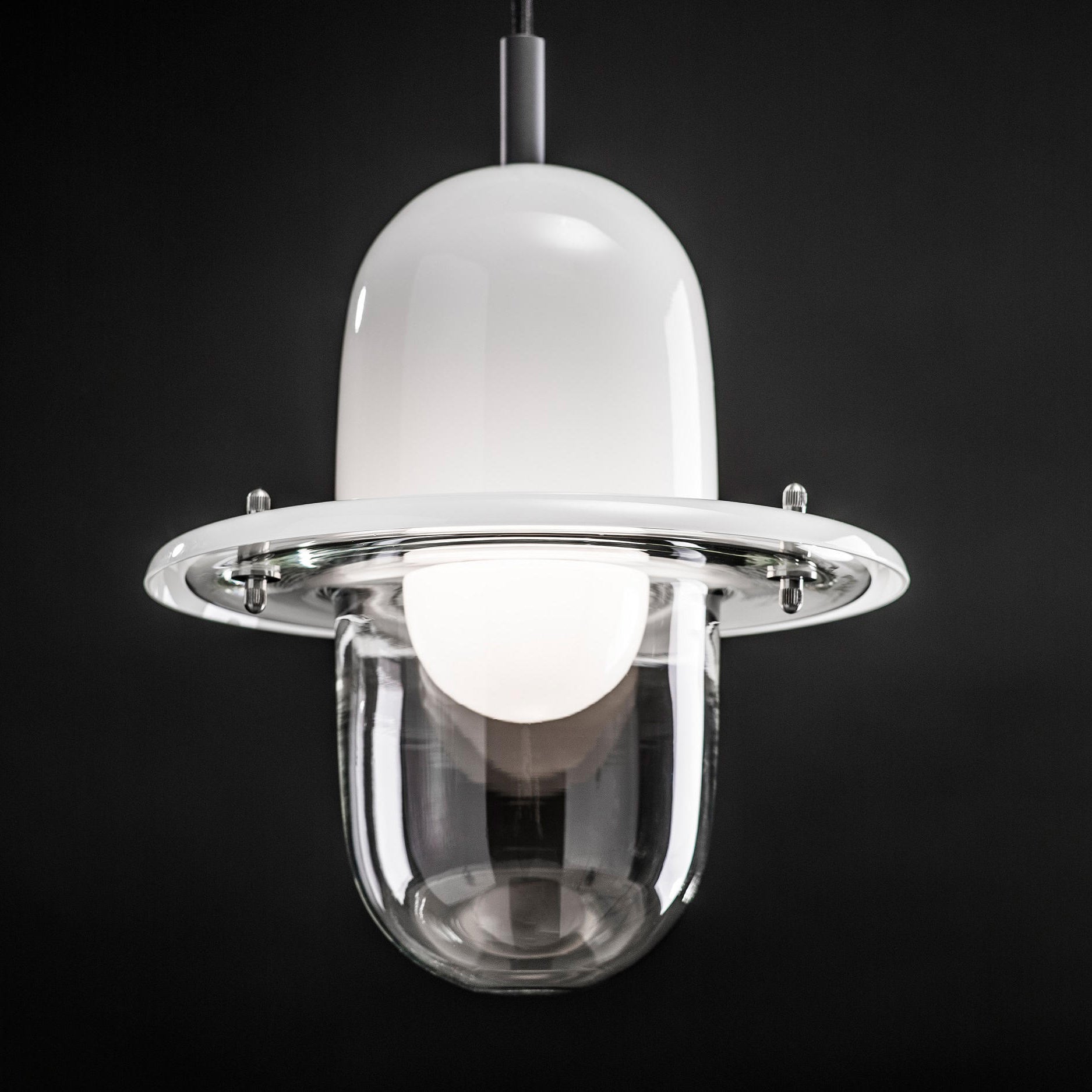 Inspired by industrial lighting and street lamps found in many European cities, the Hat pendant light combines practicality and simplicity with a humourous hint at the traditional, Victorian bowler hat. Its transparent or colored glass topper illuminates the ceiling, whilst the clear bottom portion is starkly utilitarian. Hats' upper and lower components are connected by three industrial-style, custom screws, and, inside, a translucent light bulb softens and evenly distributes the light. Hats pendant lights are ideal for small interiors and are also suitable to be combined into groups.