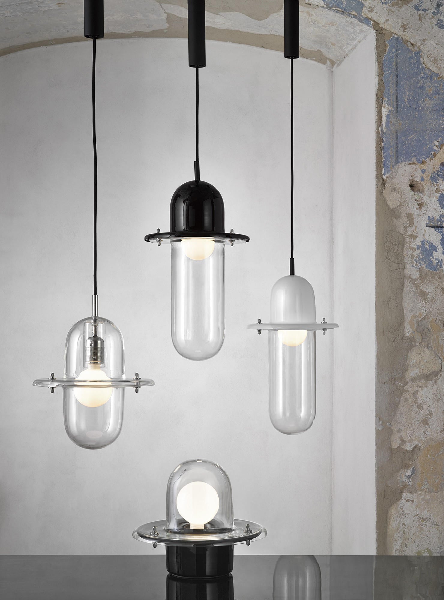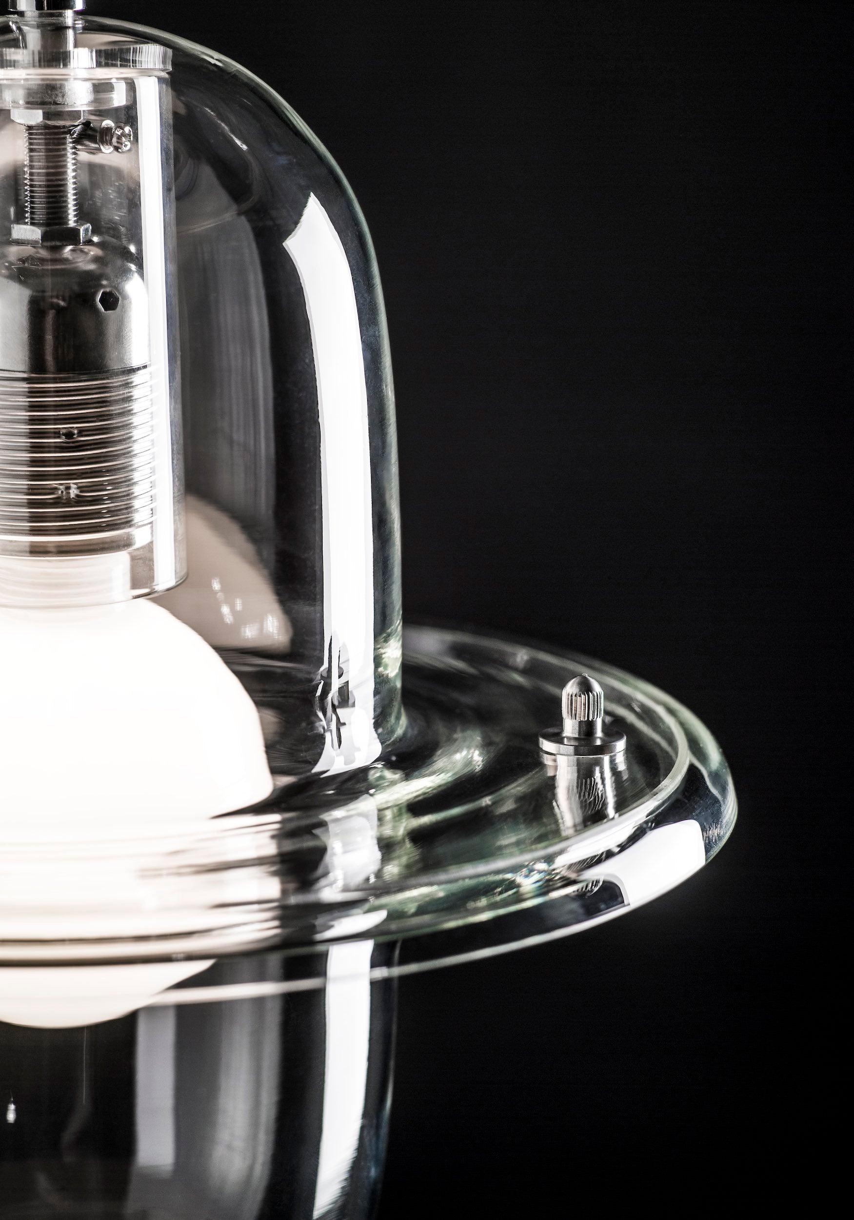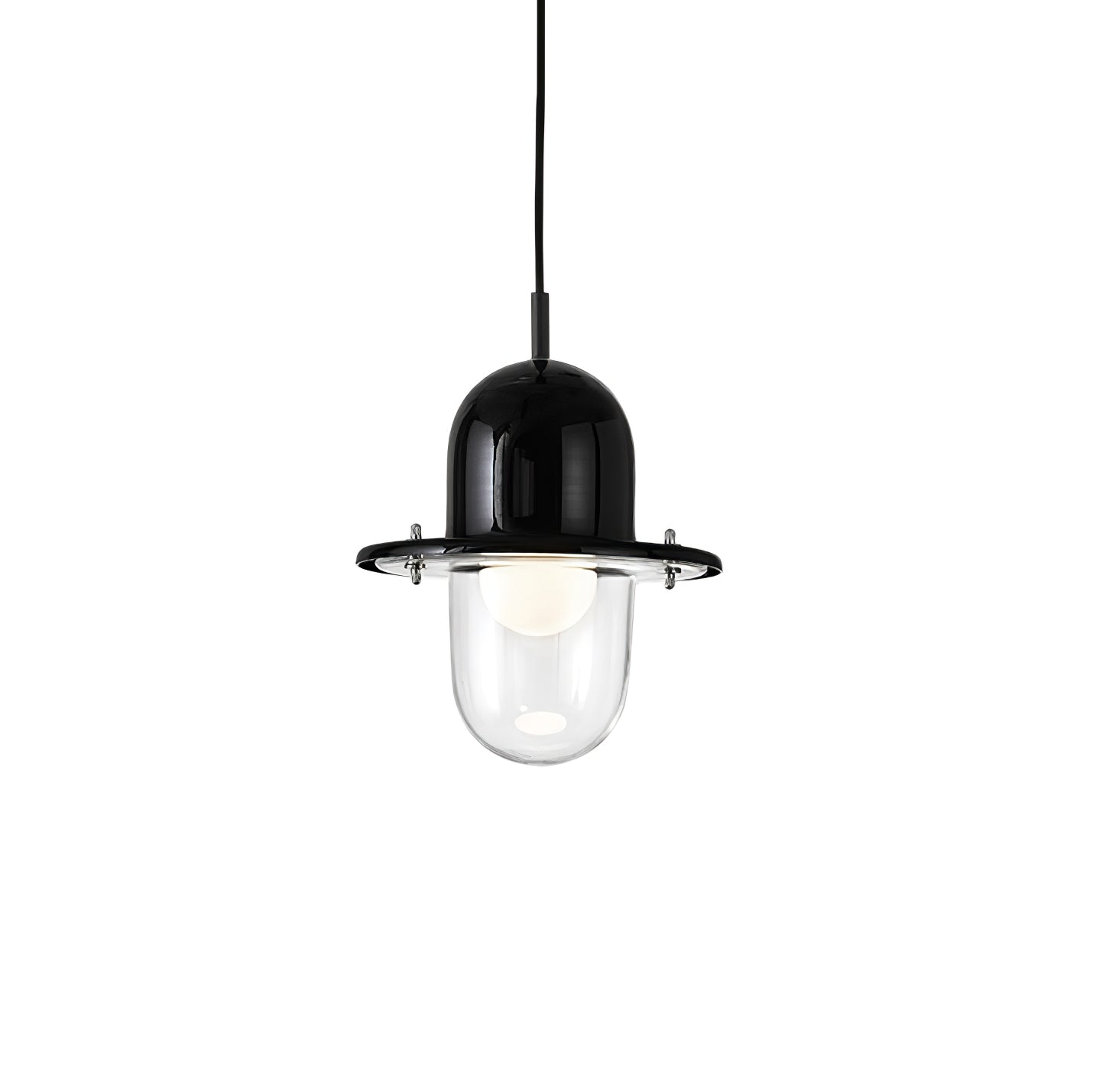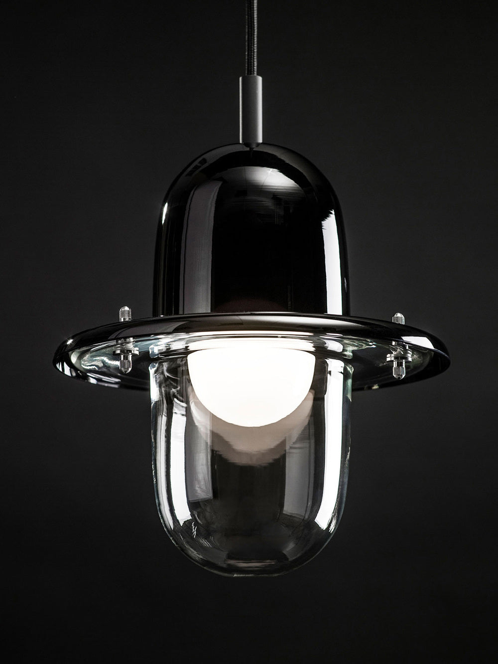 Inspired by industrial lighting and street lamps found in many European cities, the Hat pendant light combines practicality and simplicity with a humourous hint at the traditional, Victorian bowler hat. Its transparent or colored glass topper illuminates the ceiling, whilst the clear bottom portion is starkly utilitarian. Hats' upper and lower components are connected by three industrial-style, custom screws, and, inside, a translucent light bulb softens and evenly distributes the light. Hats pendant lights are ideal for small interiors and are also suitable to be combined into groups.