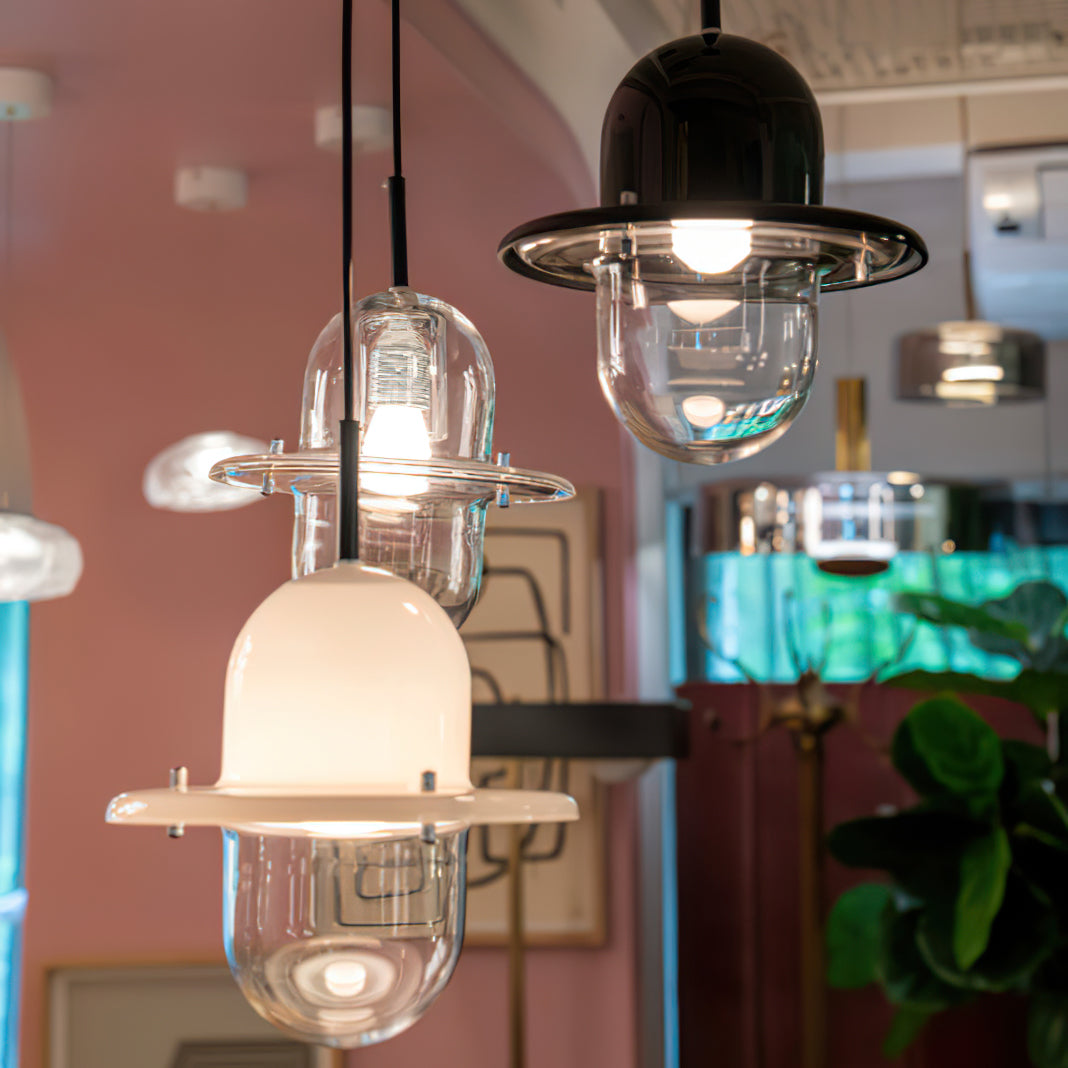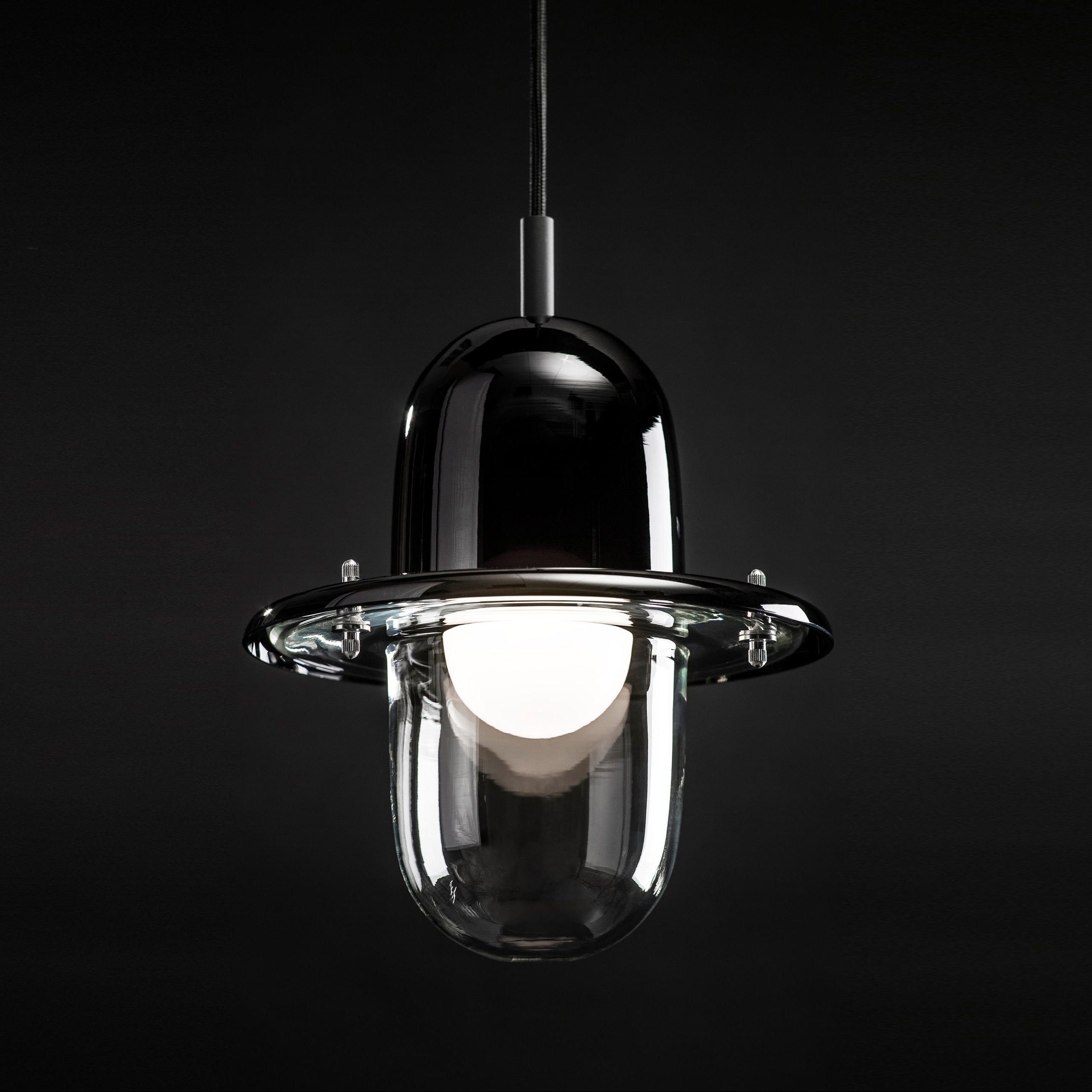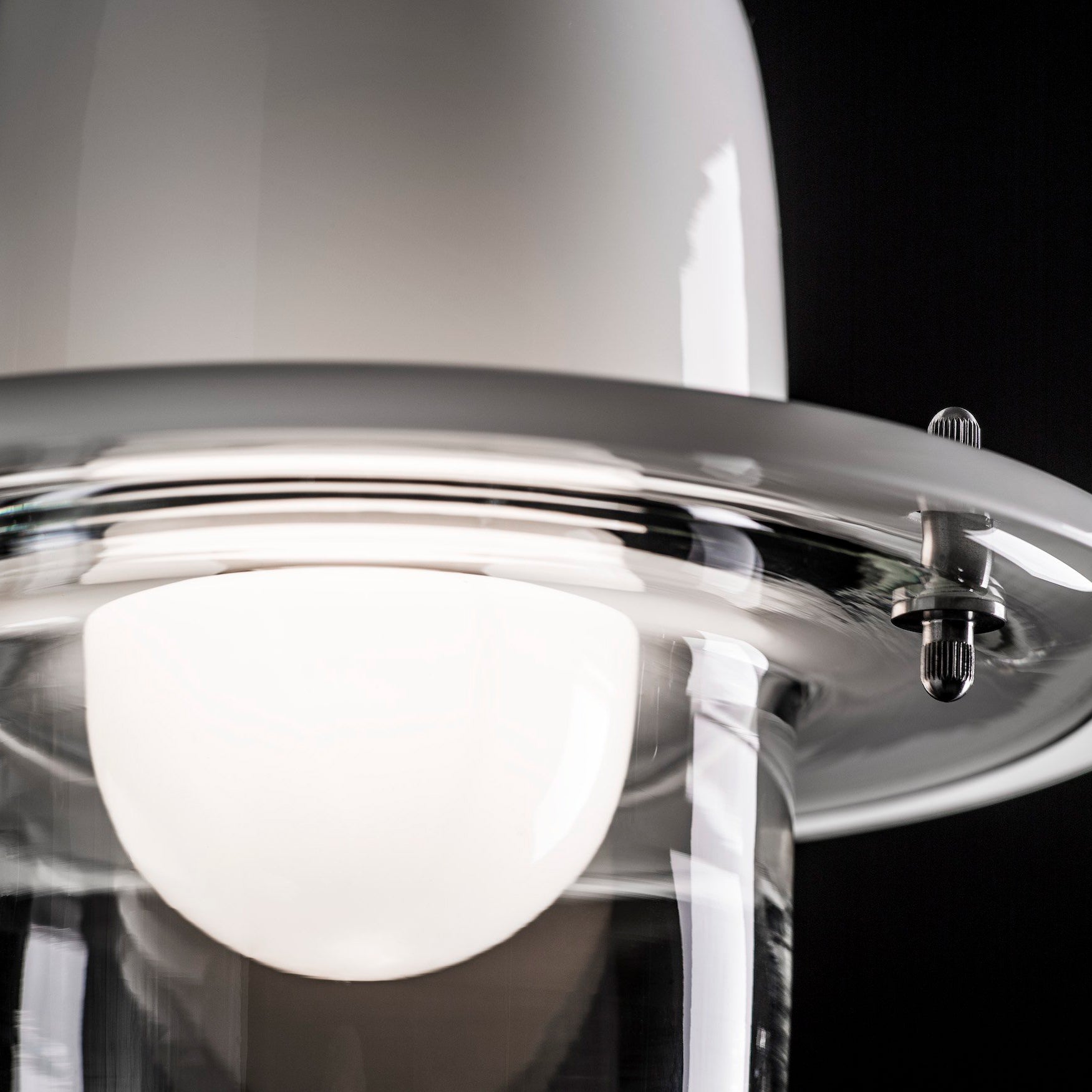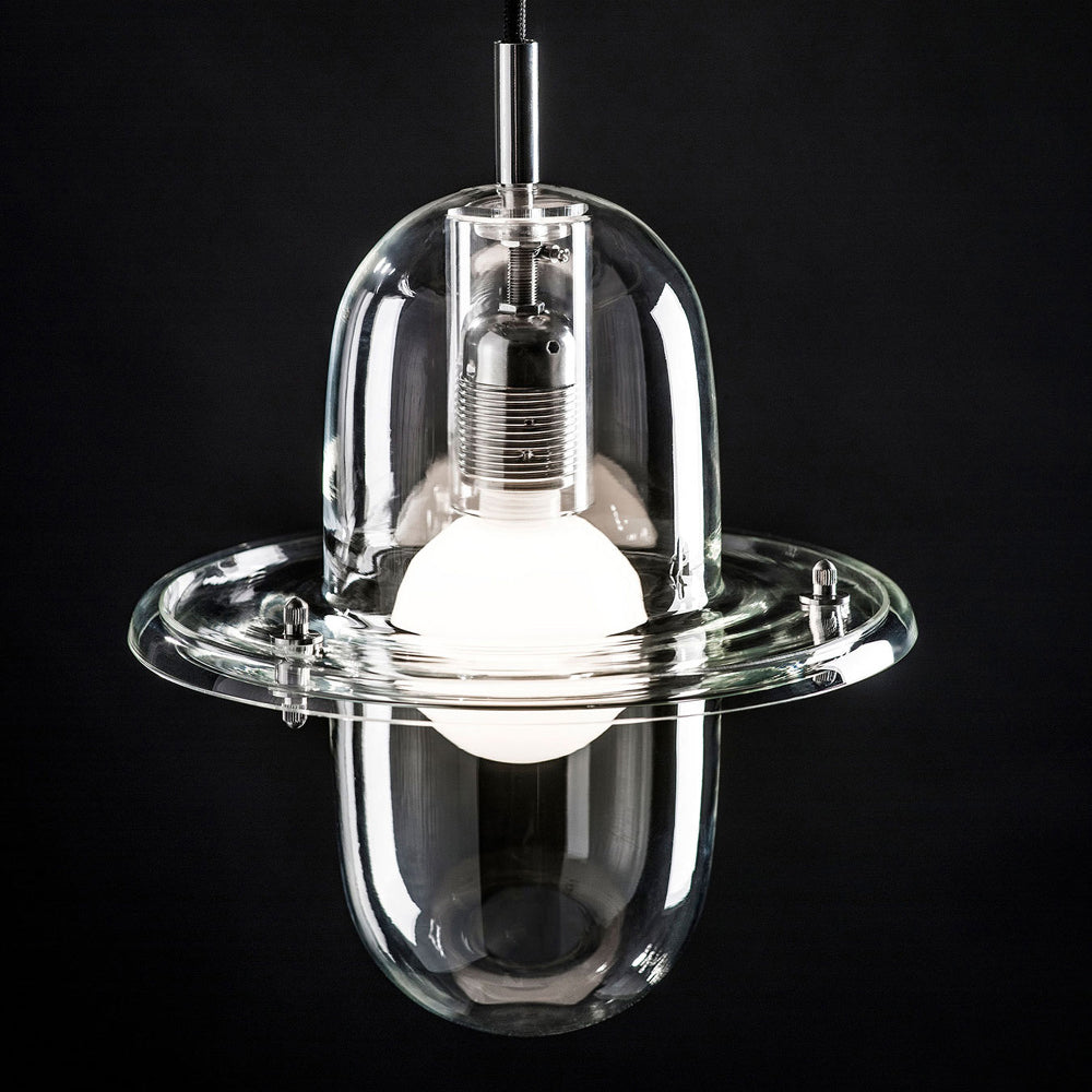 Inspired by industrial lighting and street lamps found in many European cities, the Hat pendant light combines practicality and simplicity with a humourous hint at the traditional, Victorian bowler hat. Its transparent or colored glass topper illuminates the ceiling, whilst the clear bottom portion is starkly utilitarian. Hats' upper and lower components are connected by three industrial-style, custom screws, and, inside, a translucent light bulb softens and evenly distributes the light. Hats pendant lights are ideal for small interiors and are also suitable to be combined into groups.