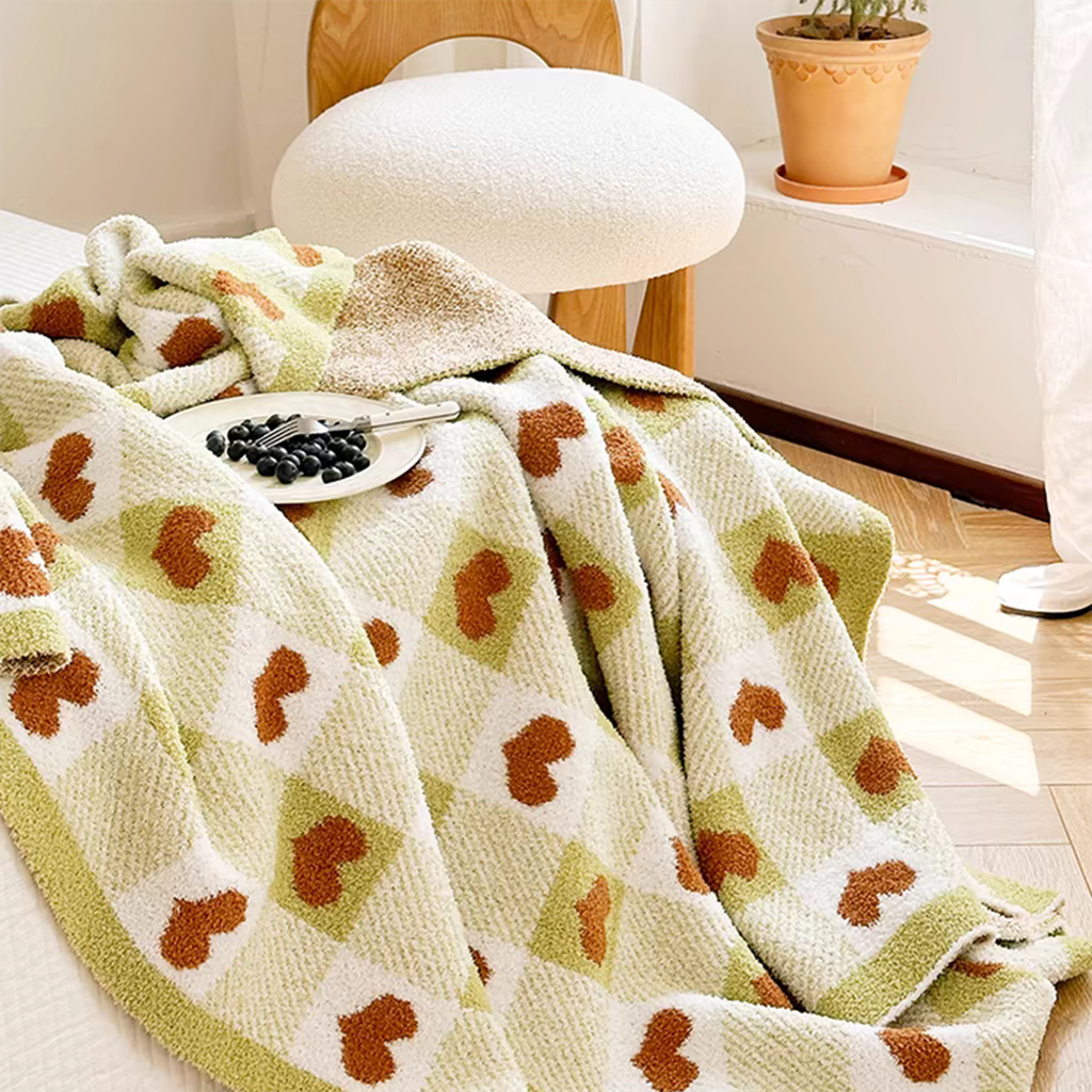 Dive into a world where coziness meets charm! The blanket features a playful checkerboard pattern interlaced with hearts. Ideal for cozy evenings, this piece is not just about warmth; it's a visual and tactile delight, designed to bring smiles and a sense of joy.