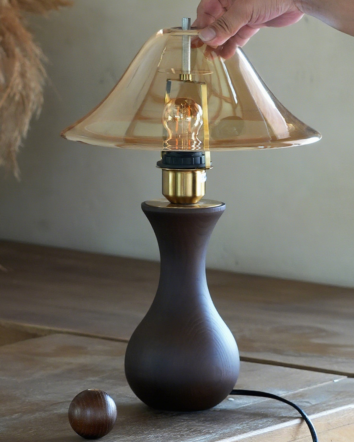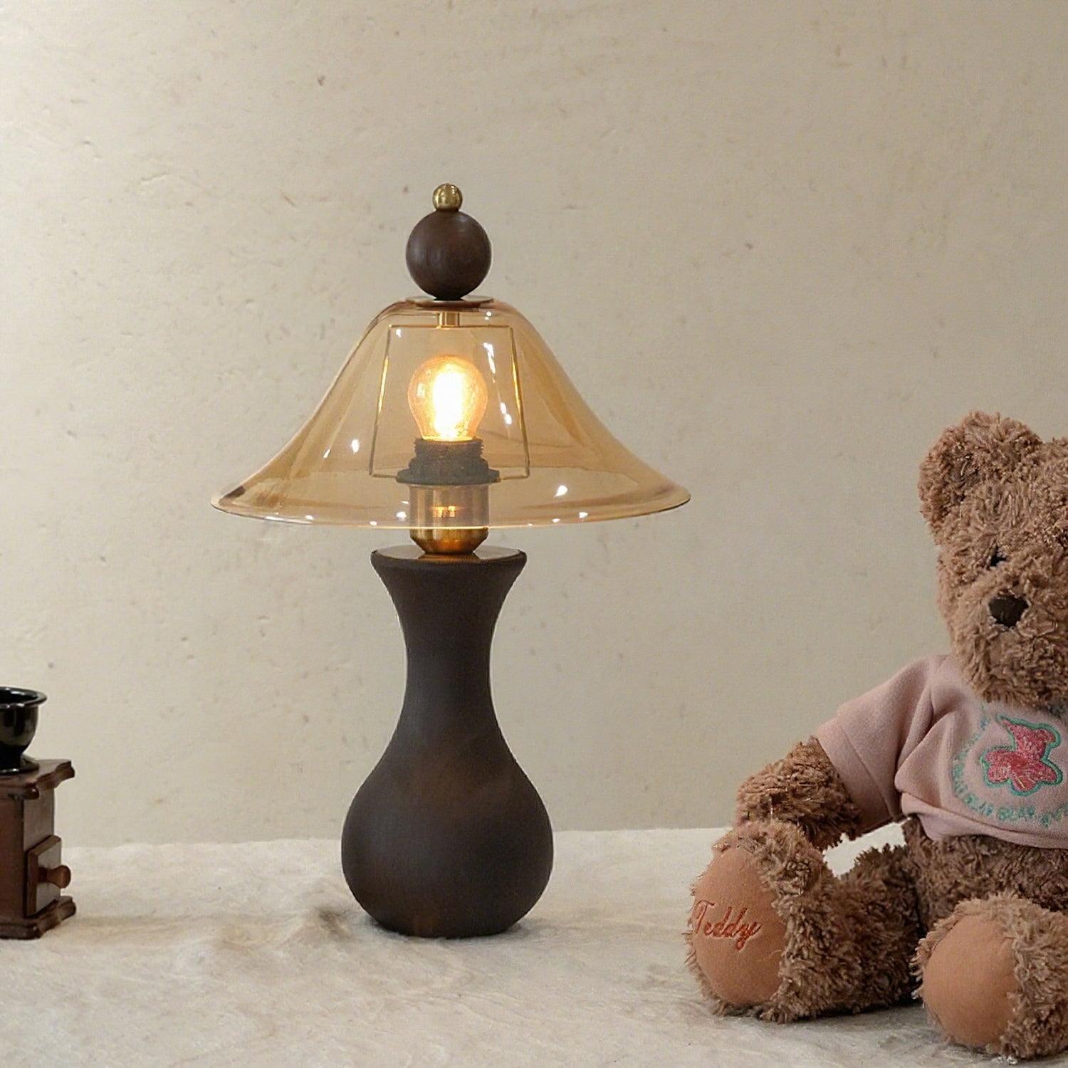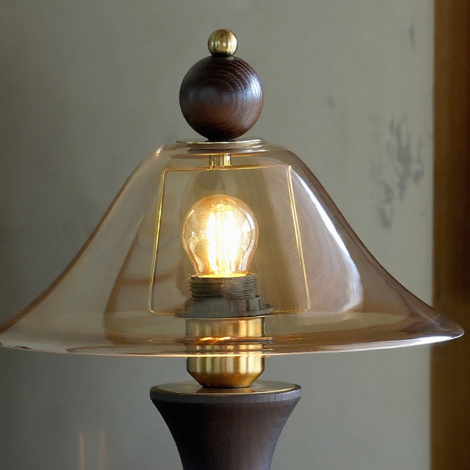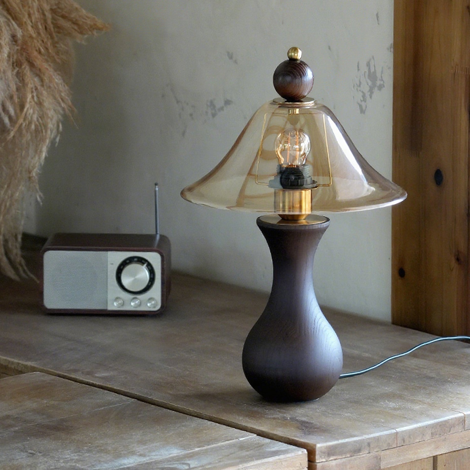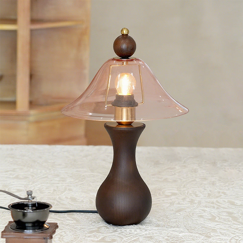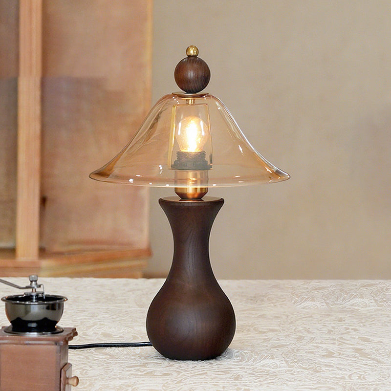 The Homark Table Lamp by Mooijane pairs a smooth wooden base with a amber glass shade, blending natural warmth with refined elegance. Its curved, vase-like design adds stability and craftsmanship, while the flowing glass diffuses a soft, inviting glow.