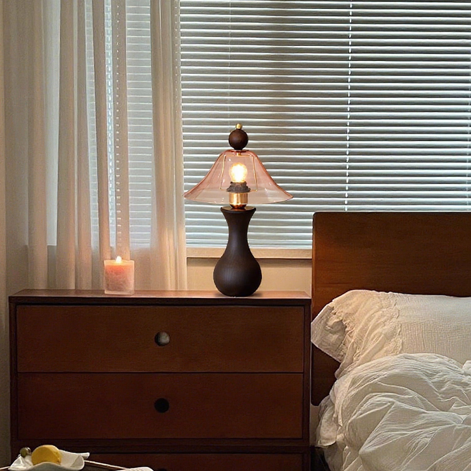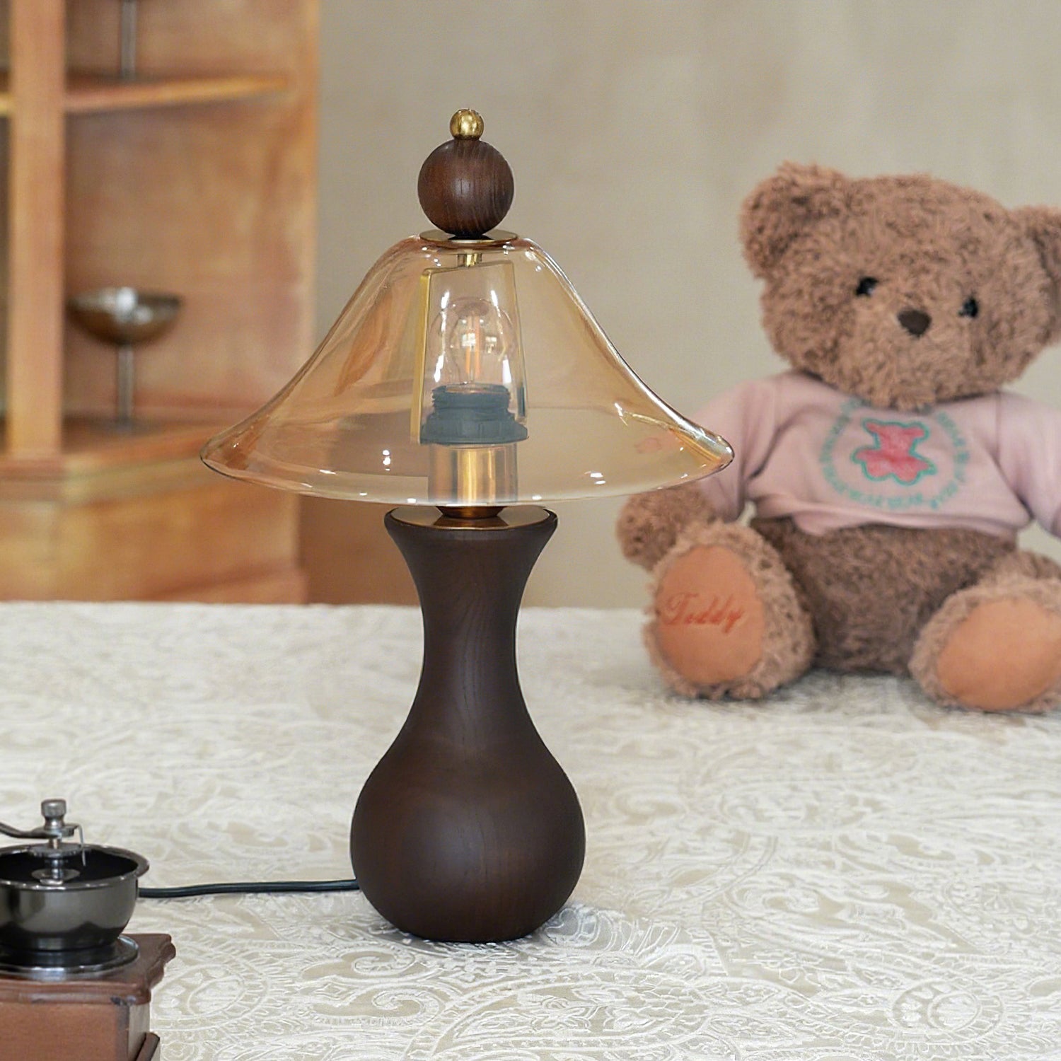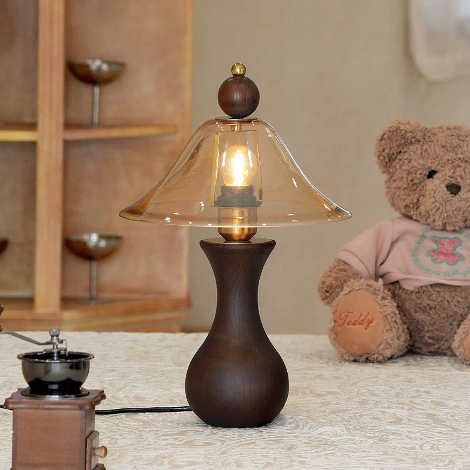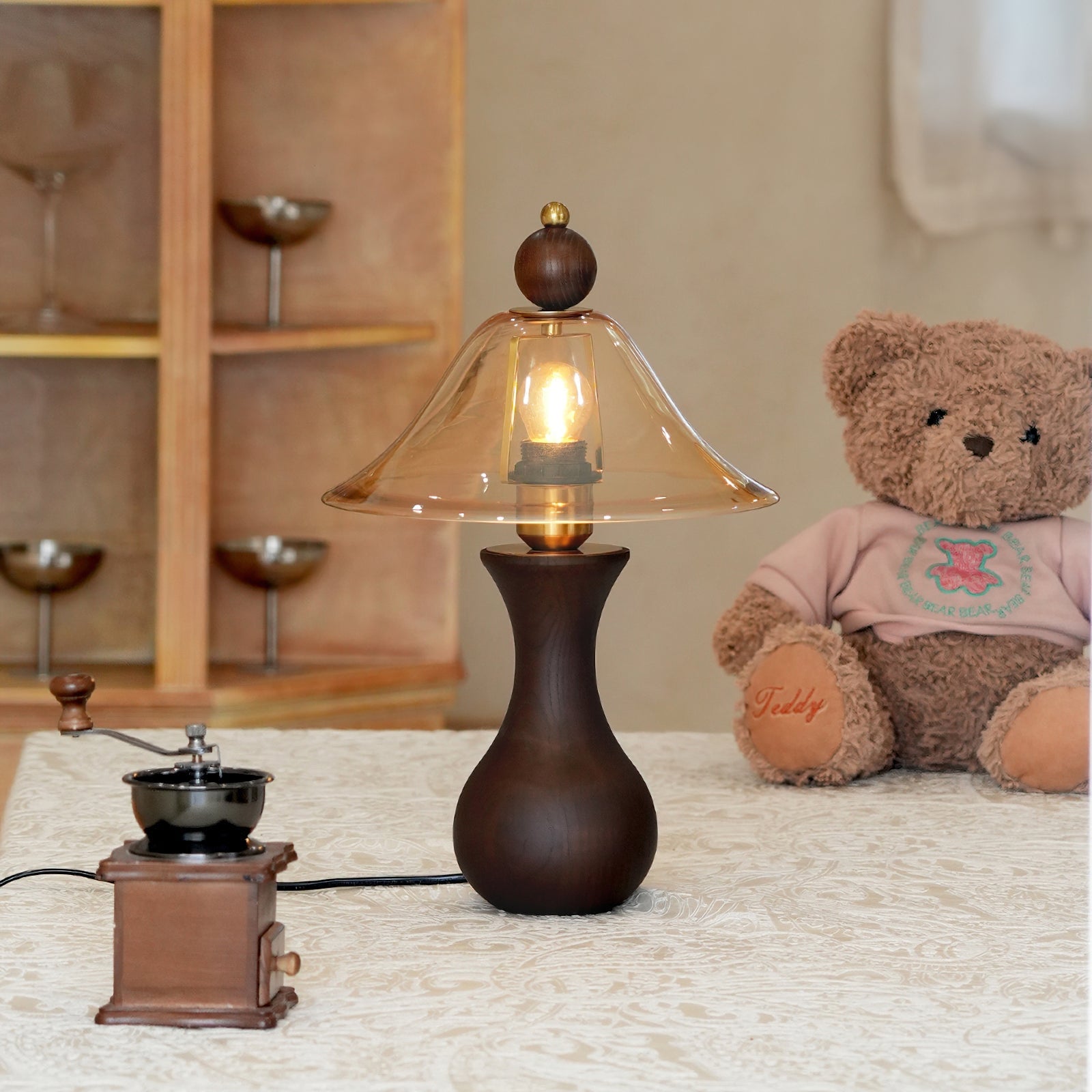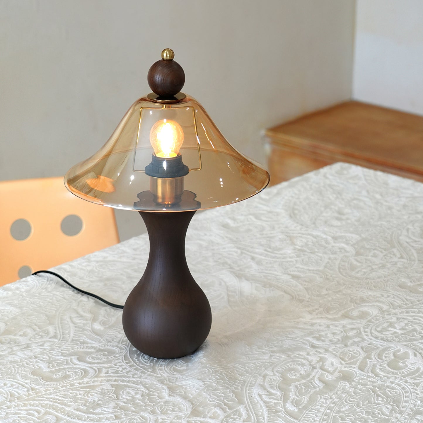 The Homark Table Lamp by Mooijane pairs a smooth wooden base with a amber glass shade, blending natural warmth with refined elegance. Its curved, vase-like design adds stability and craftsmanship, while the flowing glass diffuses a soft, inviting glow.