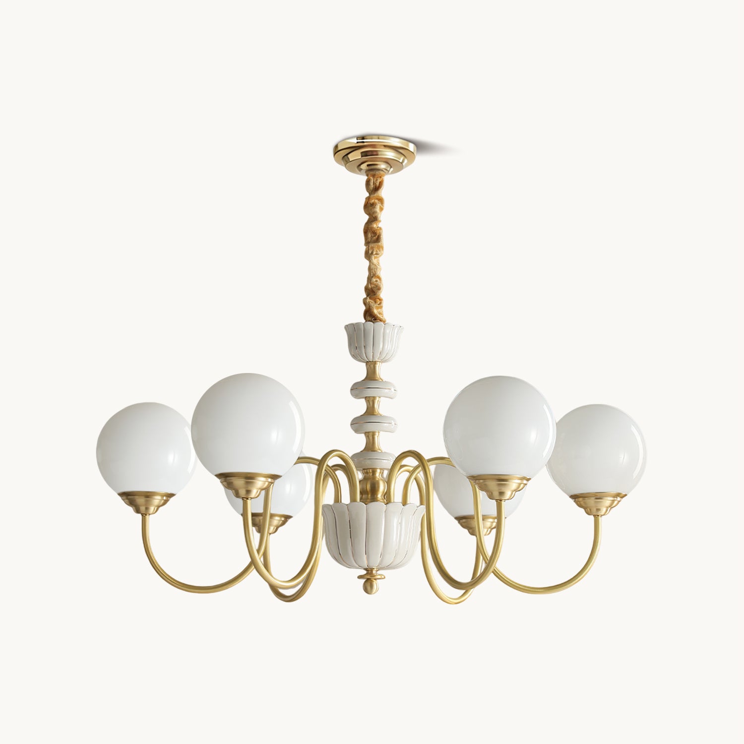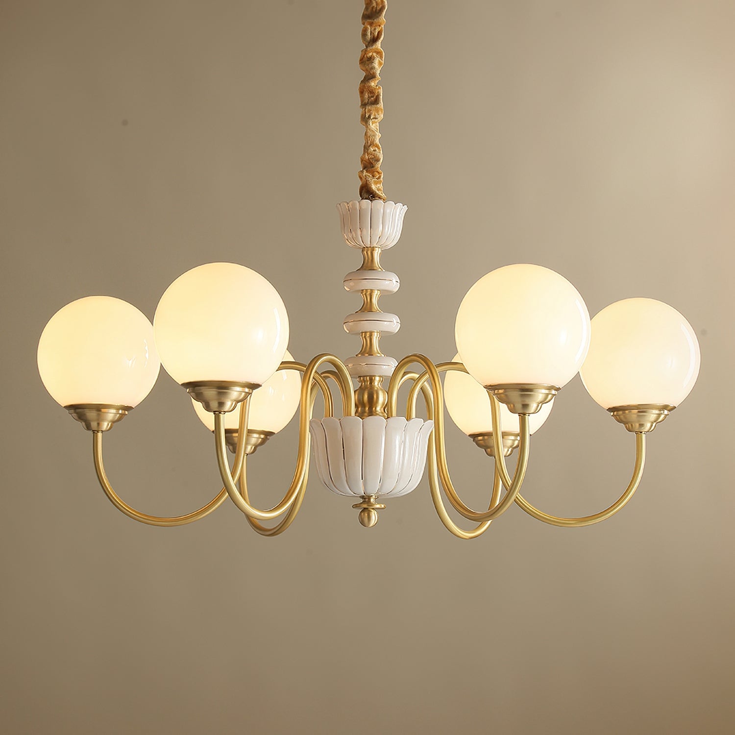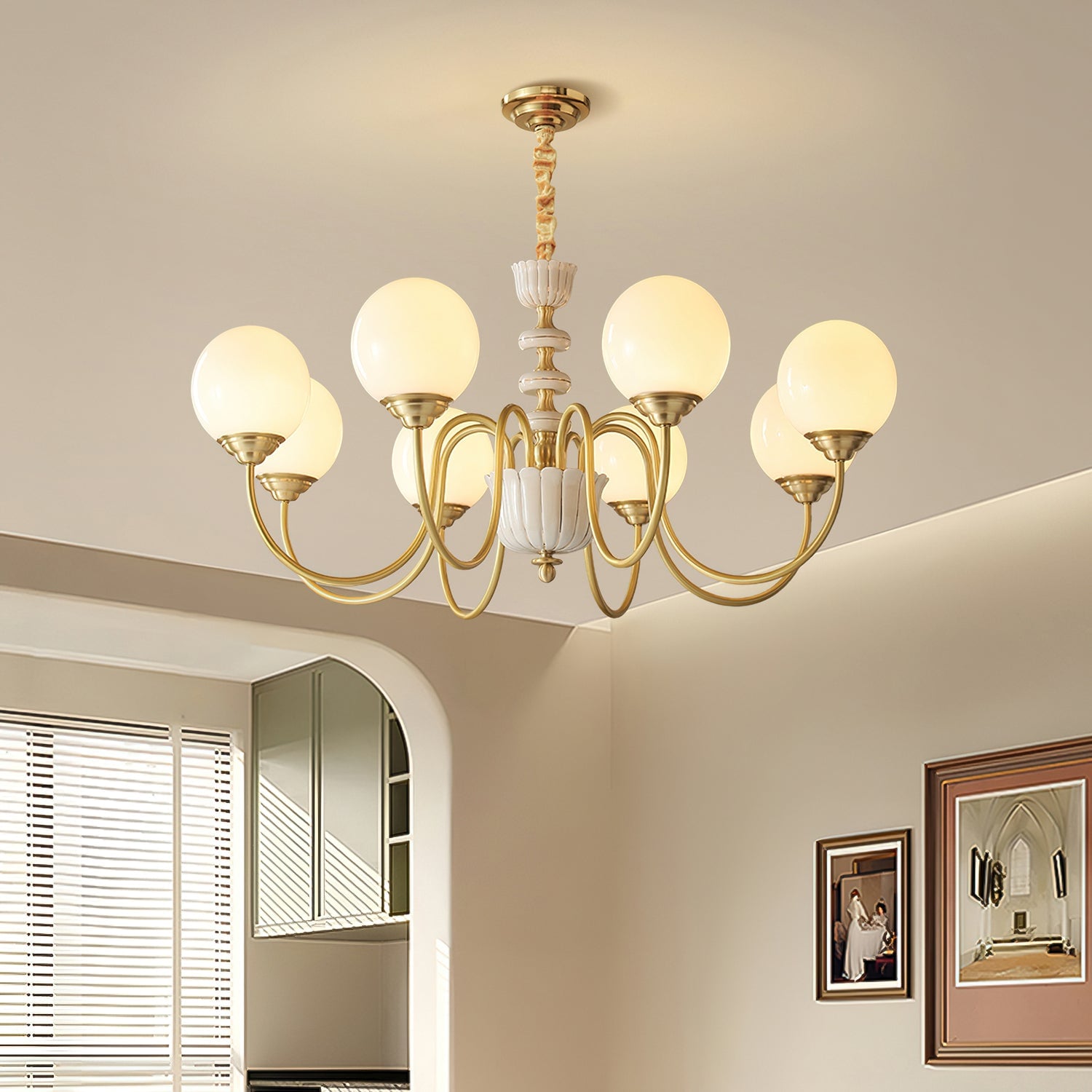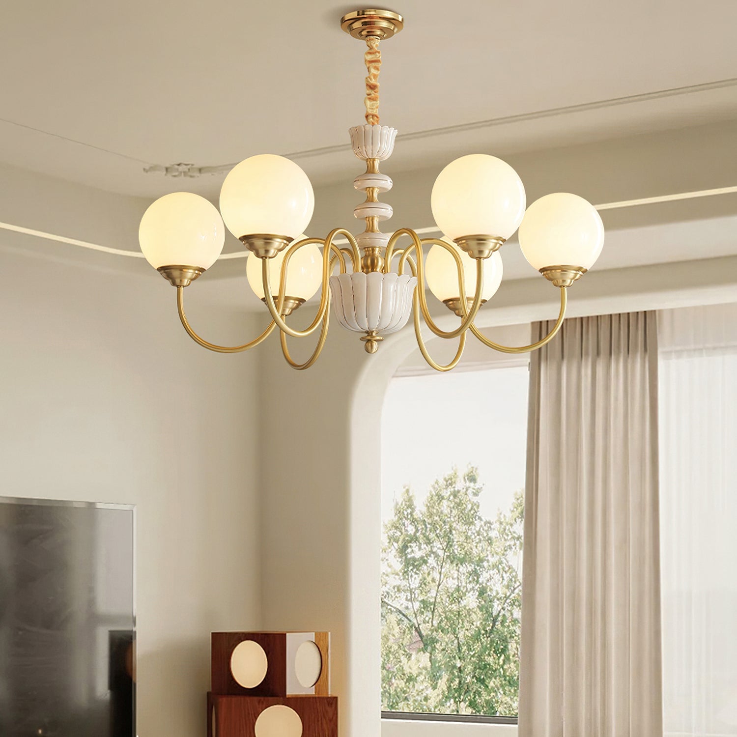 The Homdiy Chandelier from Mooijane blends classic elegance with contemporary ease. Curved satin-brass arms support opal-glass globes for a warm, even glow, while the central column features hand-glazed porcelain with subtle gold pinstripes and a scalloped finial. Ideal for dining rooms, living areas, or bedrooms, it serves as a sophisticated and approachable statement piece.