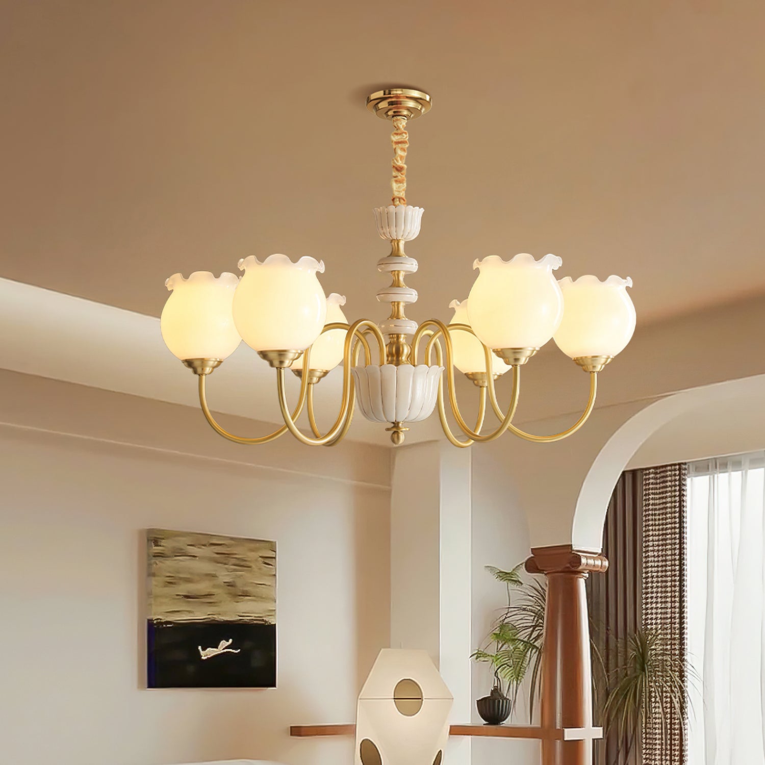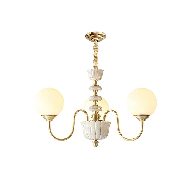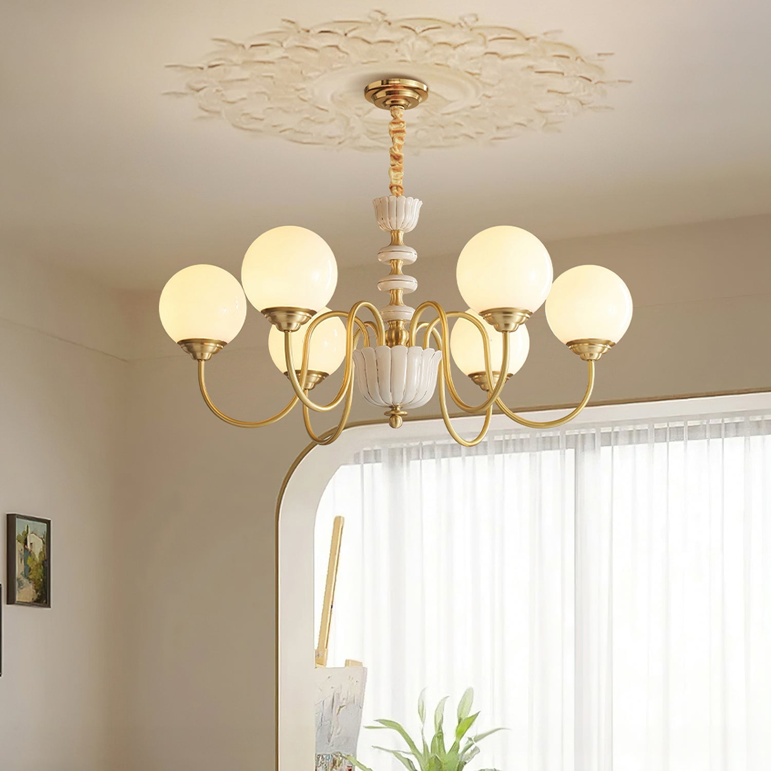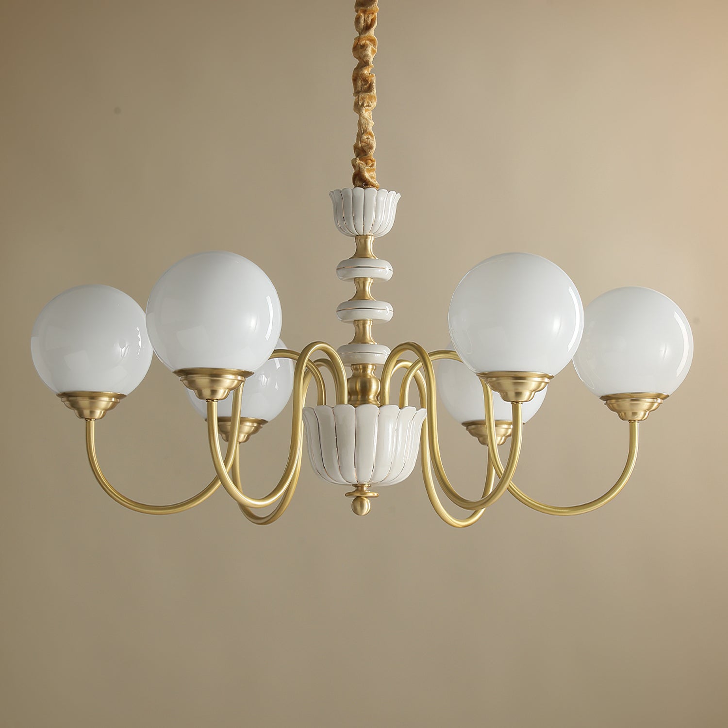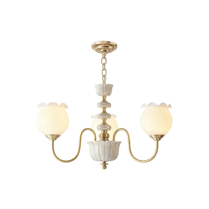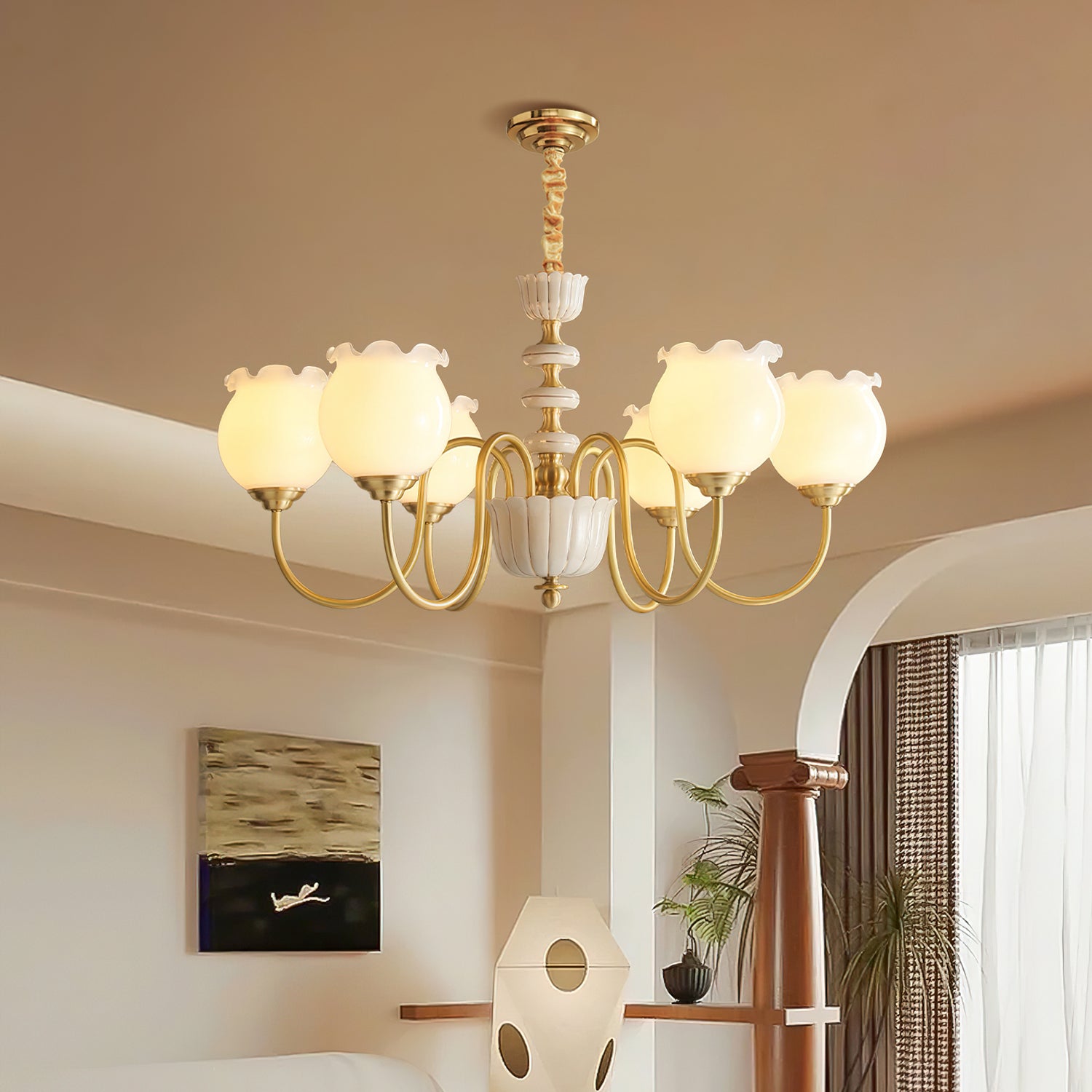 The Homdiy Chandelier from Mooijane blends classic elegance with contemporary ease. Curved satin-brass arms support opal-glass globes for a warm, even glow, while the central column features hand-glazed porcelain with subtle gold pinstripes and a scalloped finial. Ideal for dining rooms, living areas, or bedrooms, it serves as a sophisticated and approachable statement piece.