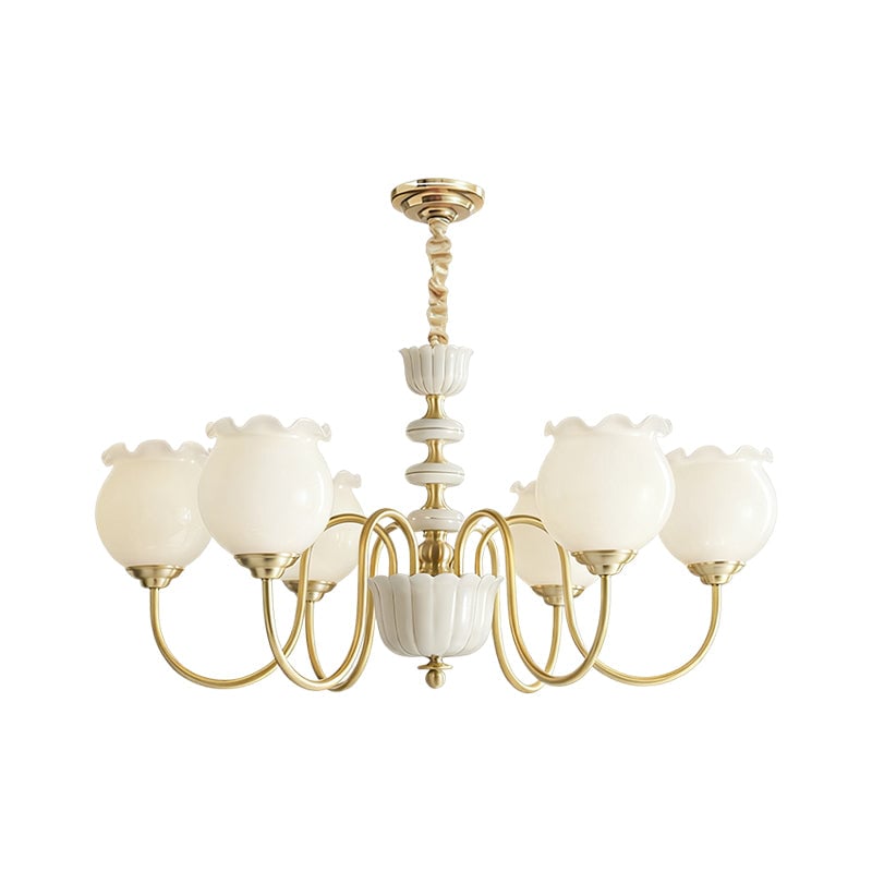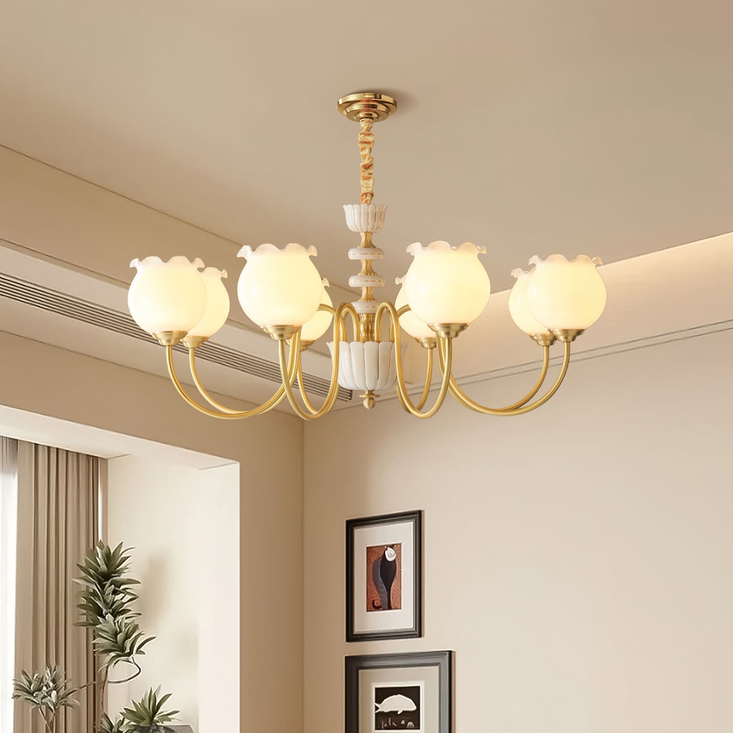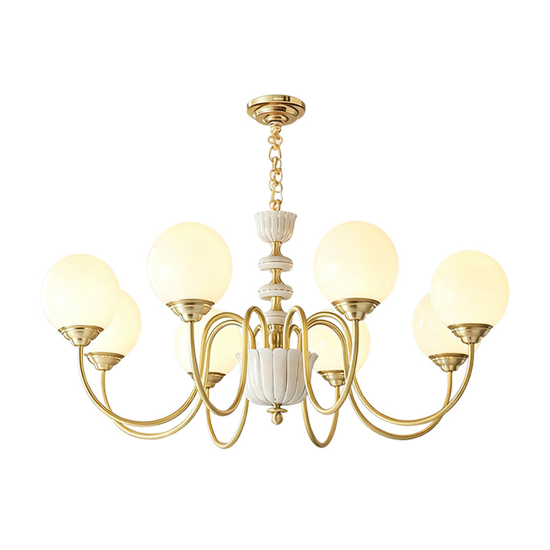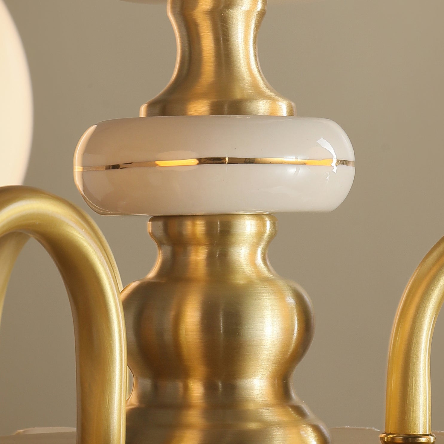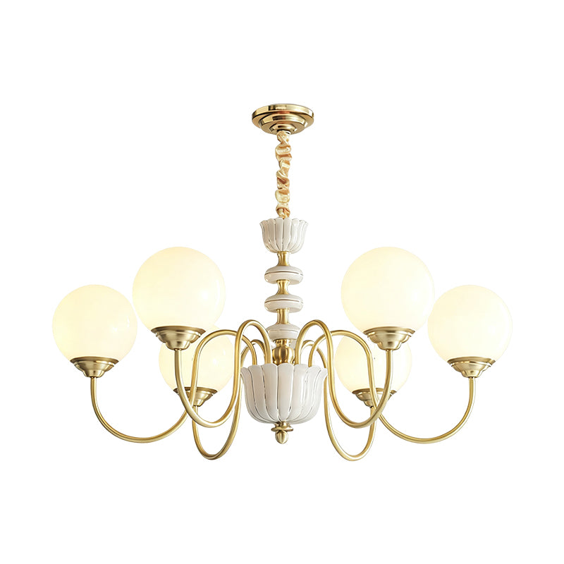 The Homdiy Chandelier from Mooijane blends classic elegance with contemporary ease. Curved satin-brass arms support opal-glass globes for a warm, even glow, while the central column features hand-glazed porcelain with subtle gold pinstripes and a scalloped finial. Ideal for dining rooms, living areas, or bedrooms, it serves as a sophisticated and approachable statement piece.
