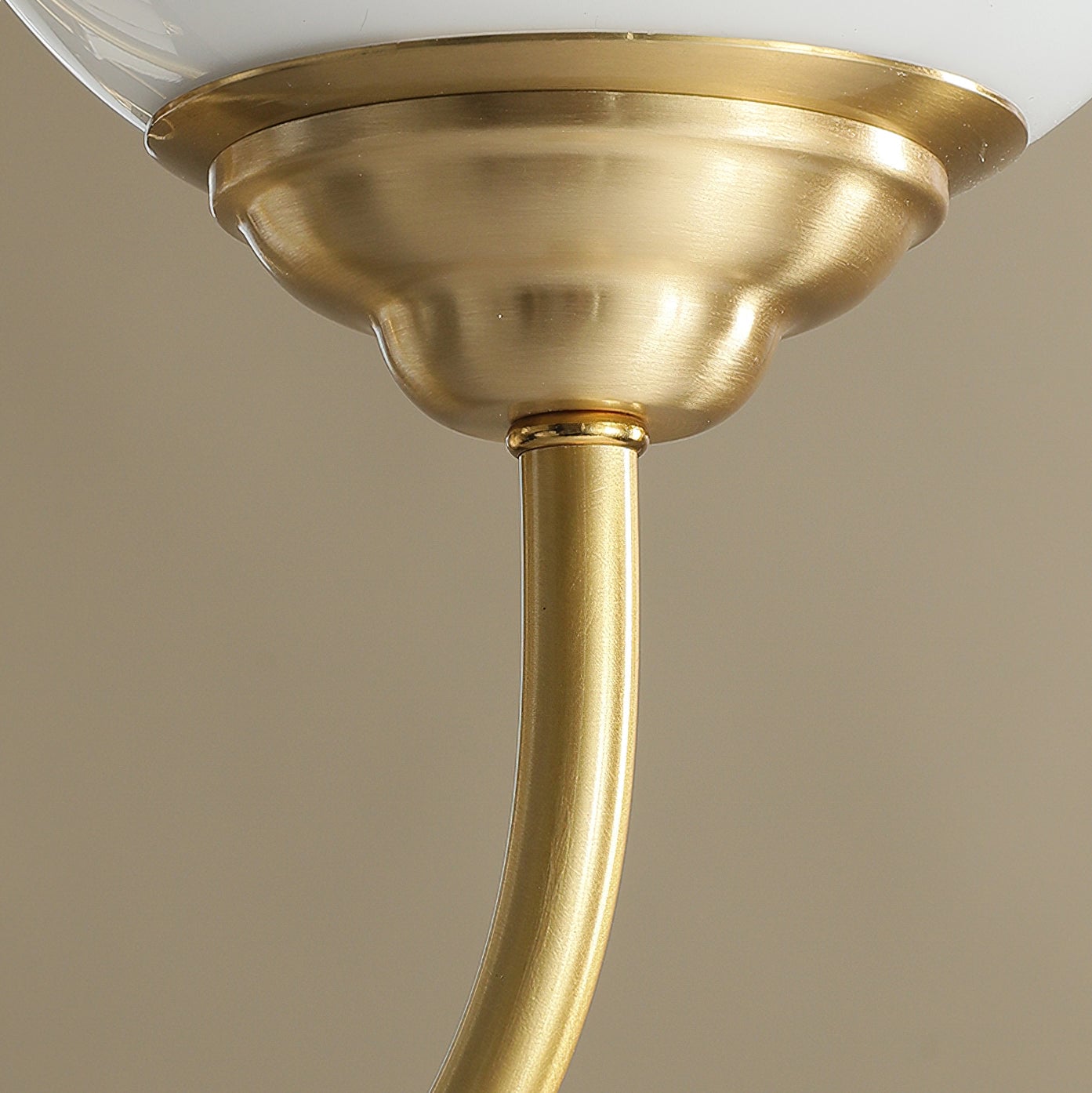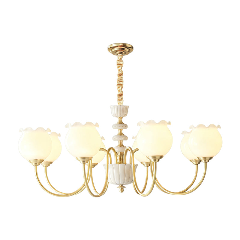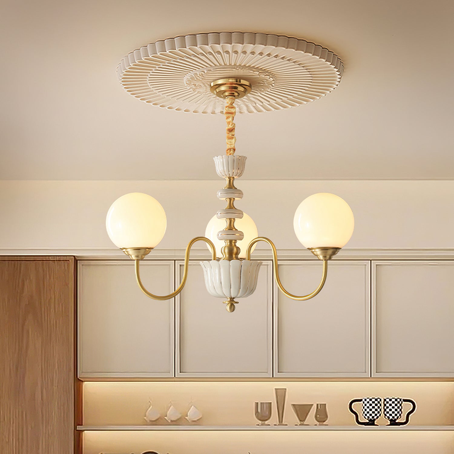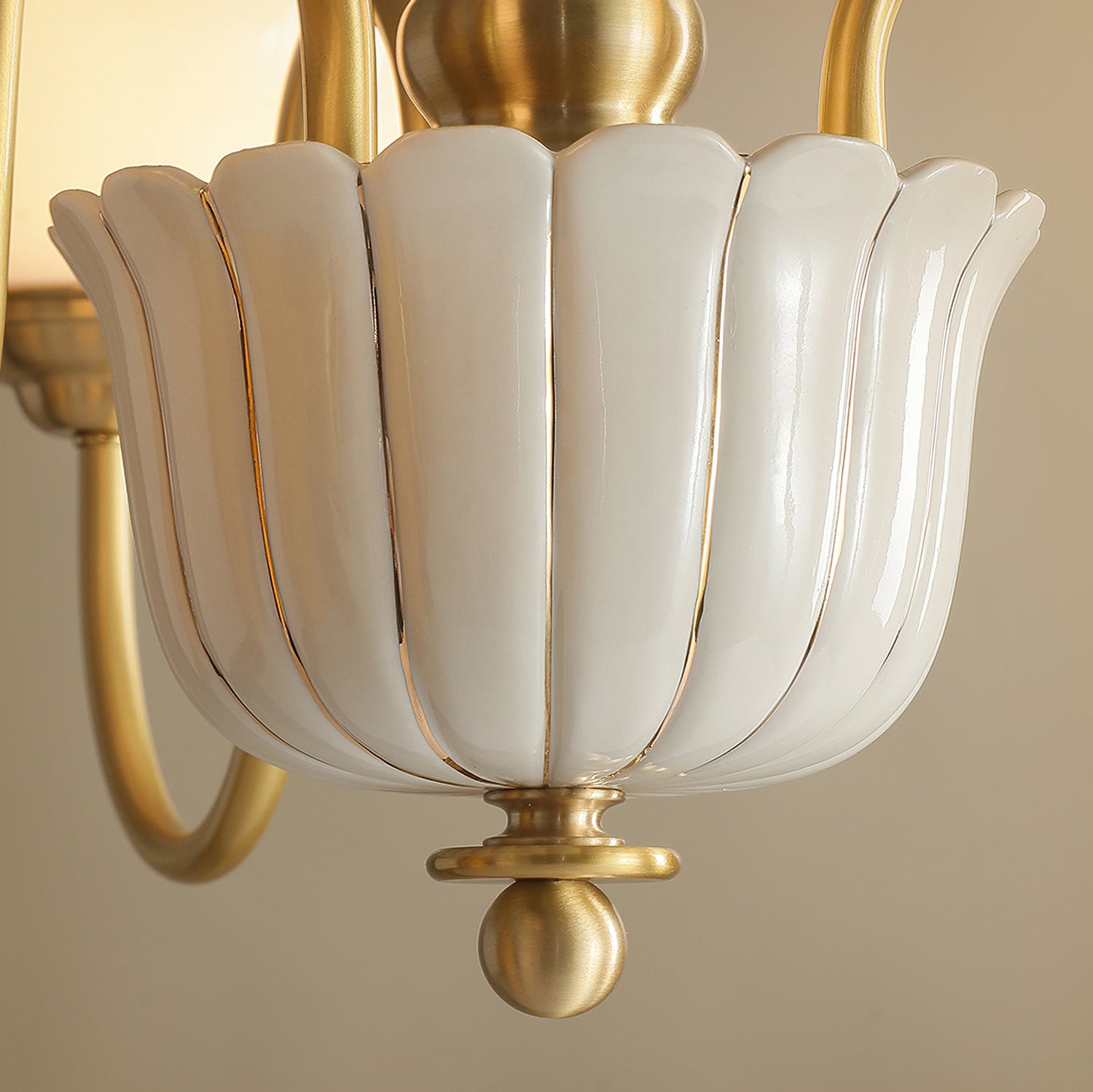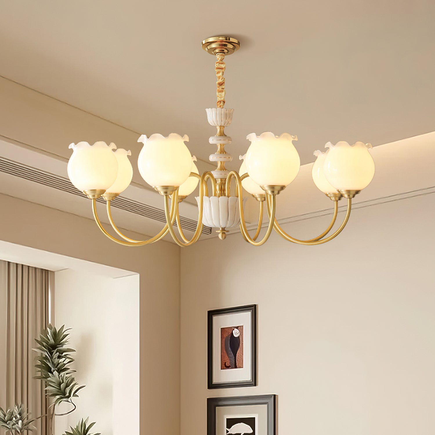 The Homdiy Chandelier from Mooijane blends classic elegance with contemporary ease. Curved satin-brass arms support opal-glass globes for a warm, even glow, while the central column features hand-glazed porcelain with subtle gold pinstripes and a scalloped finial. Ideal for dining rooms, living areas, or bedrooms, it serves as a sophisticated and approachable statement piece.