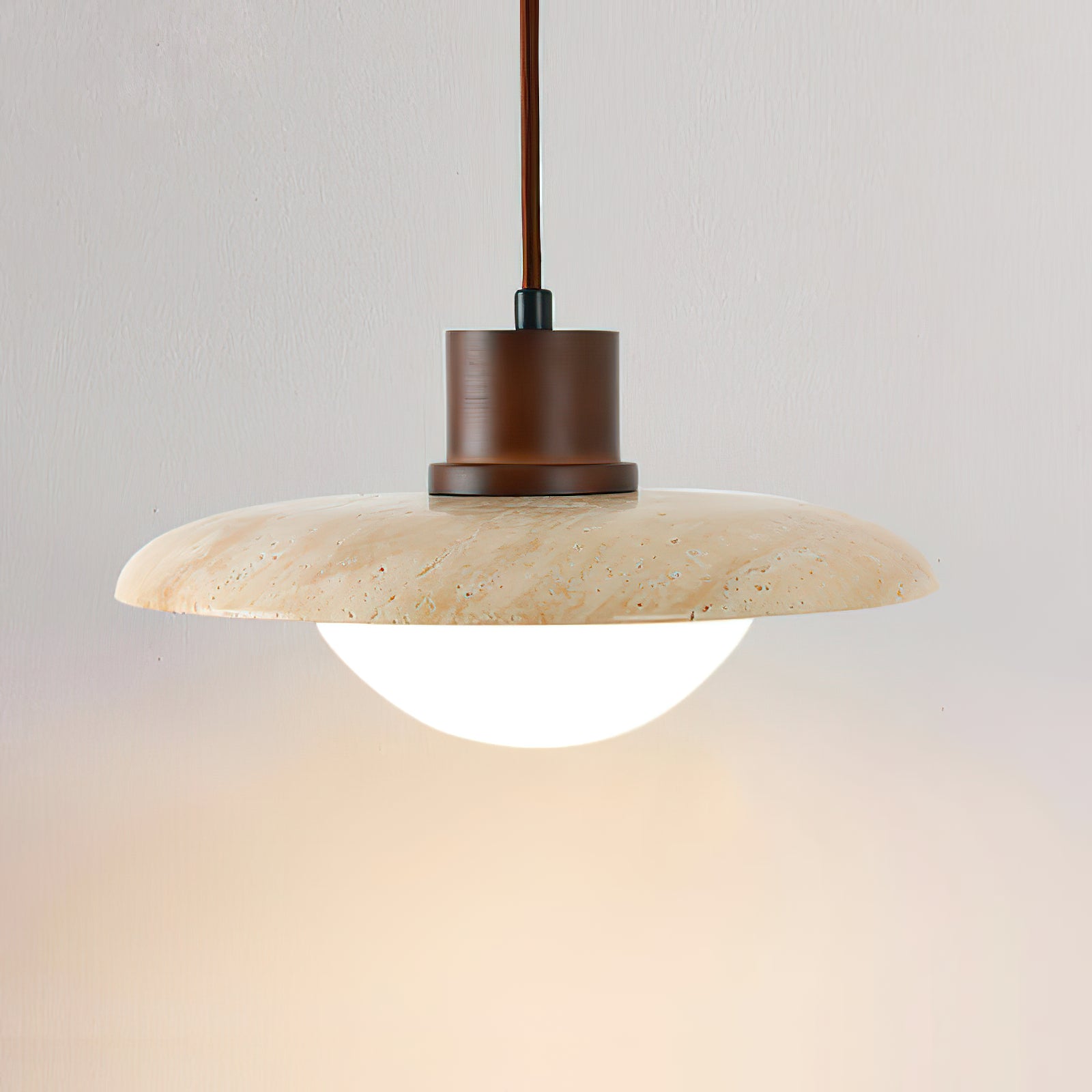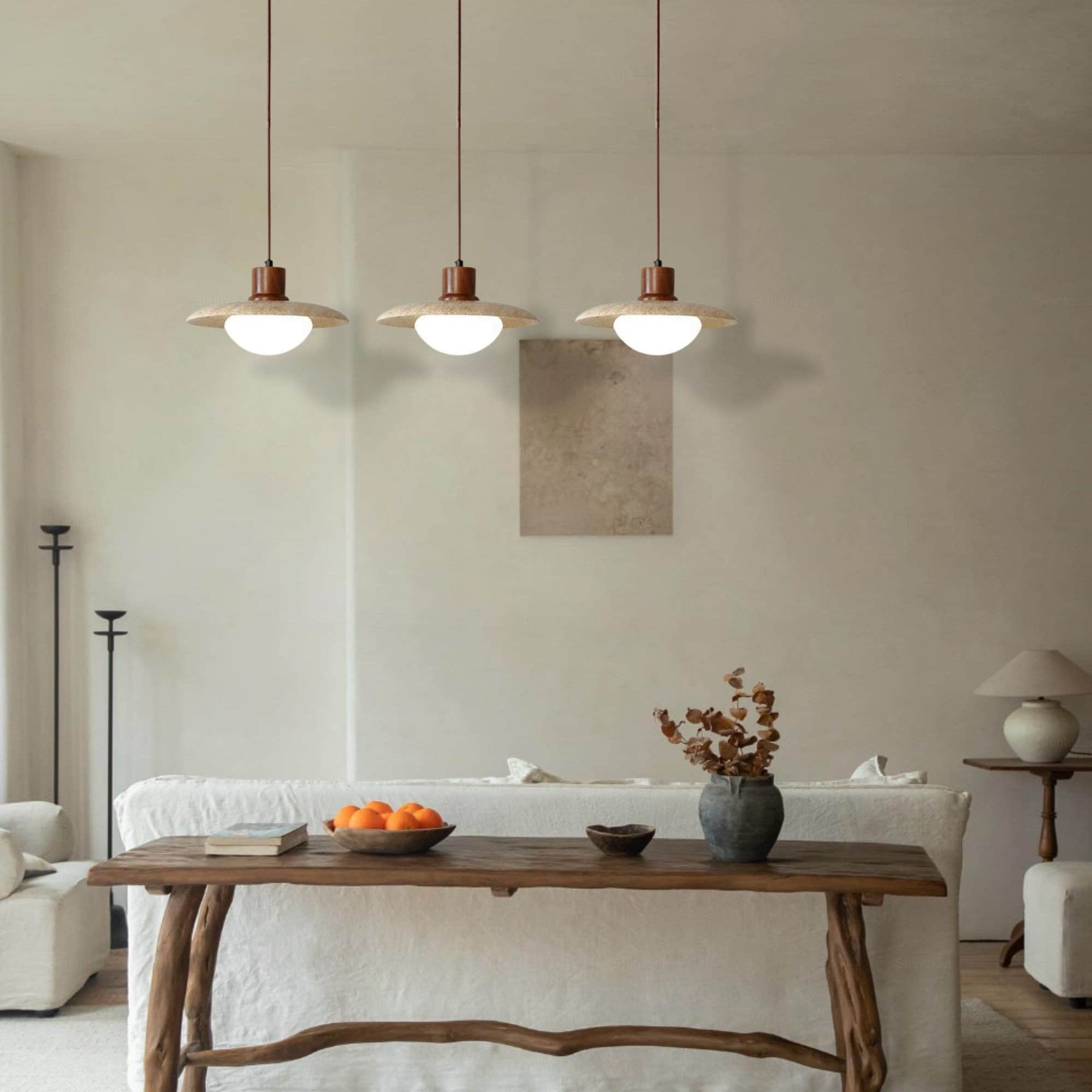 The Japanese Modern Travertine Hanging Light combines minimalist design with natural elegance, inspired by Japanese aesthetics. Its wide travertine stone disc serves as a shade, featuring earthy textures that contrast beautifully with the smooth, rounded glass diffuser below. This pendant light provides a warm, soft glow, perfect for creating a calming ambiance in living rooms, dining areas, or study spaces. The unique blend of natural stone and sleek design elements makes it an eye-catching piece for modern interiors that appreciate simplicity and natural beauty.