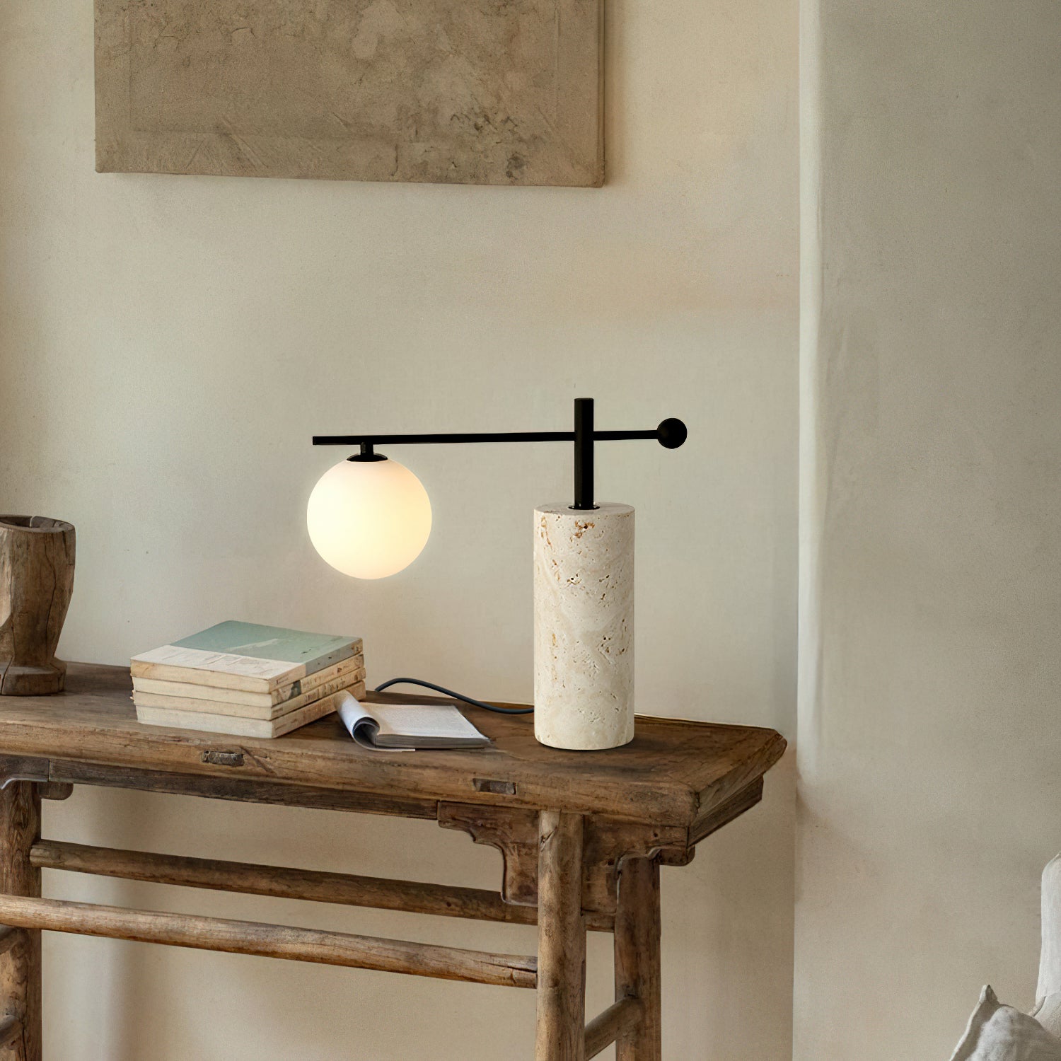 The Justine Table Lamp from Mooijane pairs warm yellow travertine with a softly glowing glass globe for a clean, modern expression. Its solid cylindrical stone base grounds the design, while a slim horizontal arm allows the round glass shade to float gracefully to one side. The contrast between the weight of the stone and the lightness of the glass creates a calm, gallery-inspired presence.