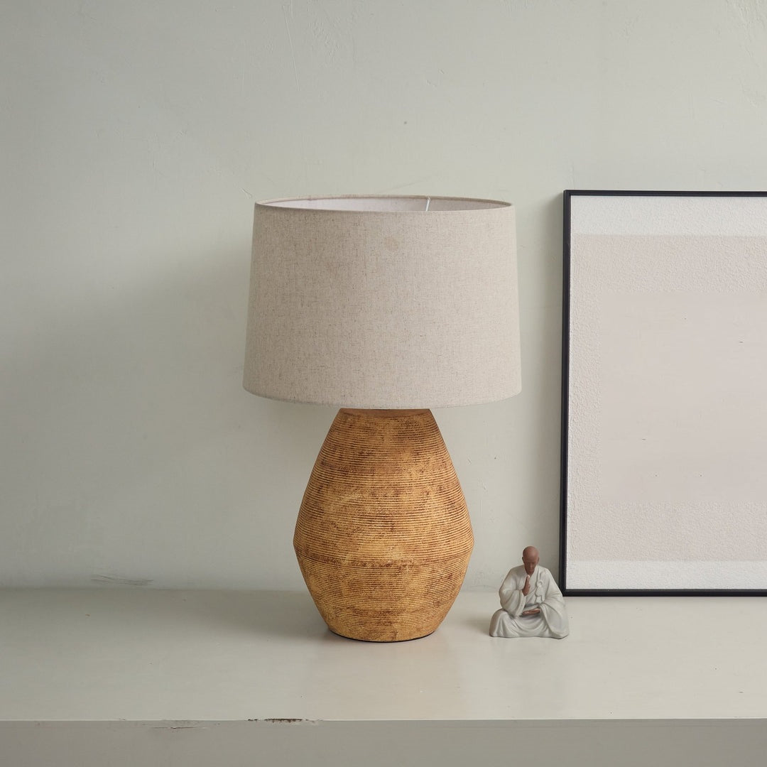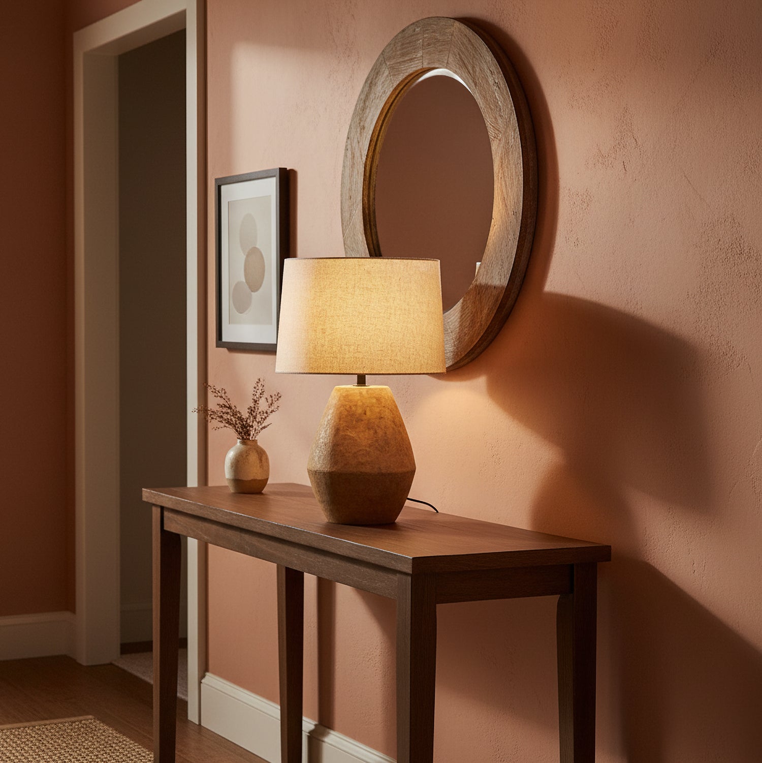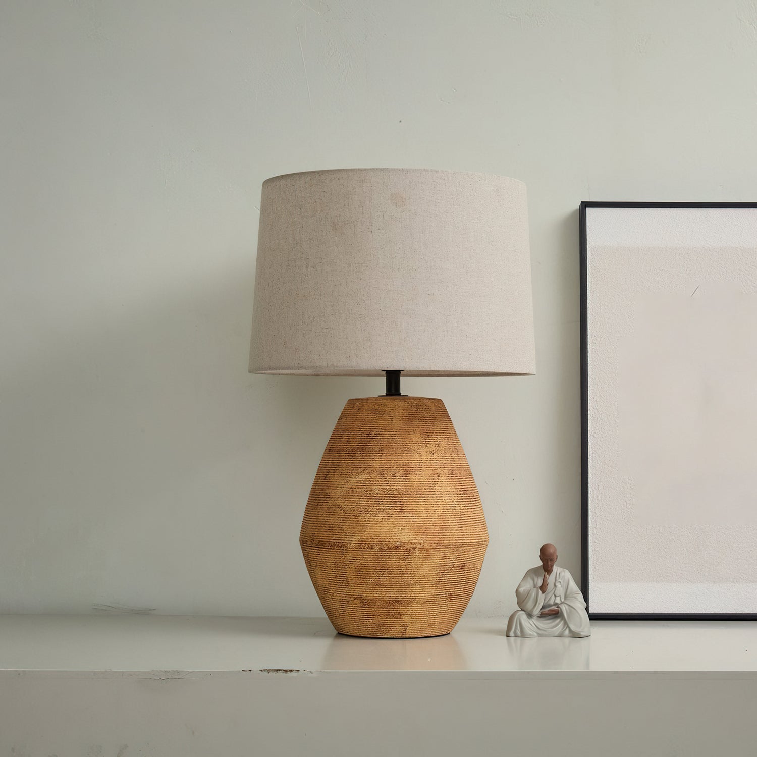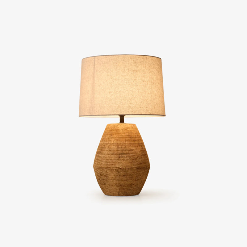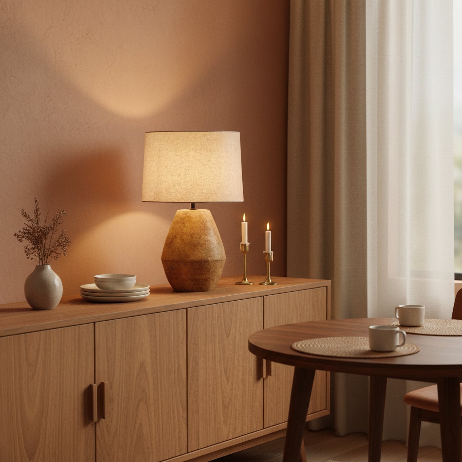 The Juvell Table Lamp from Mooijane features a textured terracotta-hued base that brings rustic, natural charm to any space. Topped with a neutral cylindrical fabric shade, it softly diffuses light to create a warm and inviting ambiance. Ideal for bedside tables, desks, or living areas, it combines cozy style with functional illumination.