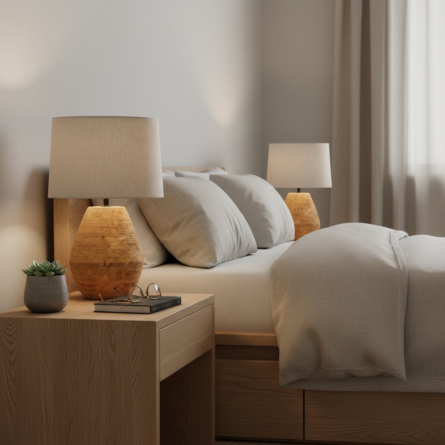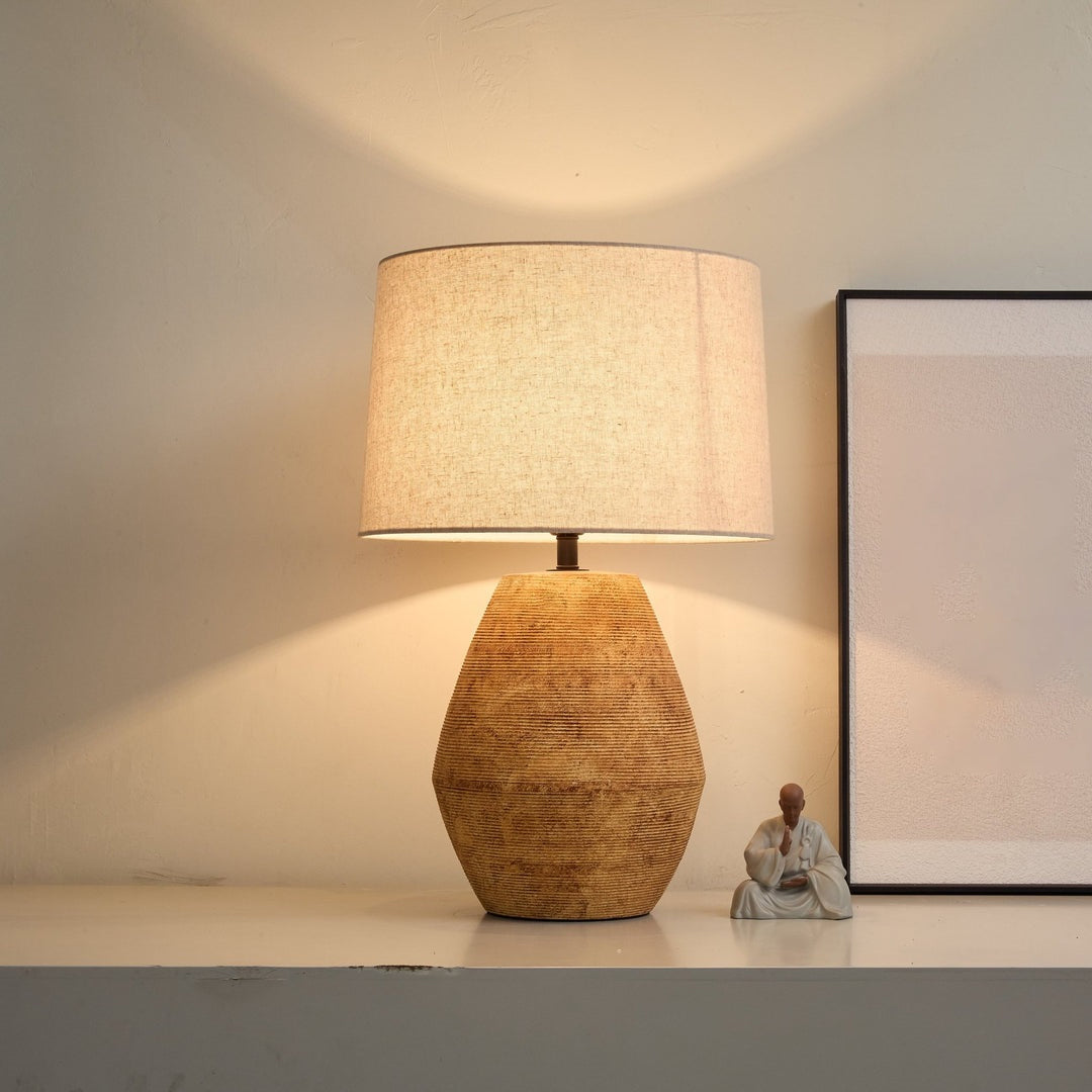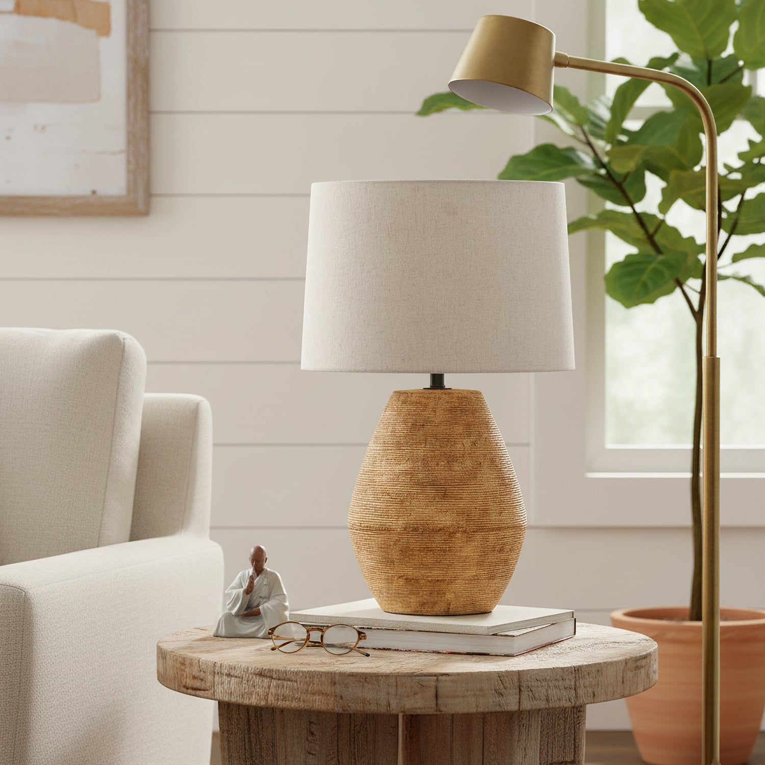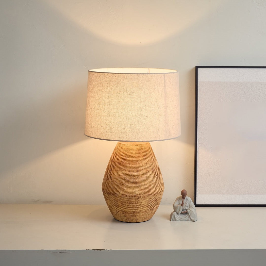 The Juvell Table Lamp from Mooijane features a textured terracotta-hued base that brings rustic, natural charm to any space. Topped with a neutral cylindrical fabric shade, it softly diffuses light to create a warm and inviting ambiance. Ideal for bedside tables, desks, or living areas, it combines cozy style with functional illumination.