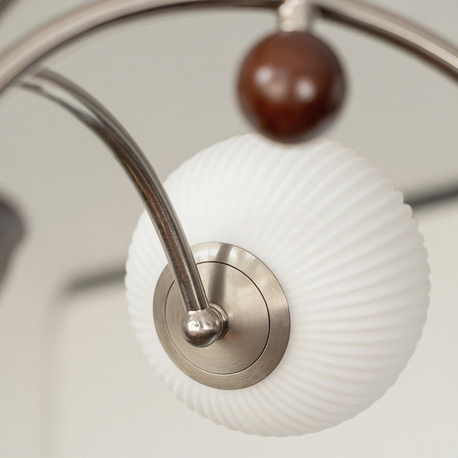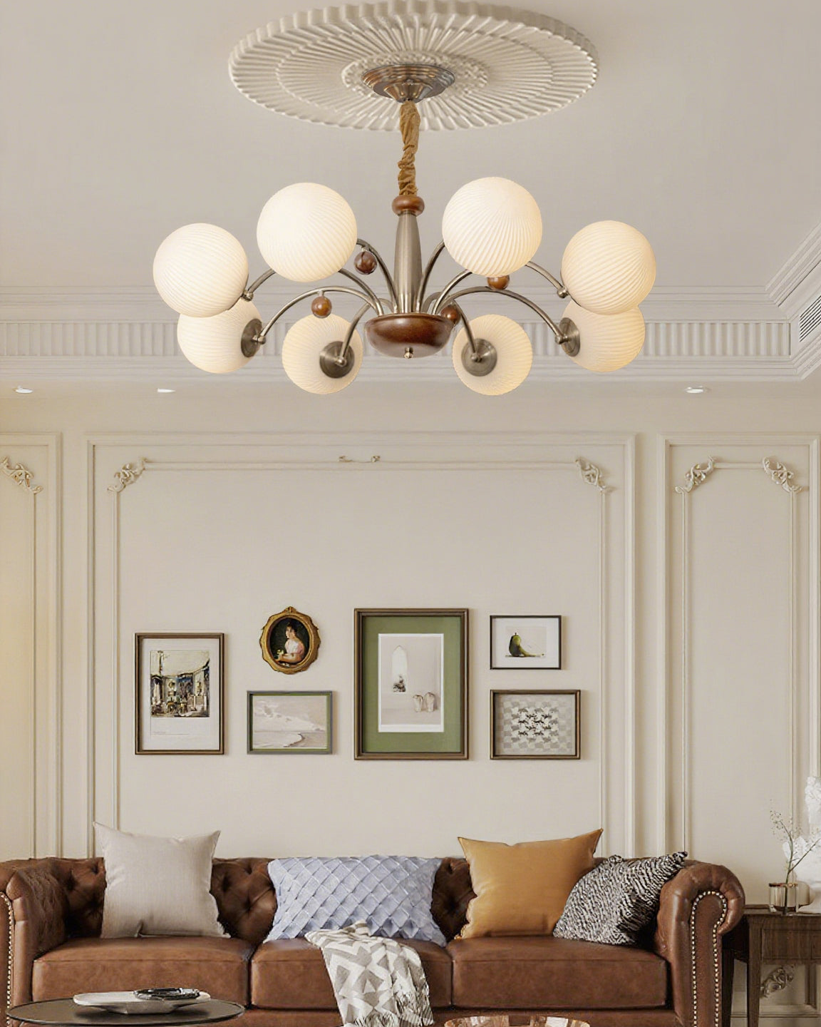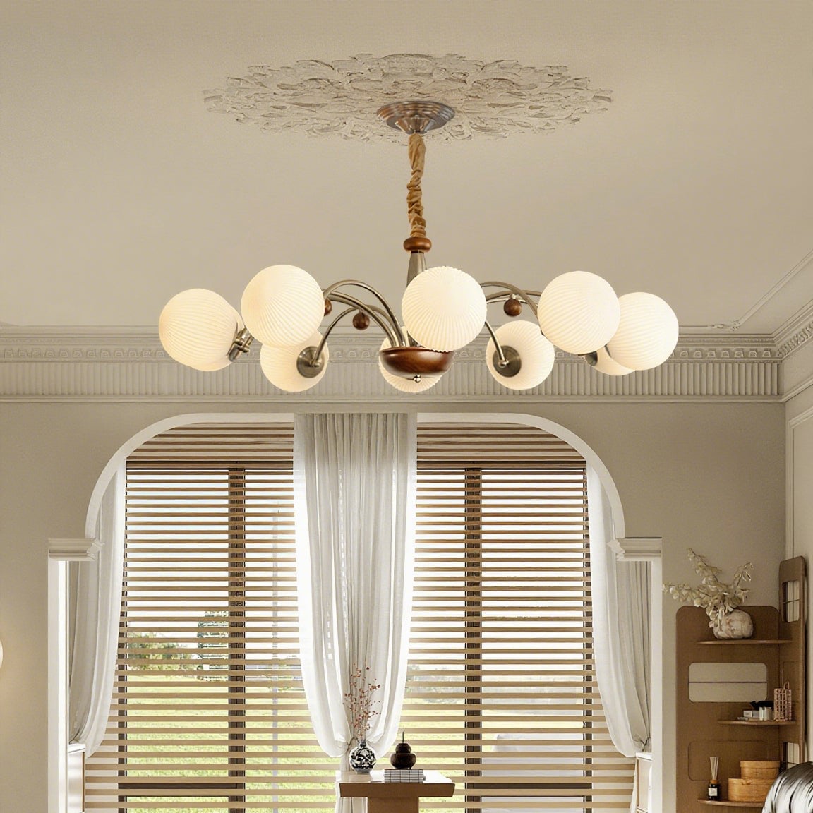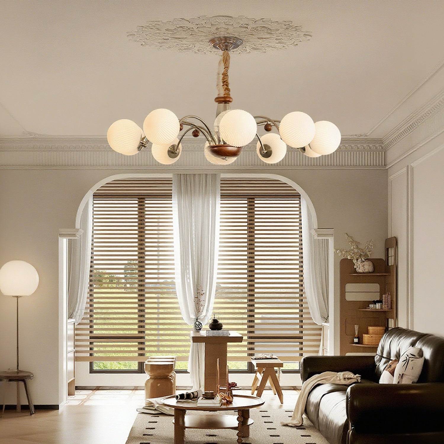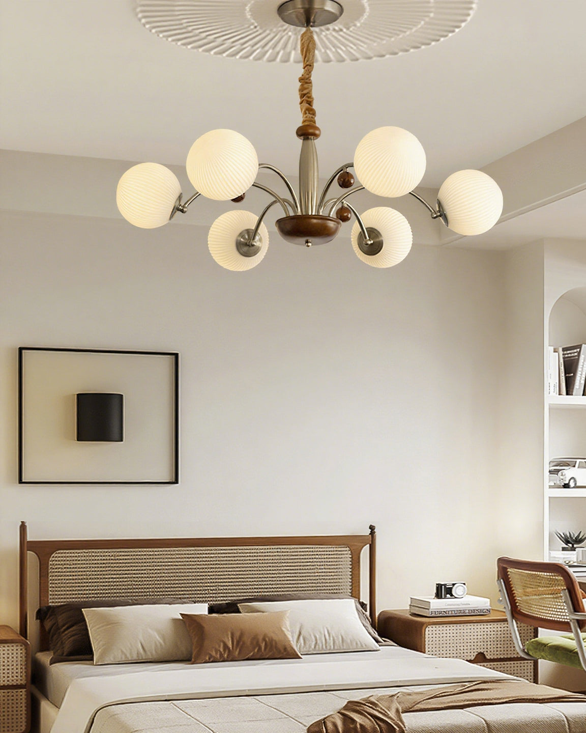 The Kaitlyn Chandelier by Mooijane blends modern elegance with subtle retro charm. Its gracefully curved metal arms extend outward like a blossoming flower, creating a dynamic, layered silhouette. Delicately textured spherical glass shades diffuse a warm, even glow, adding both comfort and sophistication to the atmosphere.