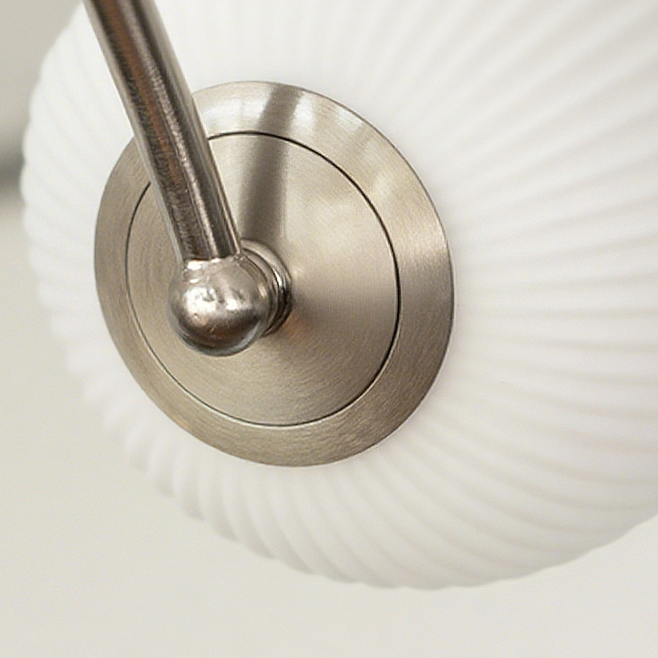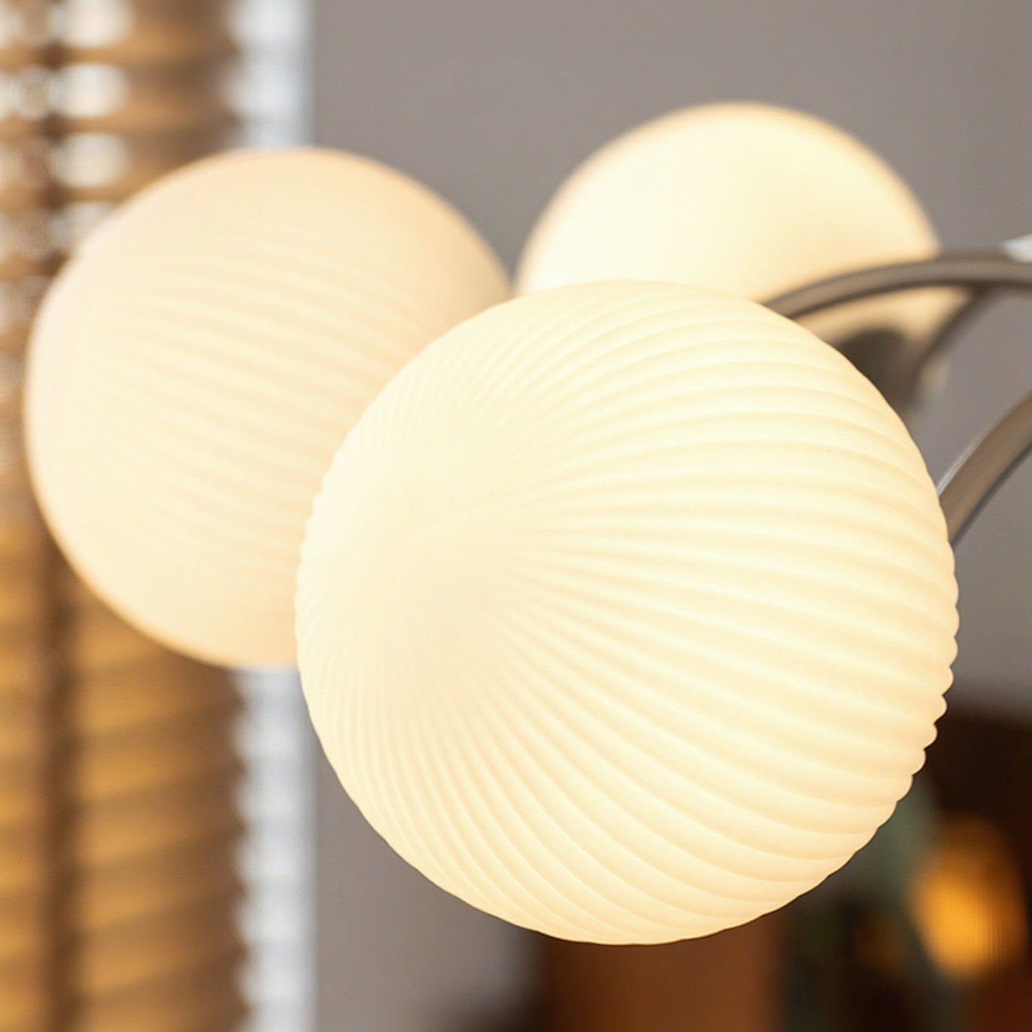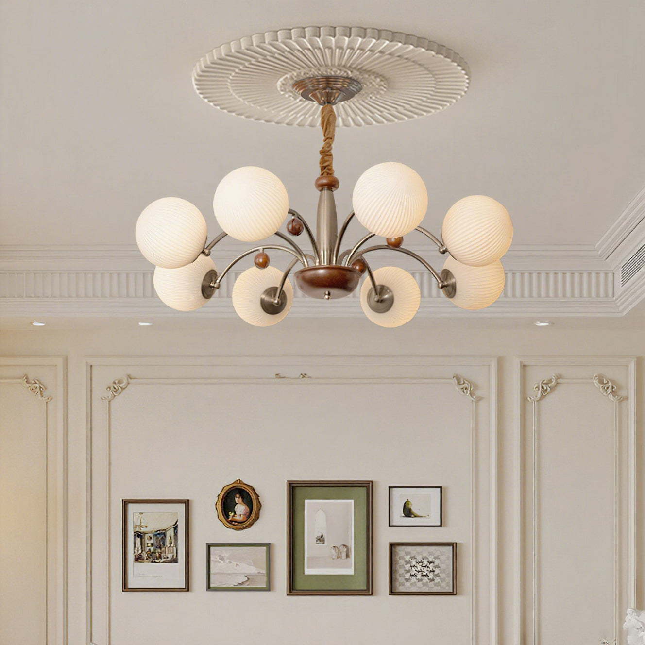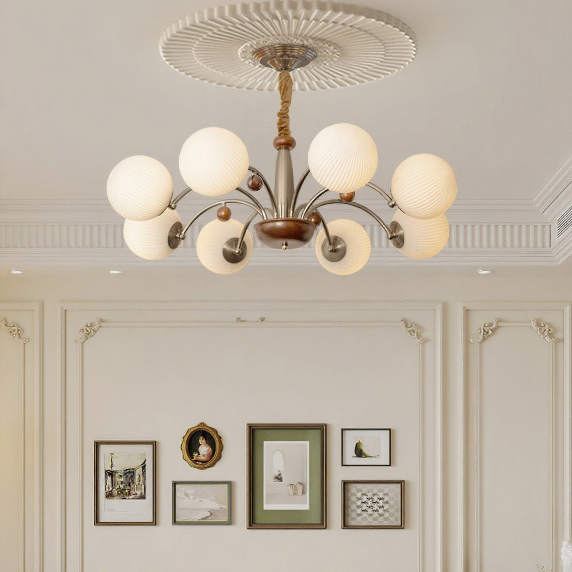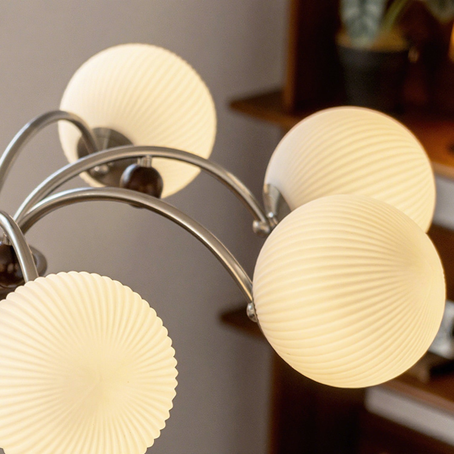 The Kaitlyn Chandelier by Mooijane blends modern elegance with subtle retro charm. Its gracefully curved metal arms extend outward like a blossoming flower, creating a dynamic, layered silhouette. Delicately textured spherical glass shades diffuse a warm, even glow, adding both comfort and sophistication to the atmosphere.