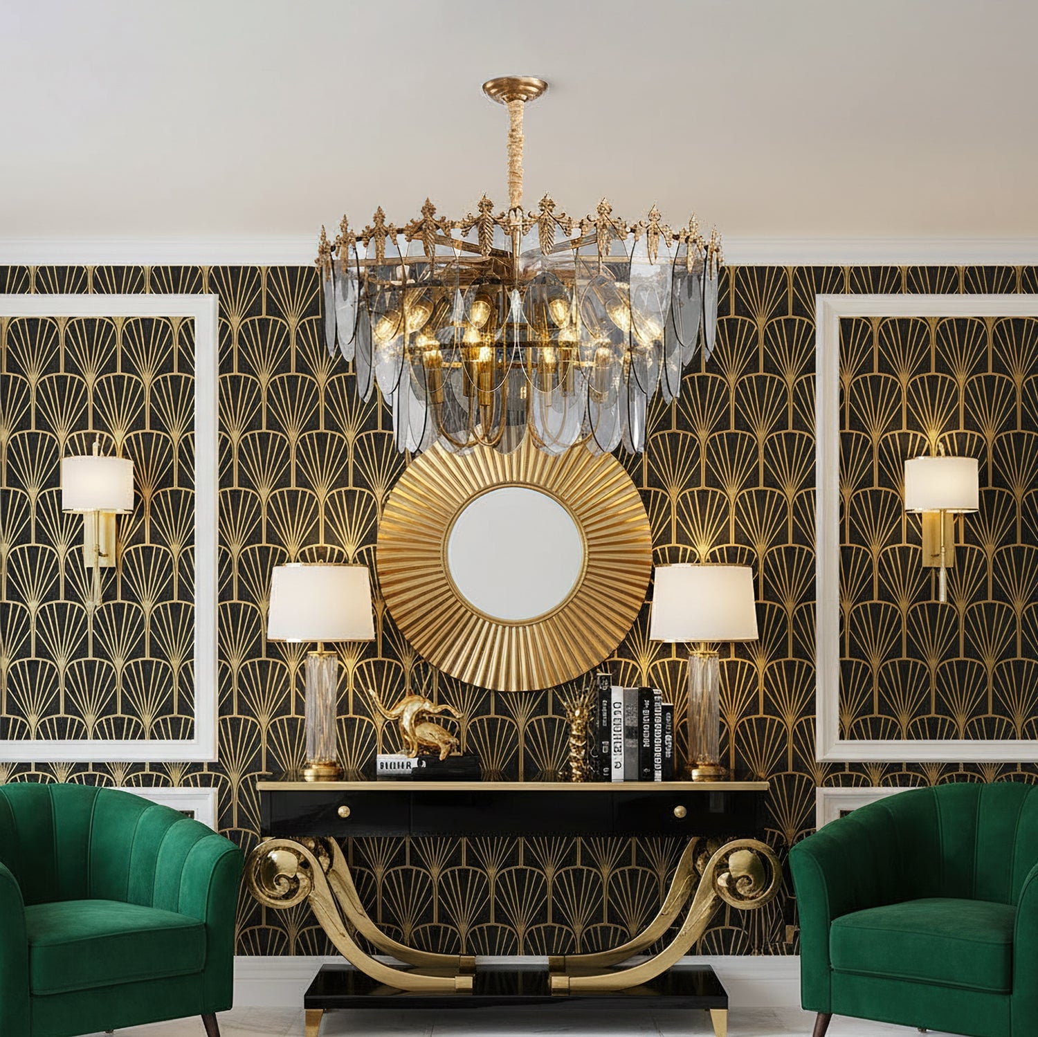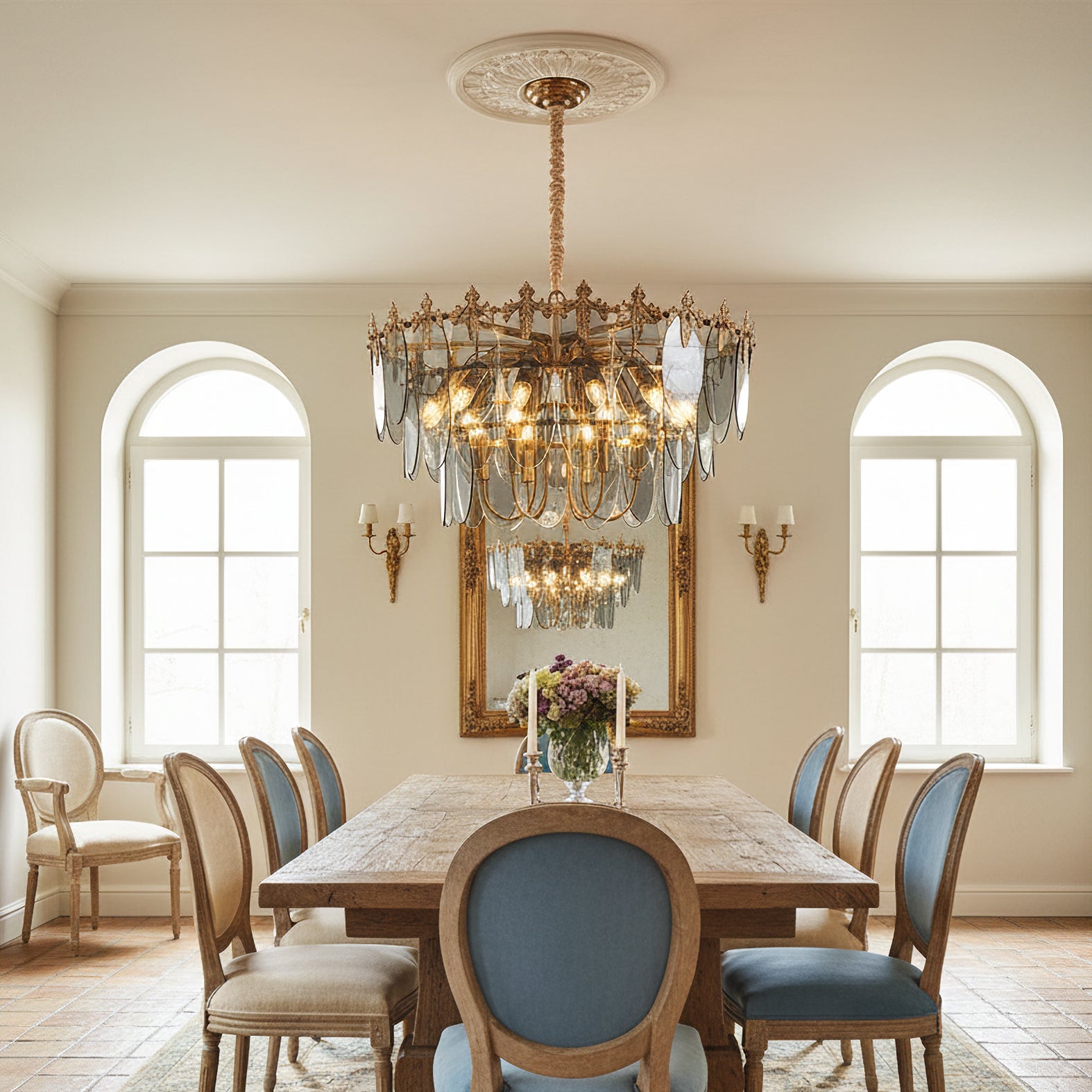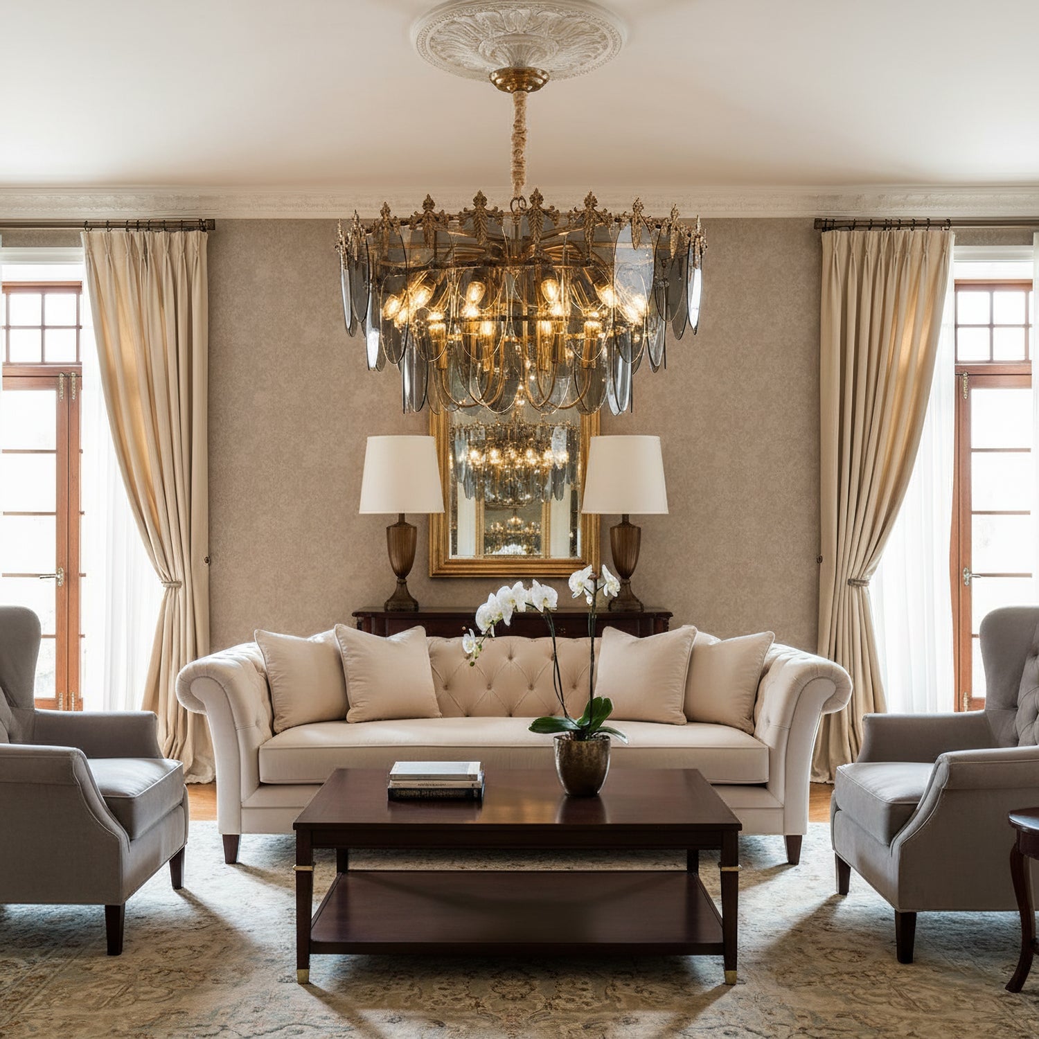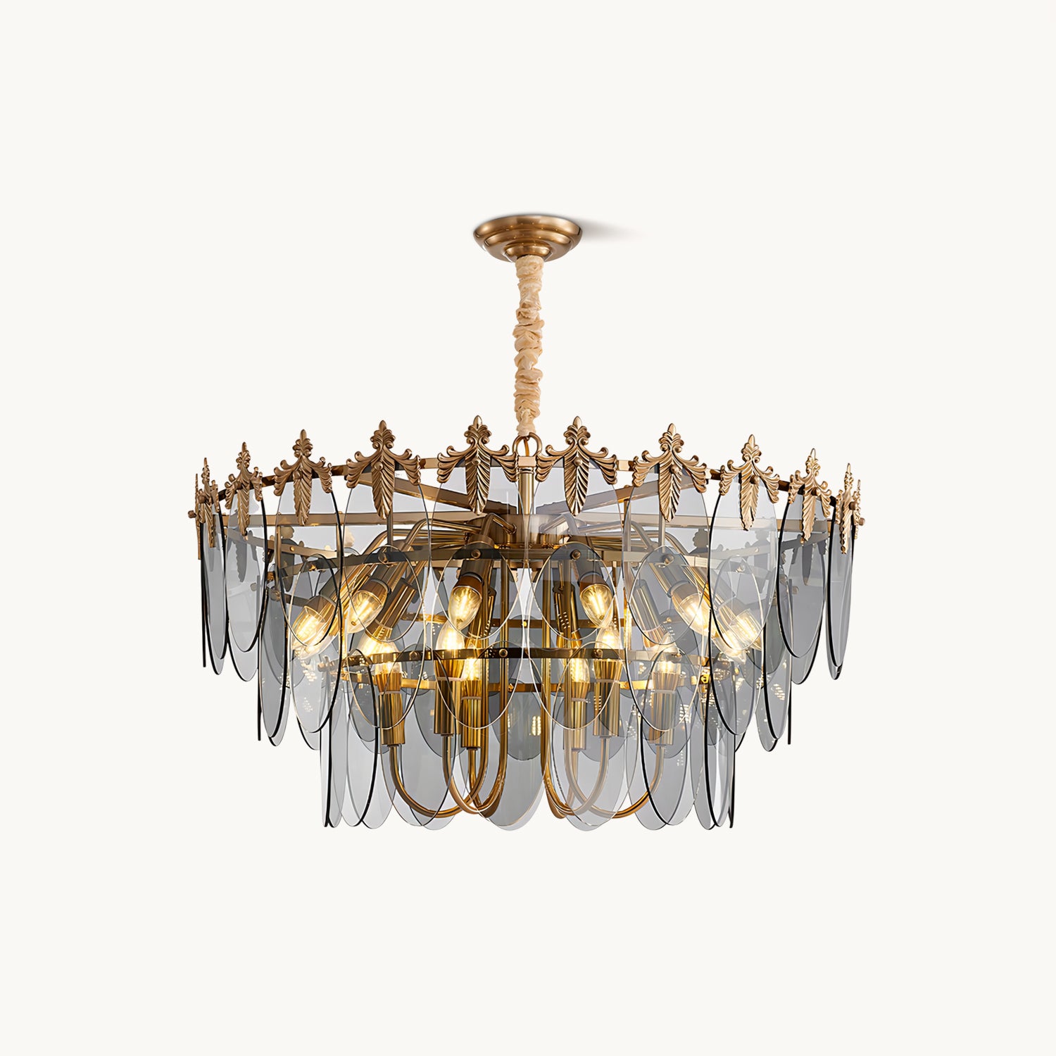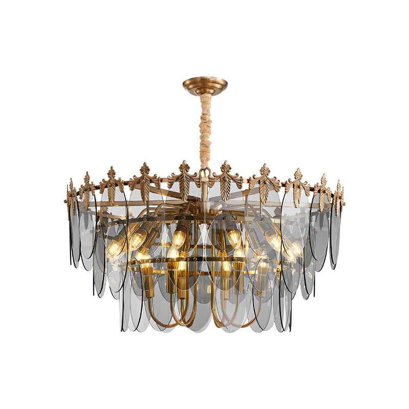 The Kasliga Chandelier by Mooijane exudes luxurious elegance and artistic flair. Its cascading smoked glass panels resemble petals, creating a captivating interplay of light and shadow, while the metal frame with delicate leaf detailing adds a touch of vintage sophistication. Perfect for dining rooms, entryways, or living spaces, it radiates a warm, captivating glow, adding a touch of sophistication to any interior.