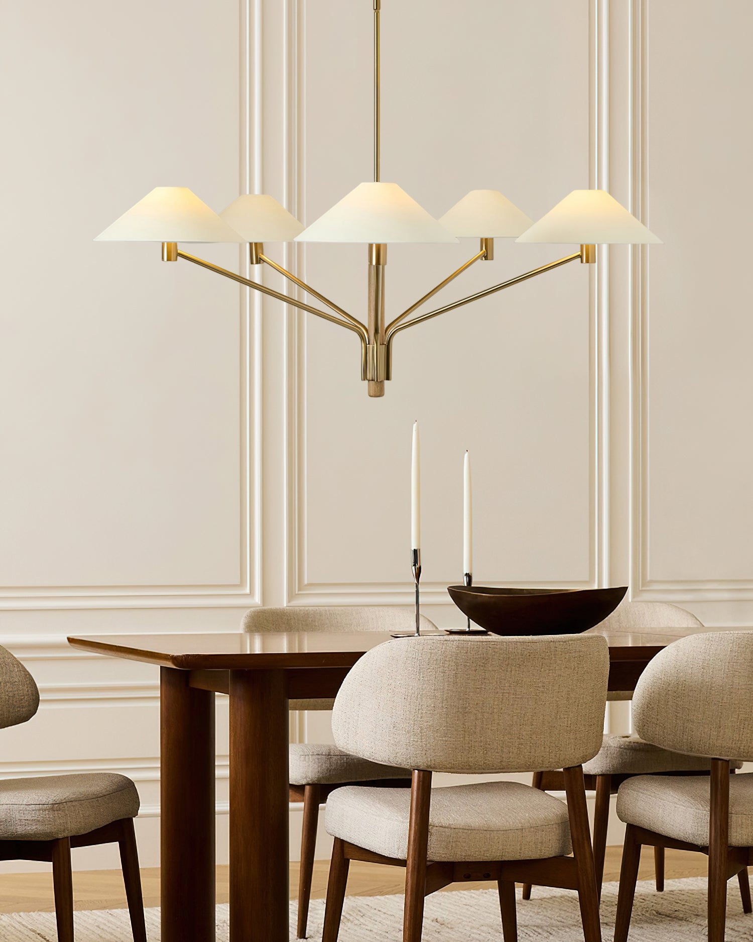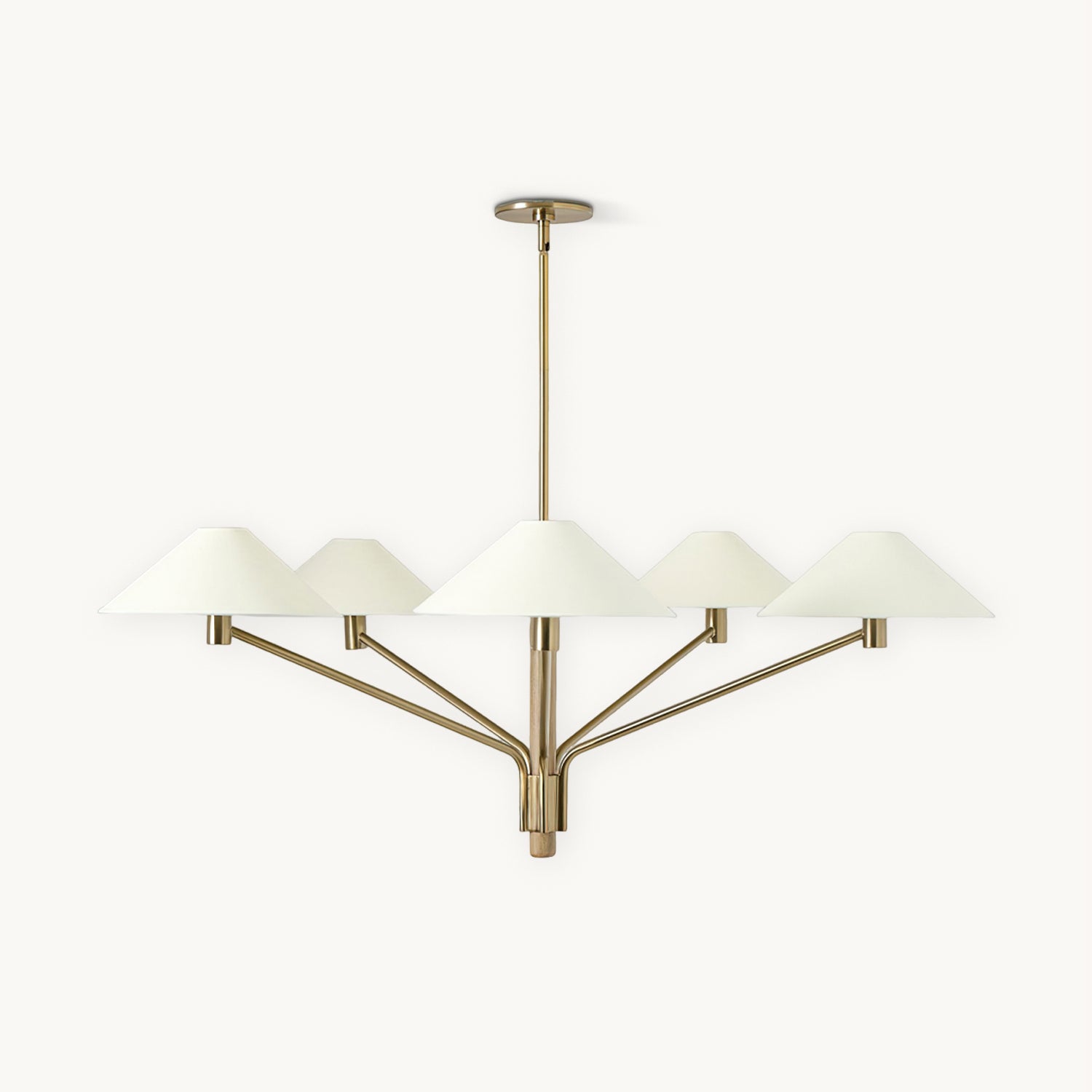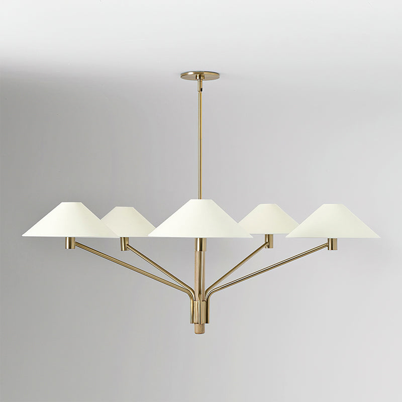 Discover timeless elegance with the Kinsley Chandelier from Mooijane. Its long, elegant arms and graceful curves boast a classic Tumbled Brass finish, topped with five tapered linen shades. Bring sophistication to any space with this simple yet refined chandelier.