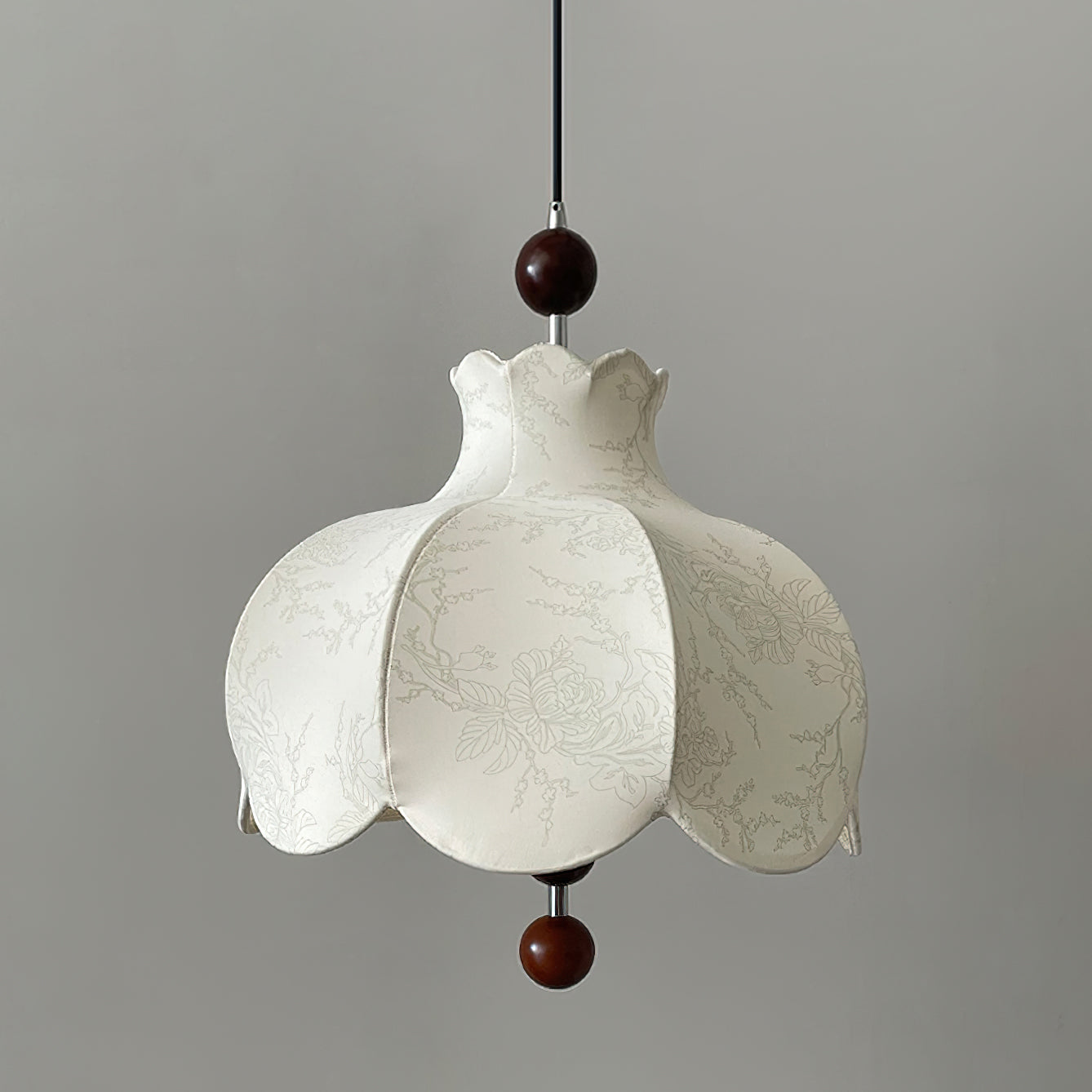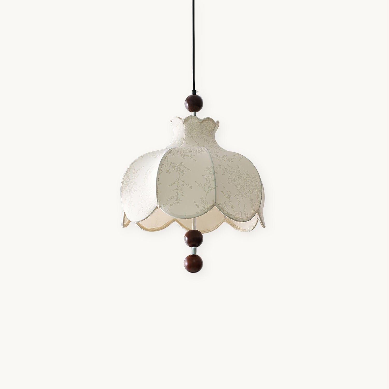 Introducing the Kleura Pendant Lamp by Mooijane - a timeless piece of elegance for any interior. Its scalloped fabric shade and warm tones exude vintage sophistication, while wooden beads add artistic and organic charm. With a soft, ambient glow, this lamp creates a beautifully illuminated atmosphere. Shop now and discover the perfect blend of artistry and luxury.