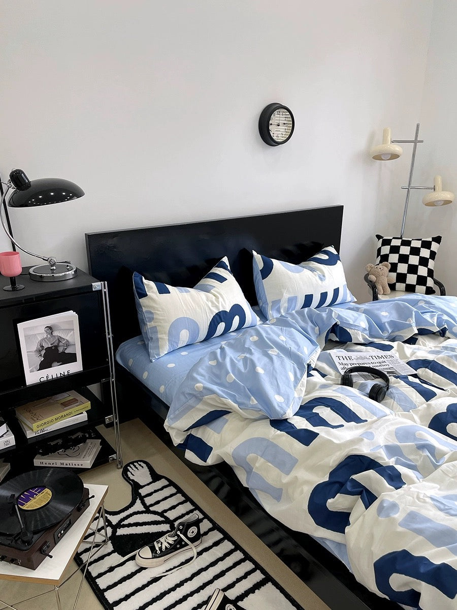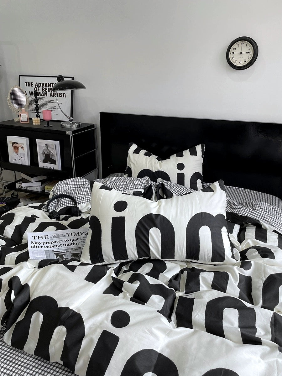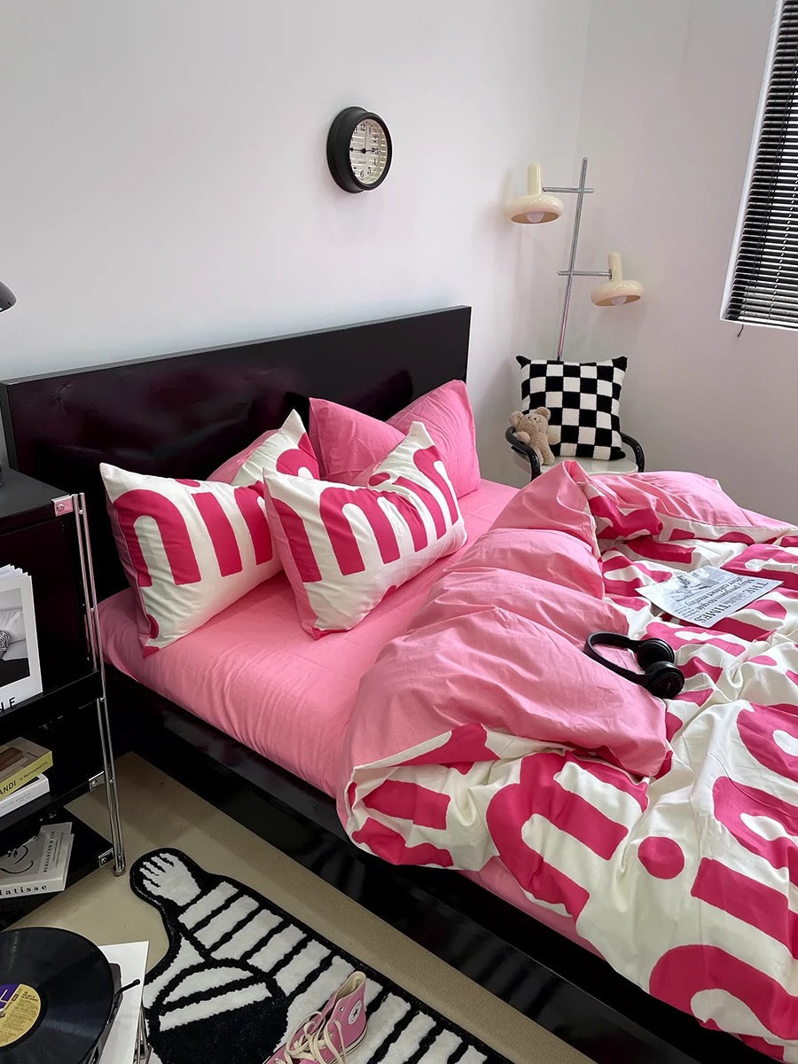 Korean Pink Letter Bedding Set - Preppy Aesthetic Bed Linen with Duvet Cover