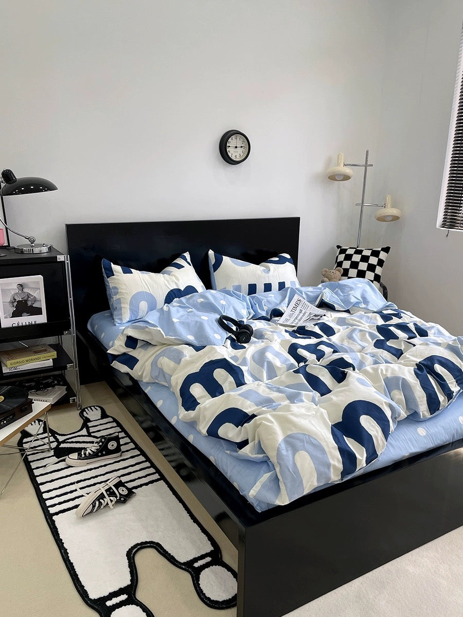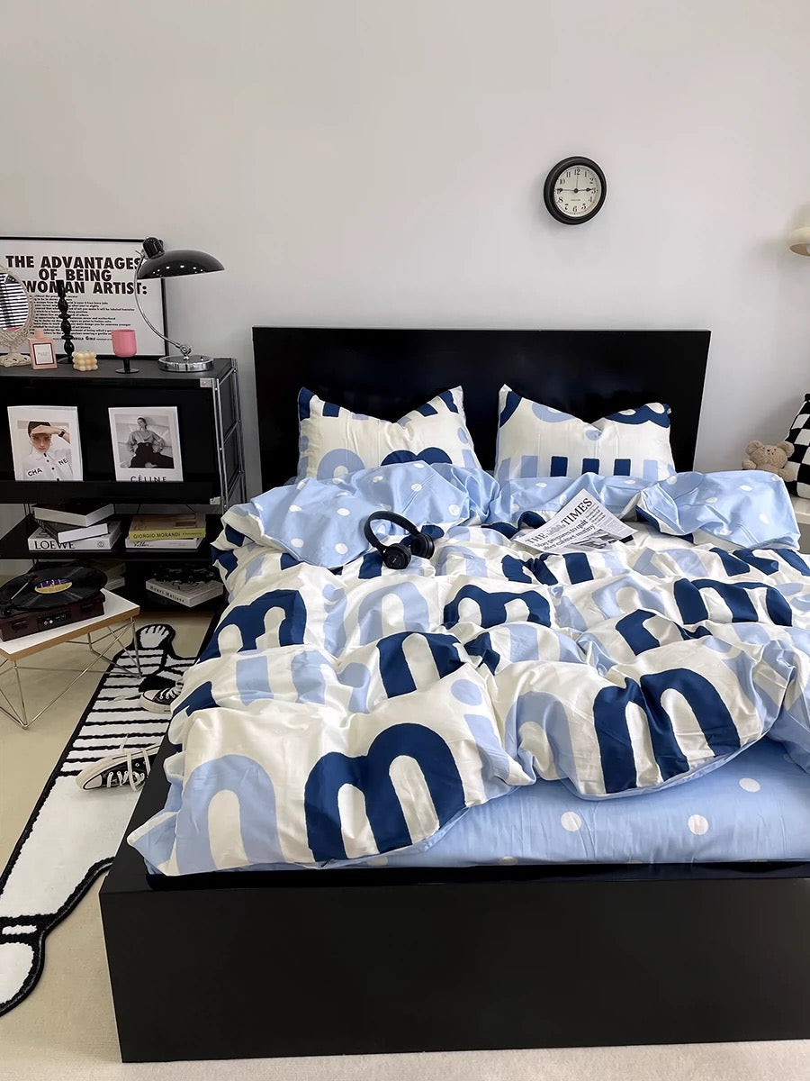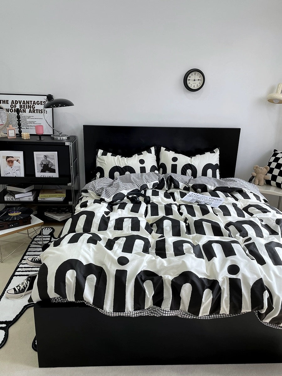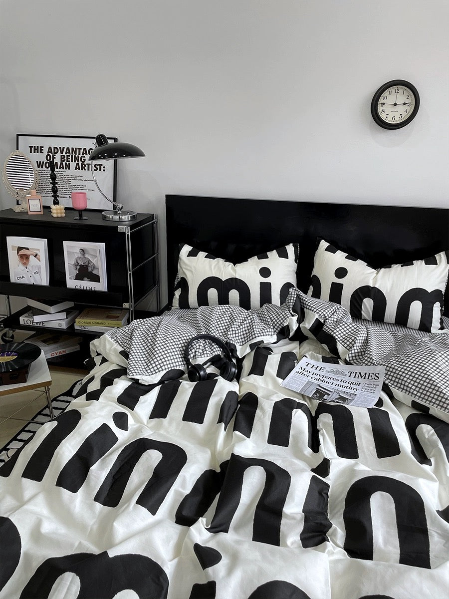 Korean Pink Letter Bedding Set - Preppy Aesthetic Bed Linen with Duvet Cover