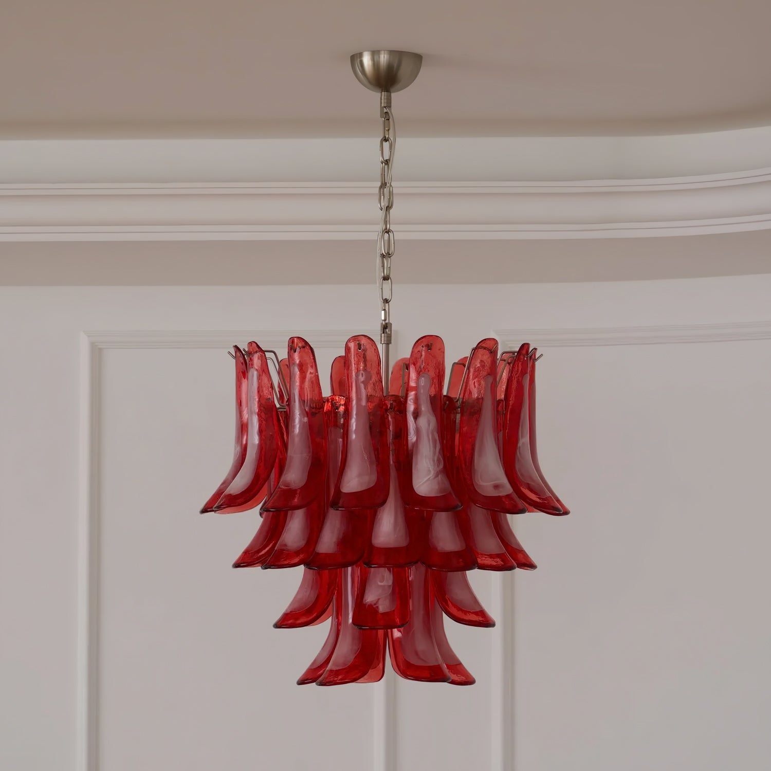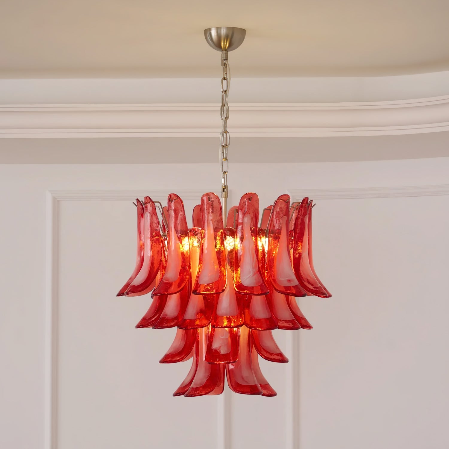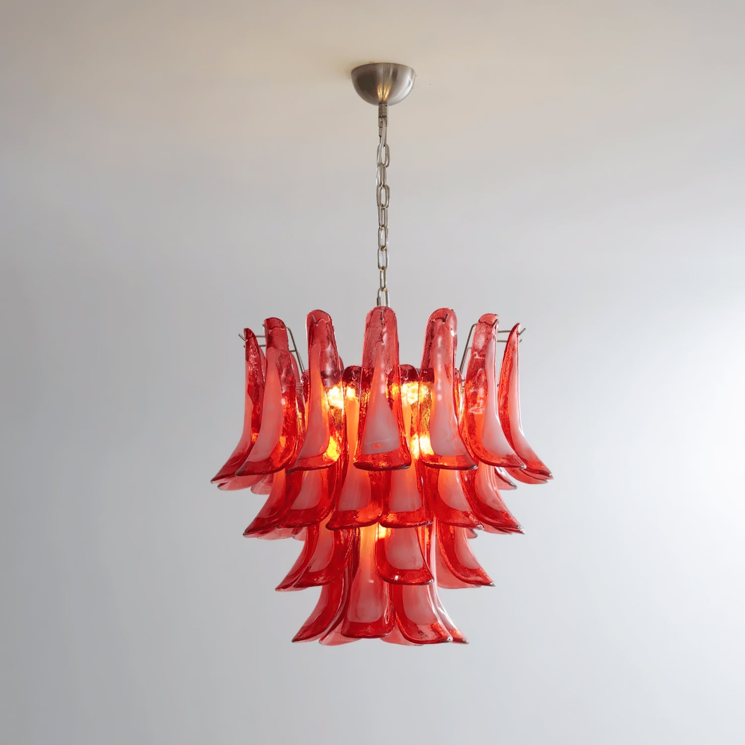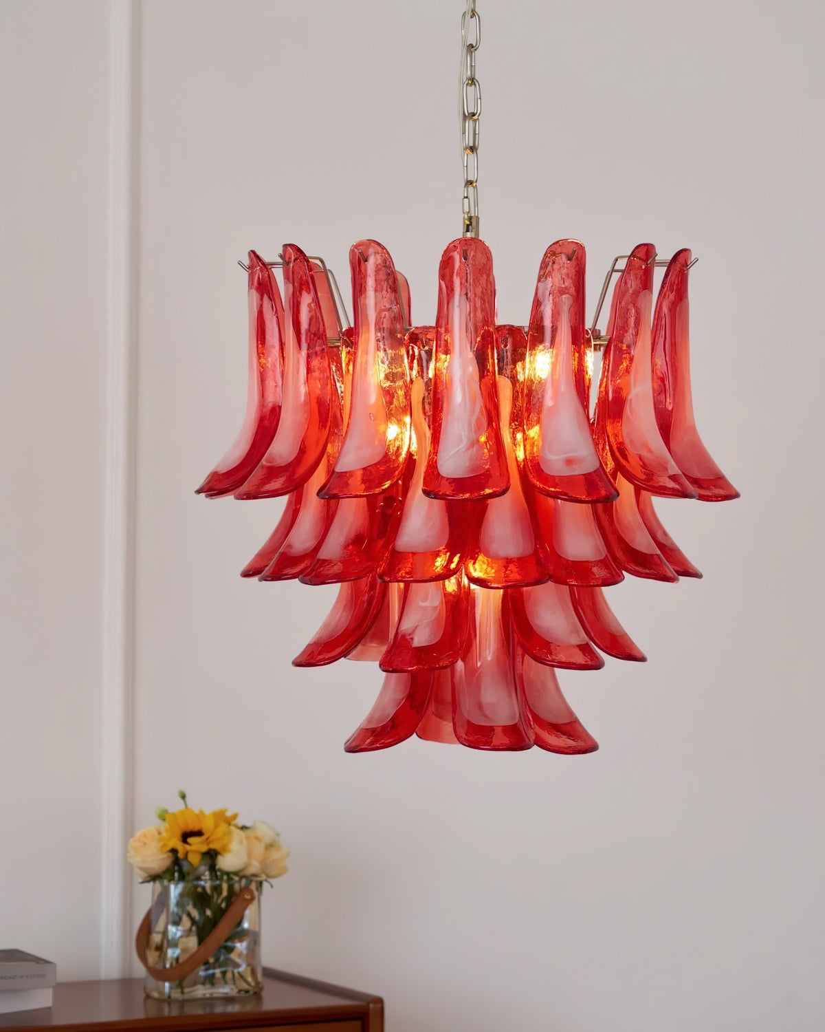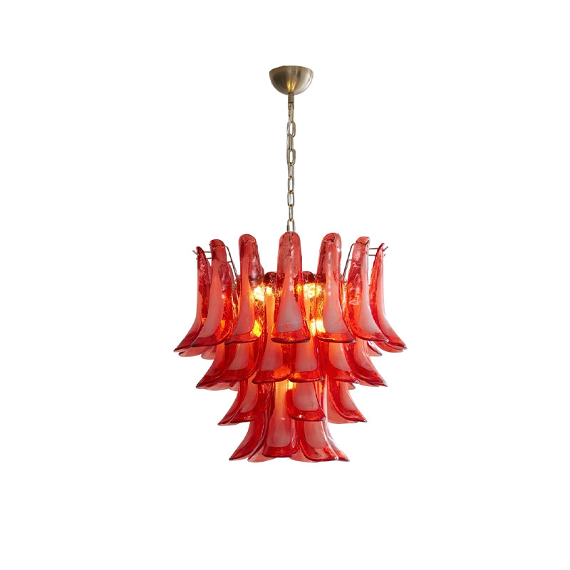 Introducing the Lattimo Murano Glass Chandelier, exclusively from the luxurious Mooijane. Elevate your space with vibrant red glass petals that cascade elegantly, creating a striking and sophisticated centerpiece for any room. Its unique design blends modern artistry with a warm glow, enhancing your interior's beauty.