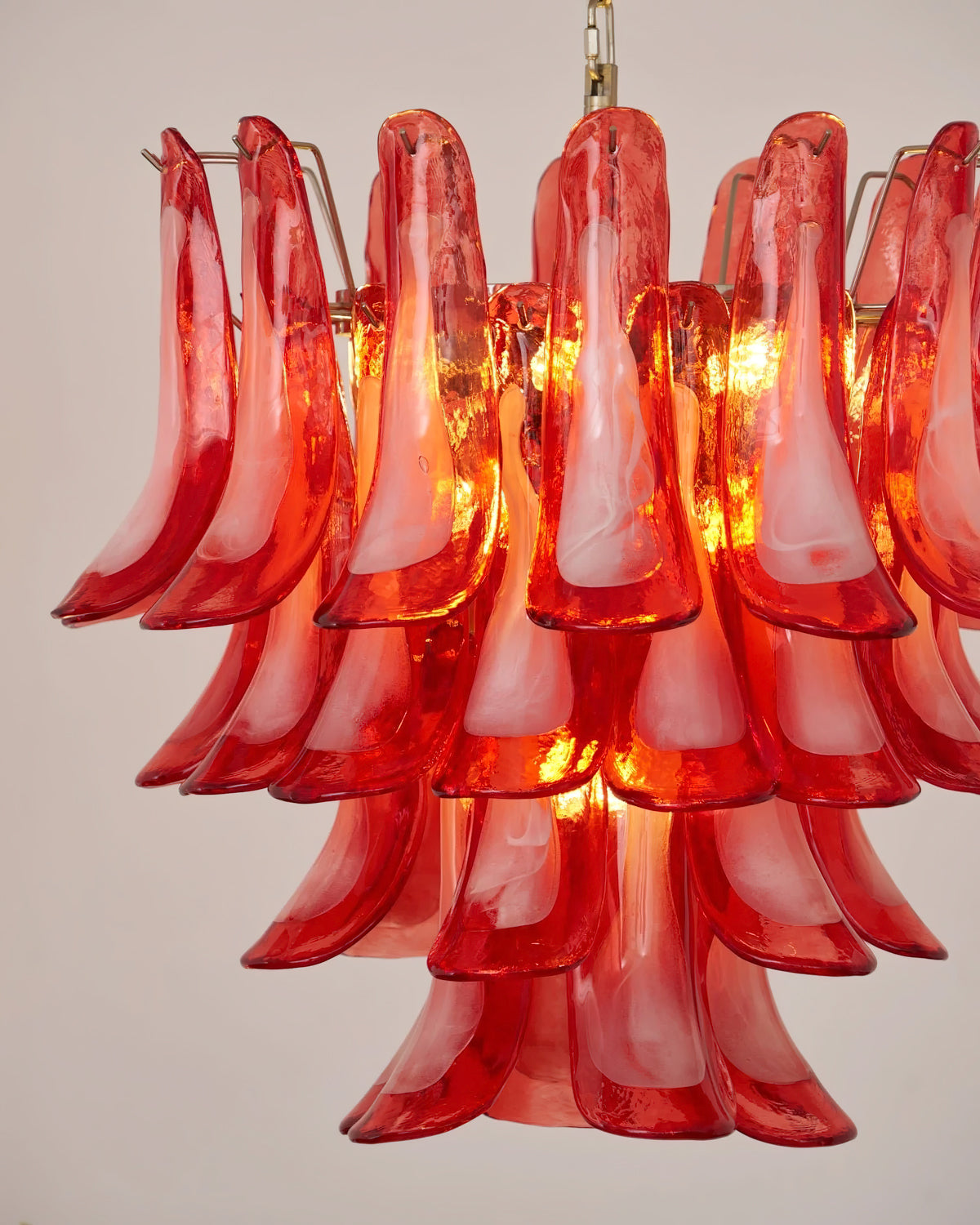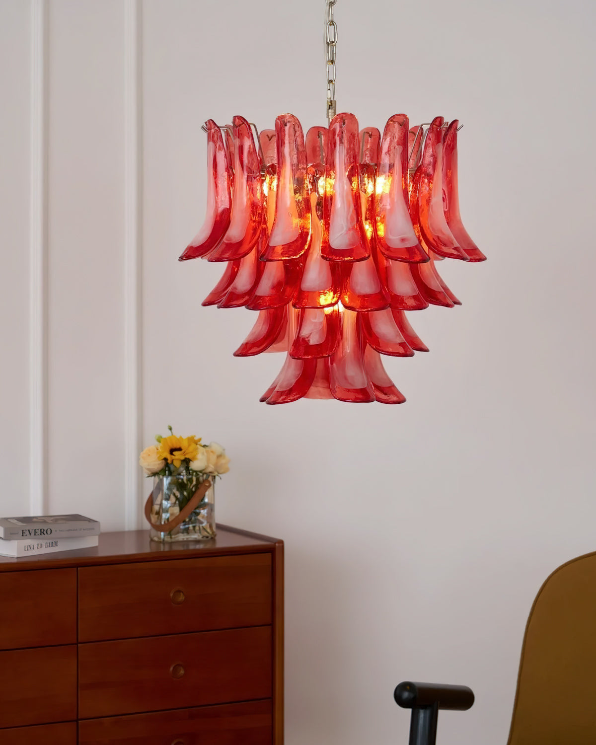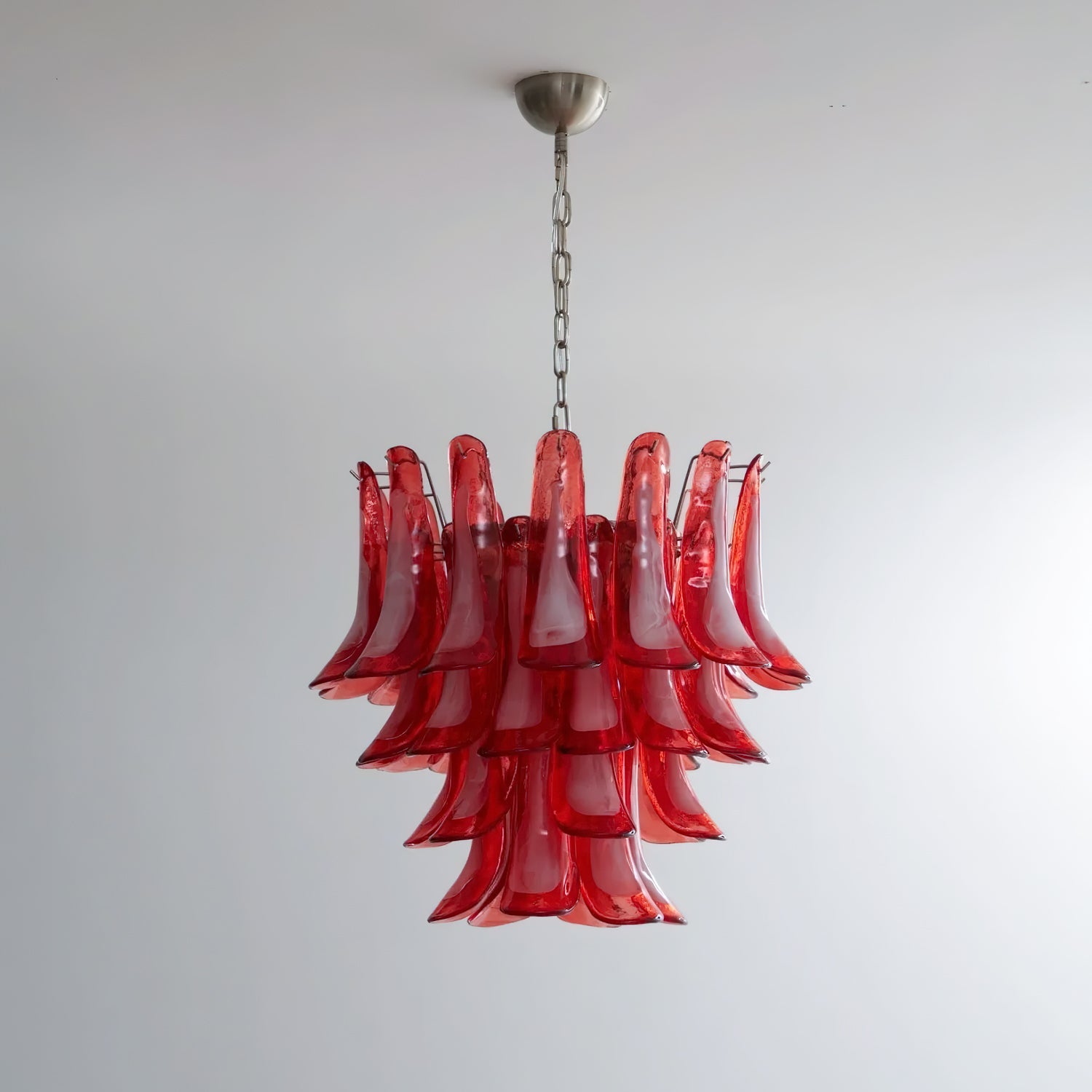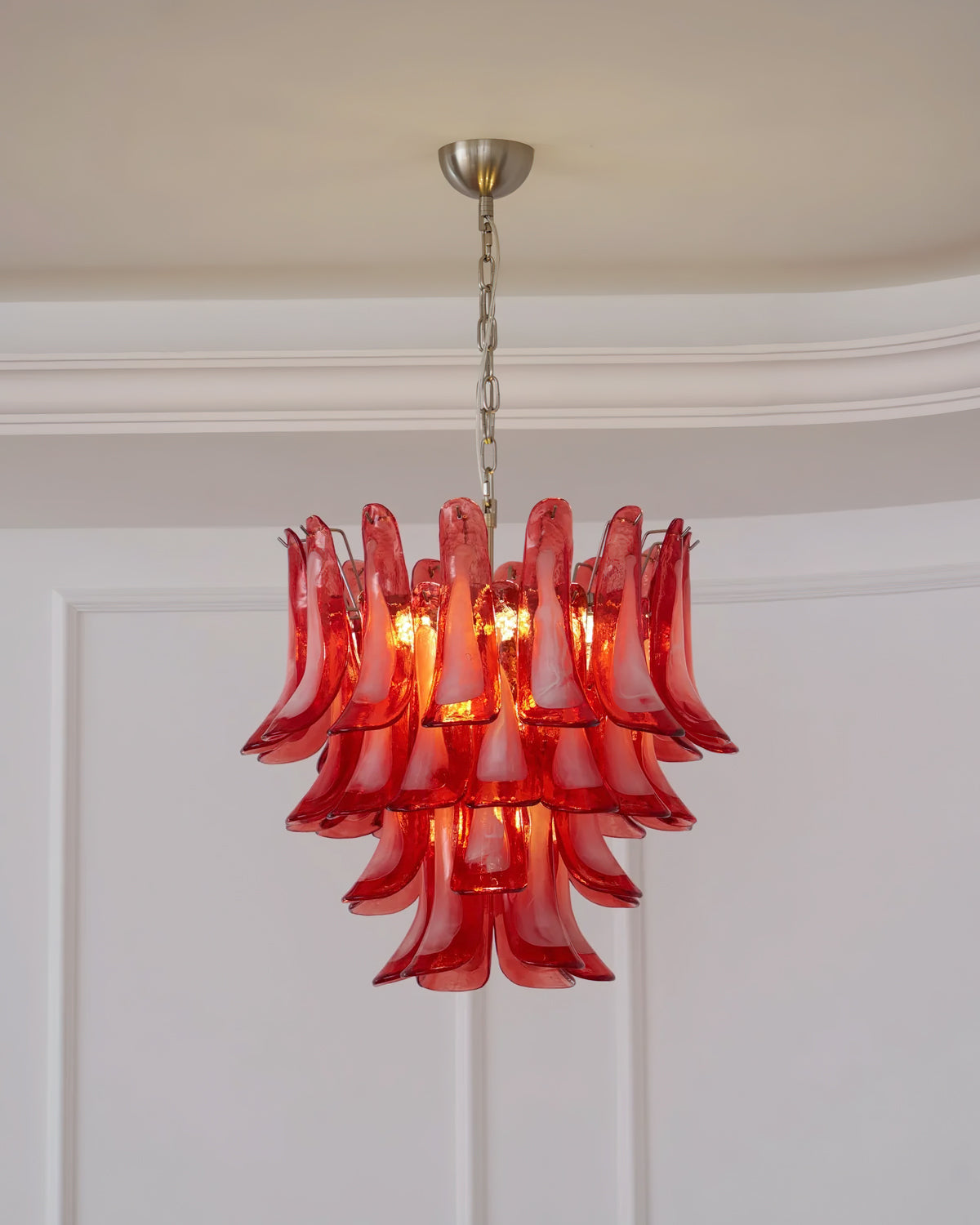 Introducing the Lattimo Murano Glass Chandelier, exclusively from the luxurious Mooijane. Elevate your space with vibrant red glass petals that cascade elegantly, creating a striking and sophisticated centerpiece for any room. Its unique design blends modern artistry with a warm glow, enhancing your interior's beauty.