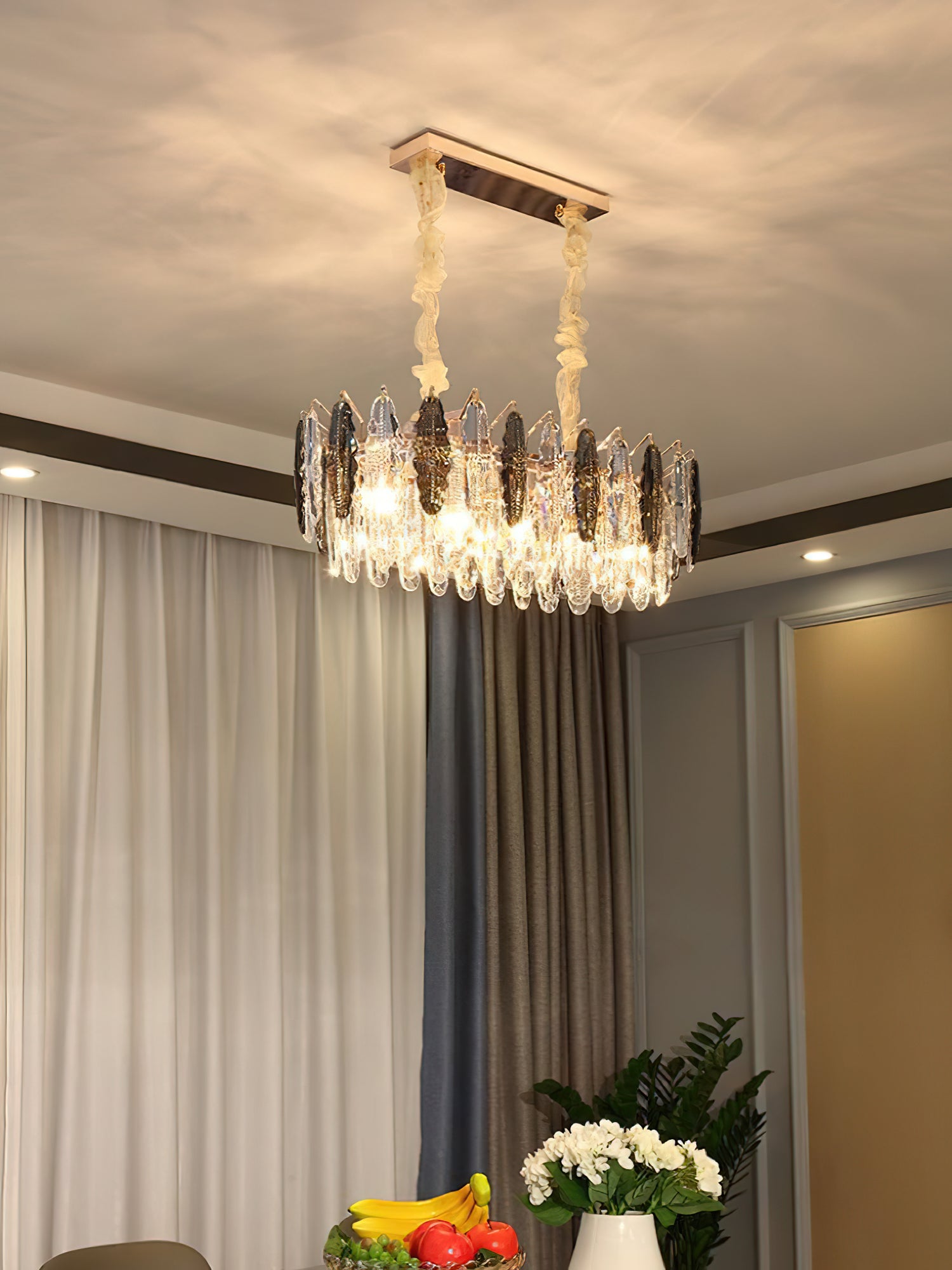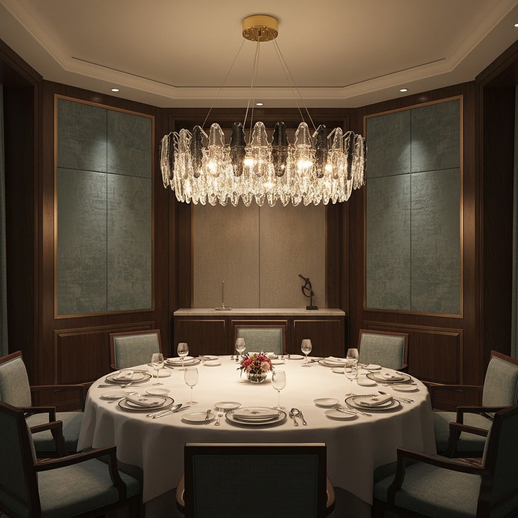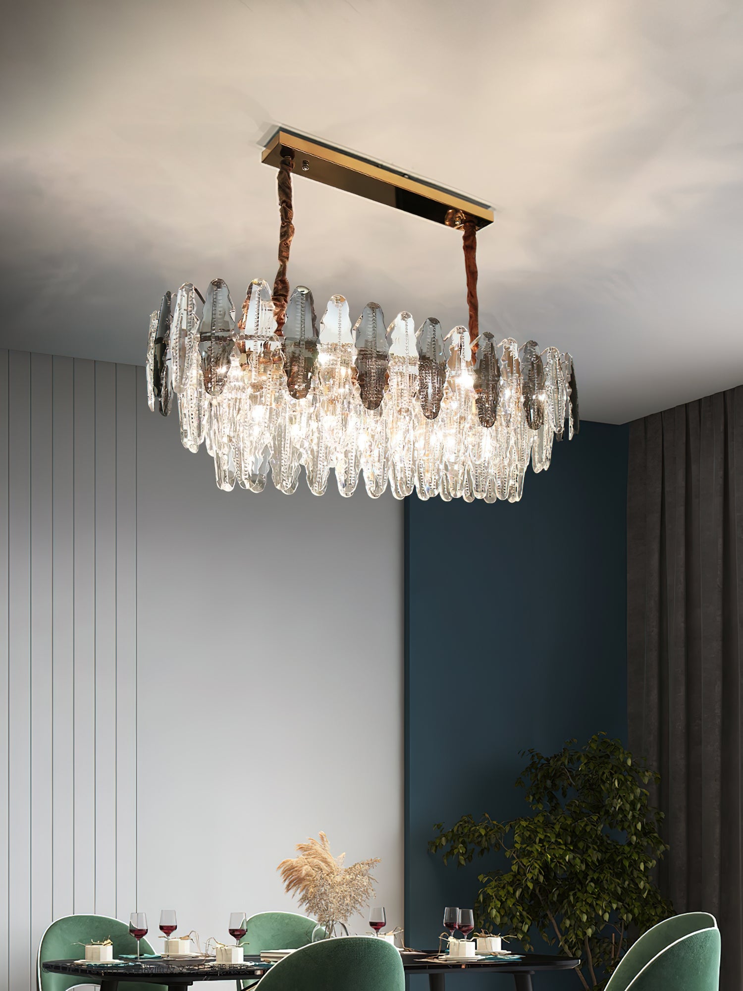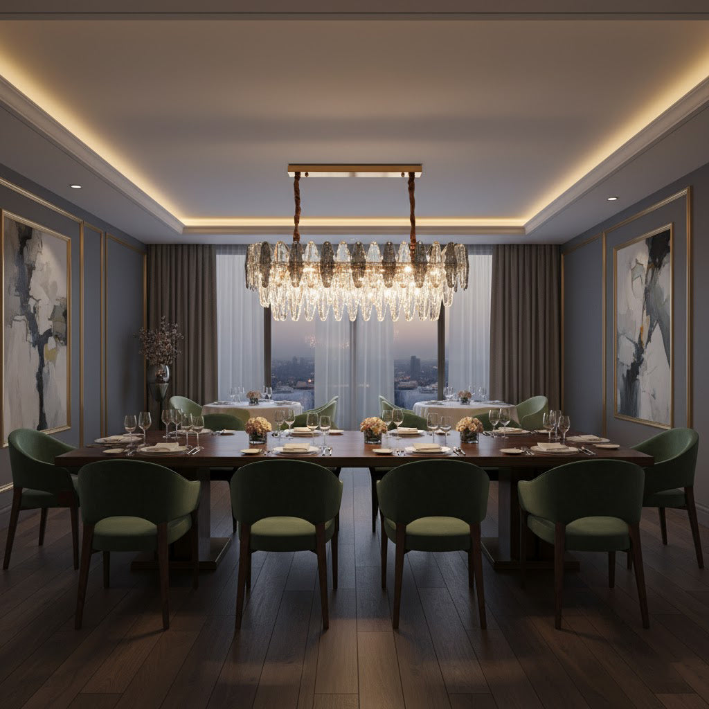 This stunning leaf shaped crystal chandelier has a luxurious design and is perfect for adding a touch of elegance to your living room, dining room or bedroom. Made of high-quality glass and metal, it adds sophistication and ambience to any space. The modern and sophisticated design is sure to be stunning, let the Leaf crystal chandelier bring luxurious light to your home.