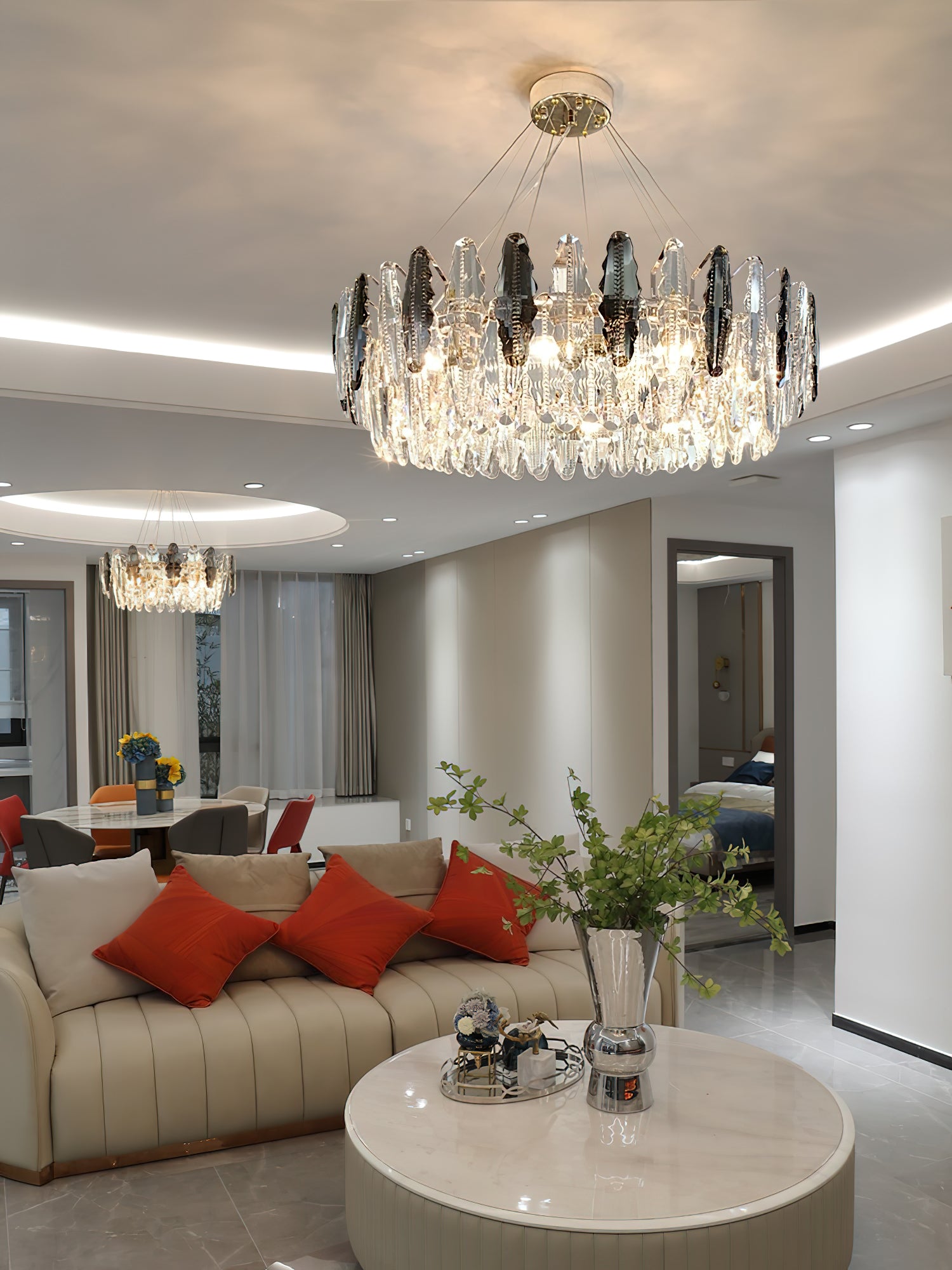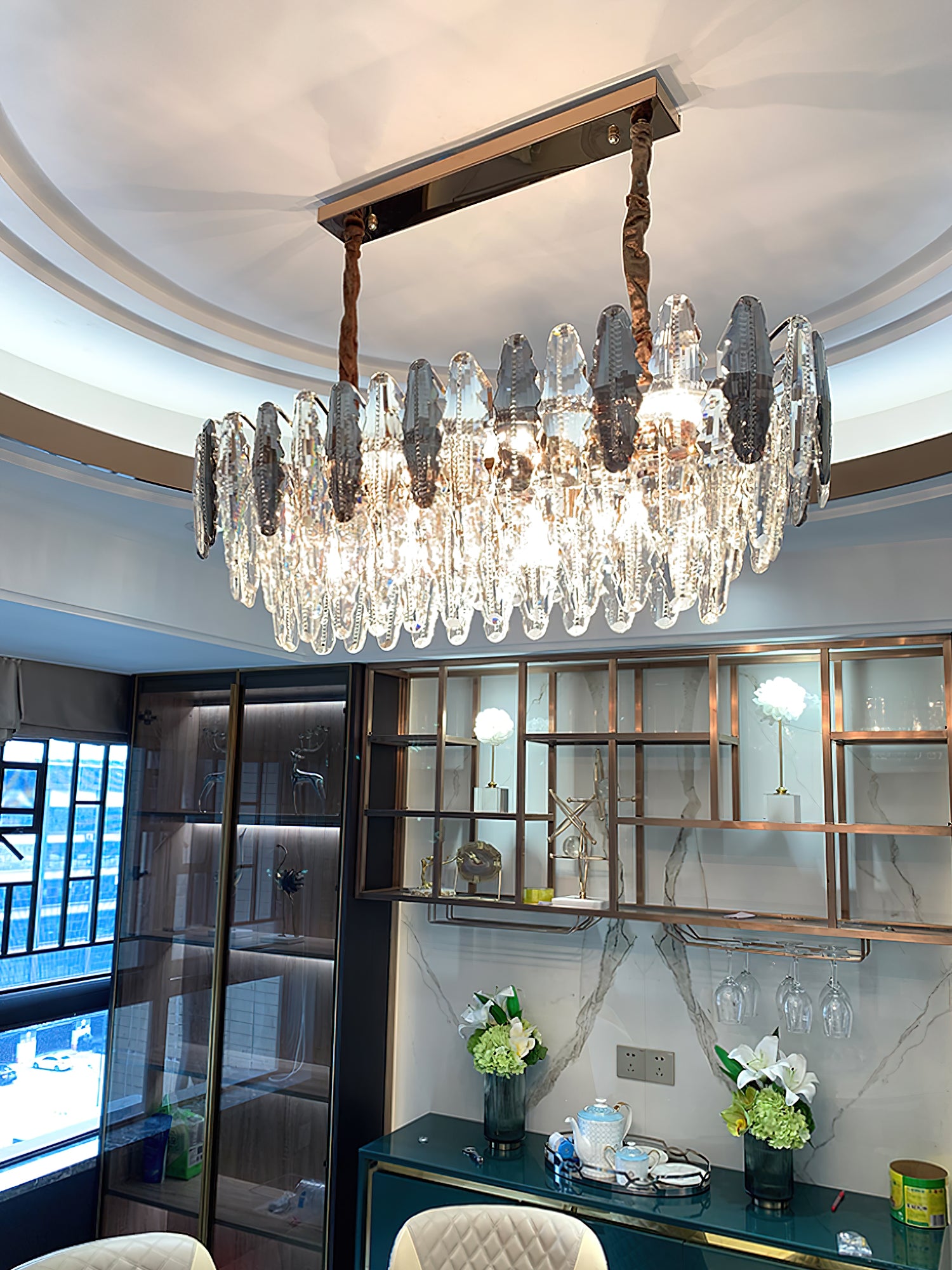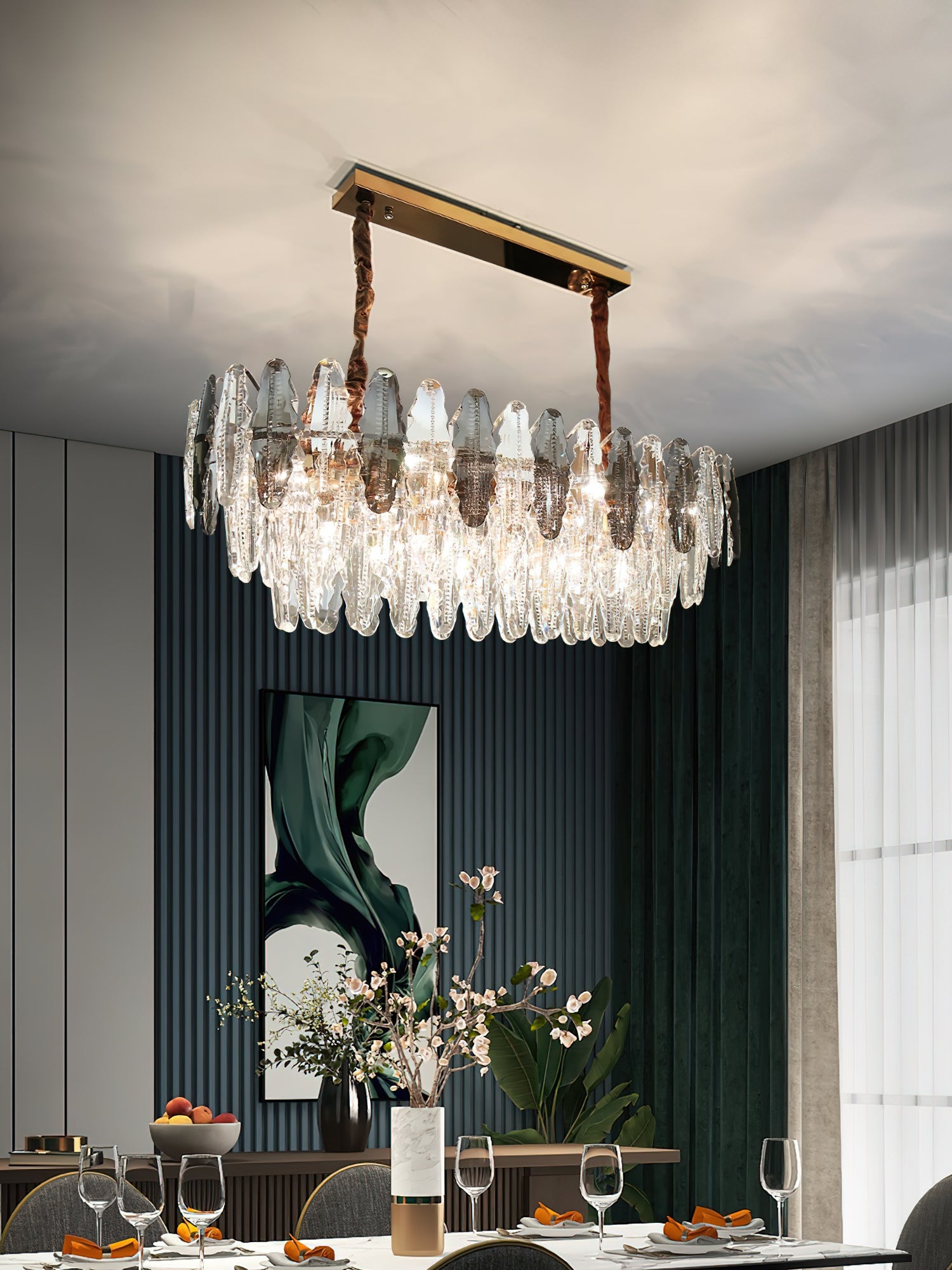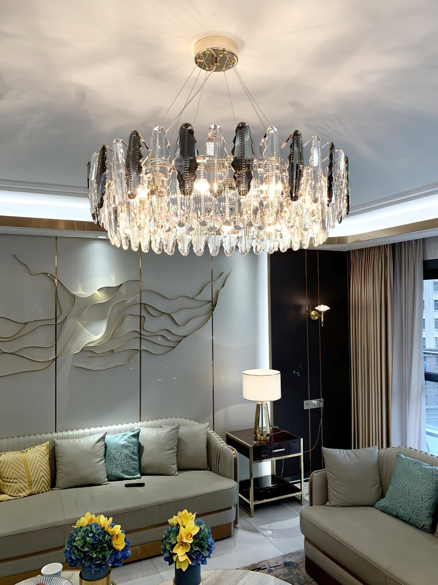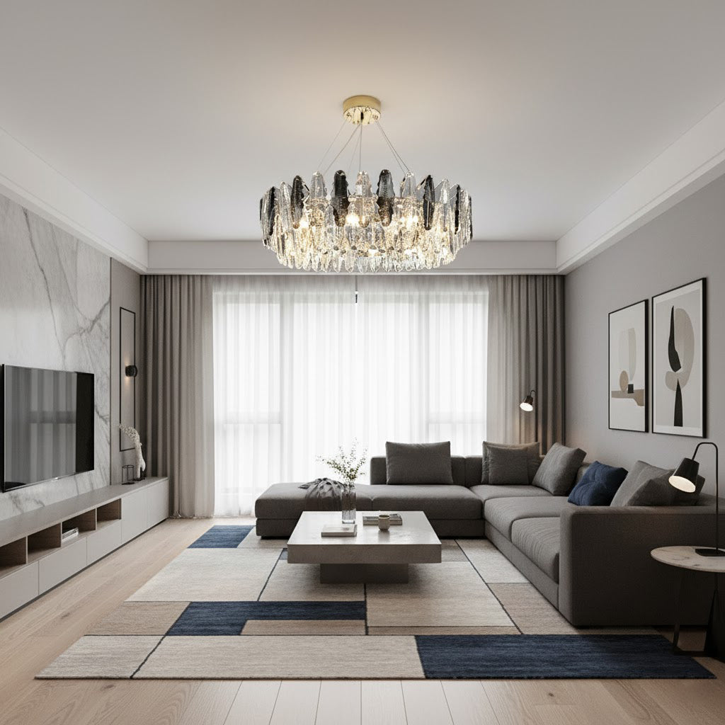 This stunning leaf shaped crystal chandelier has a luxurious design and is perfect for adding a touch of elegance to your living room, dining room or bedroom. Made of high-quality glass and metal, it adds sophistication and ambience to any space. The modern and sophisticated design is sure to be stunning, let the Leaf crystal chandelier bring luxurious light to your home.
