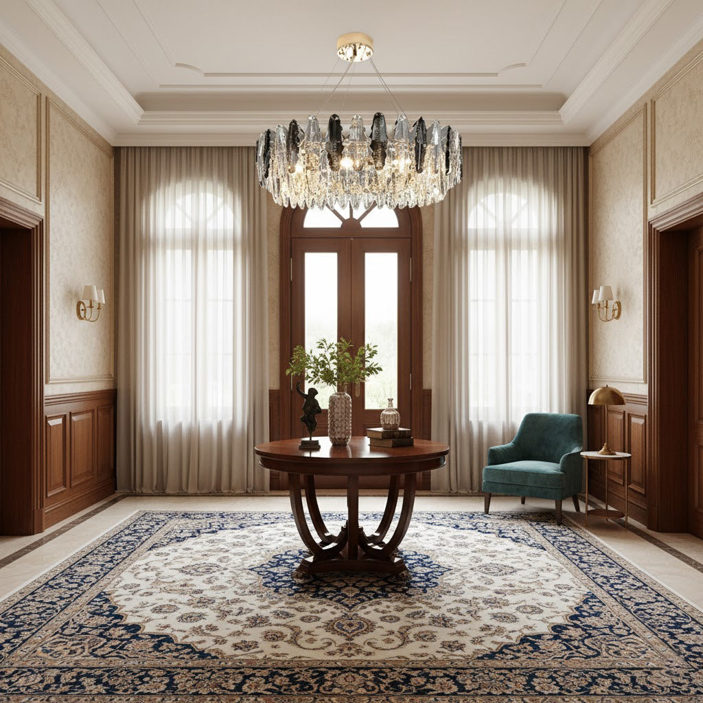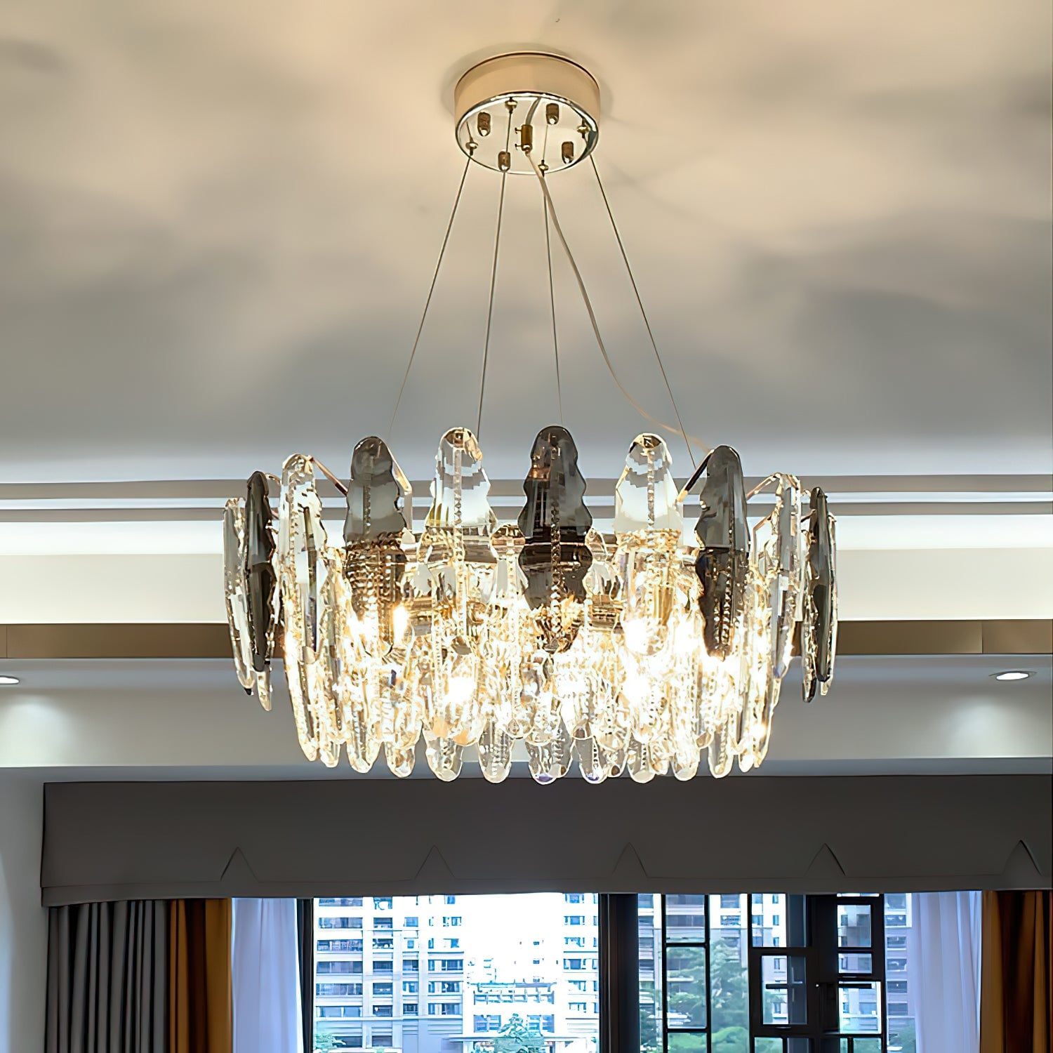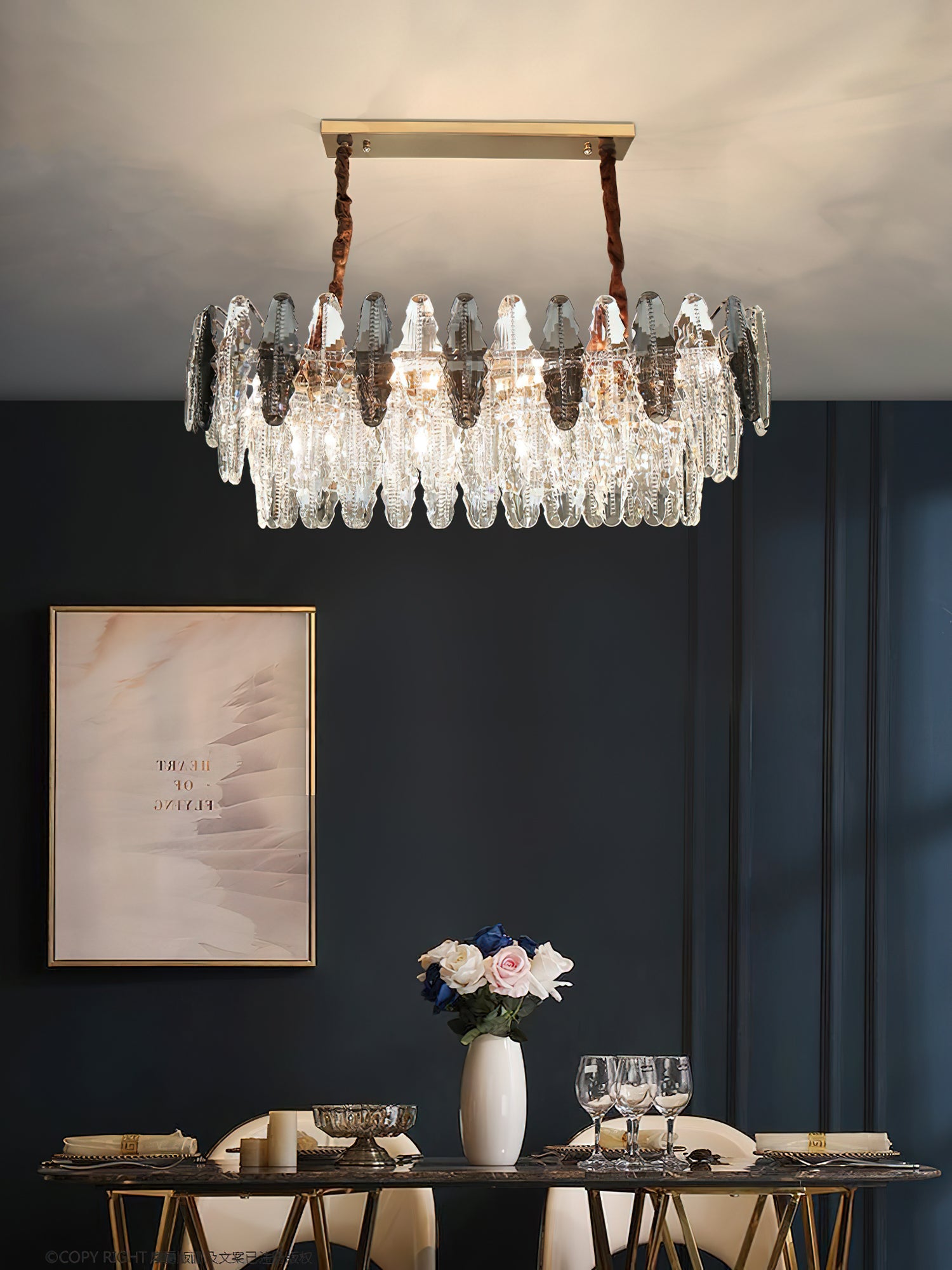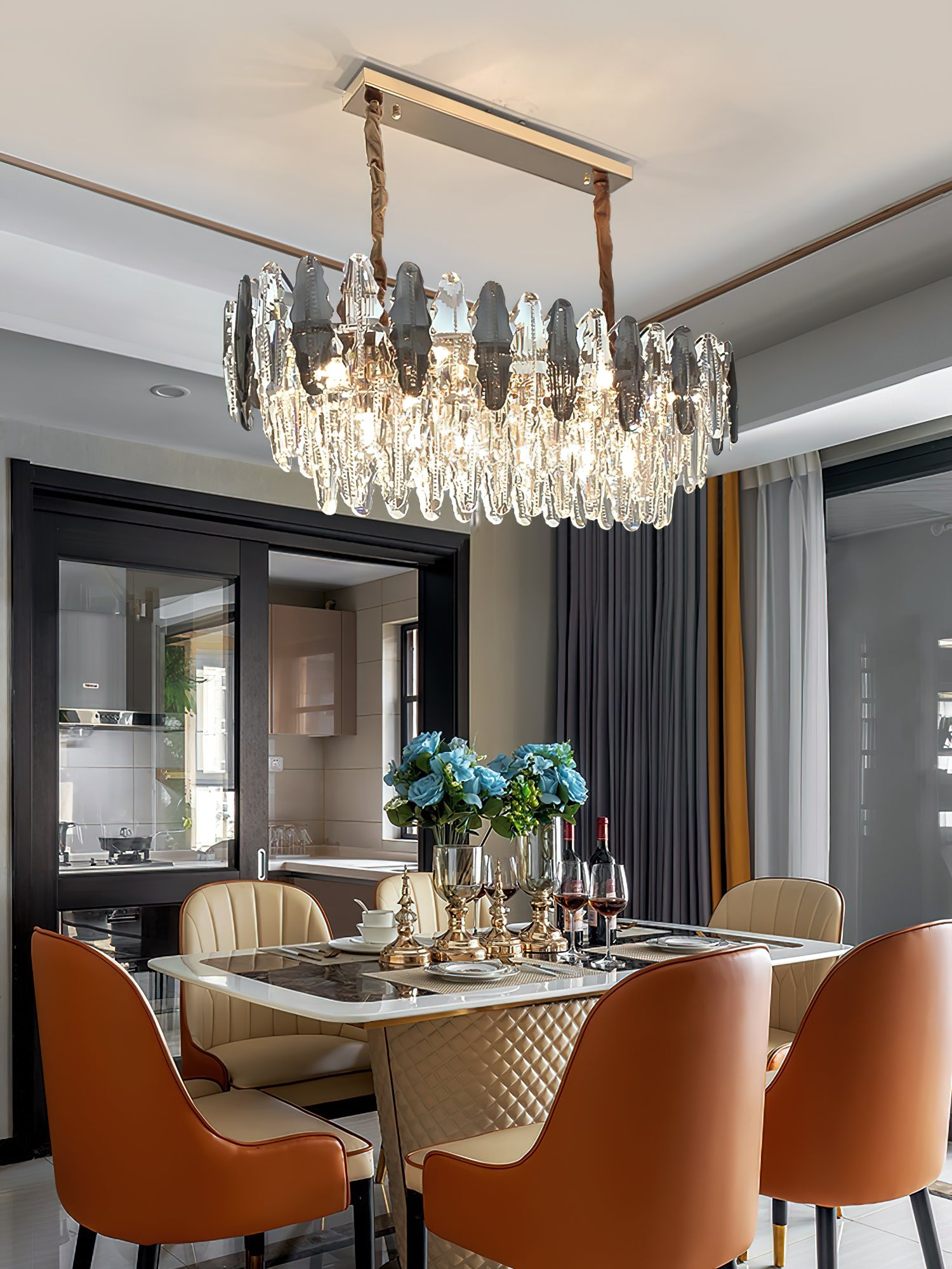 This stunning leaf shaped crystal chandelier has a luxurious design and is perfect for adding a touch of elegance to your living room, dining room or bedroom. Made of high-quality glass and metal, it adds sophistication and ambience to any space. The modern and sophisticated design is sure to be stunning, let the Leaf crystal chandelier bring luxurious light to your home.