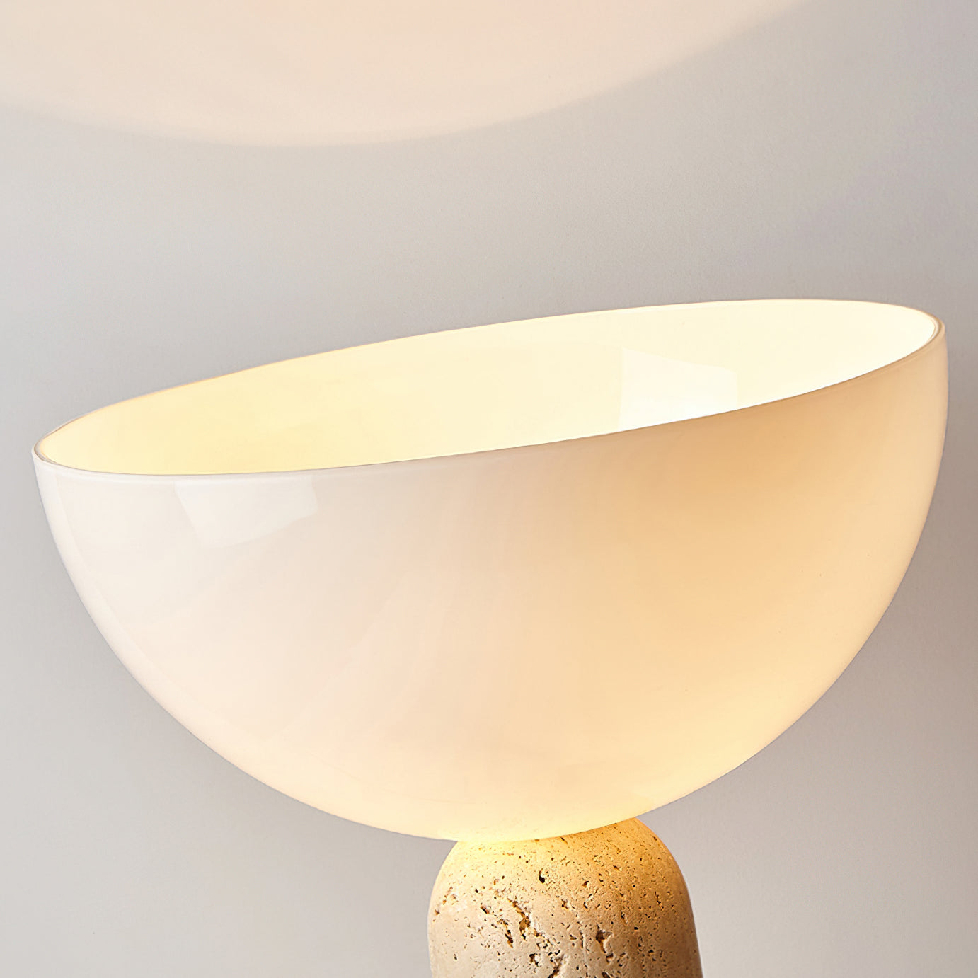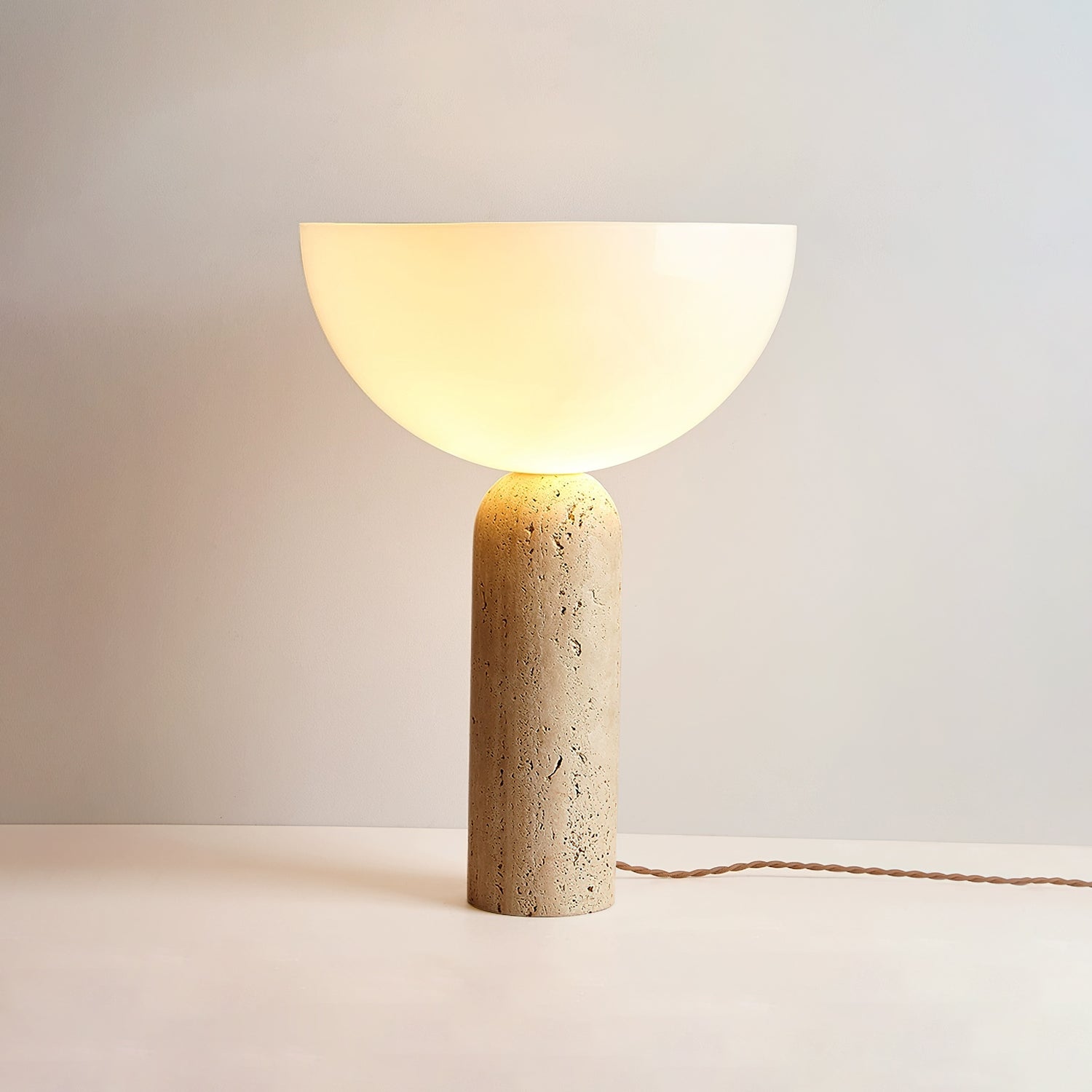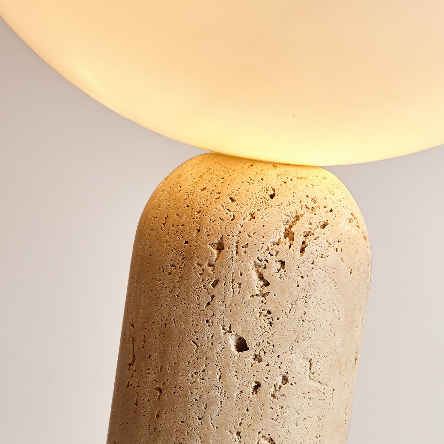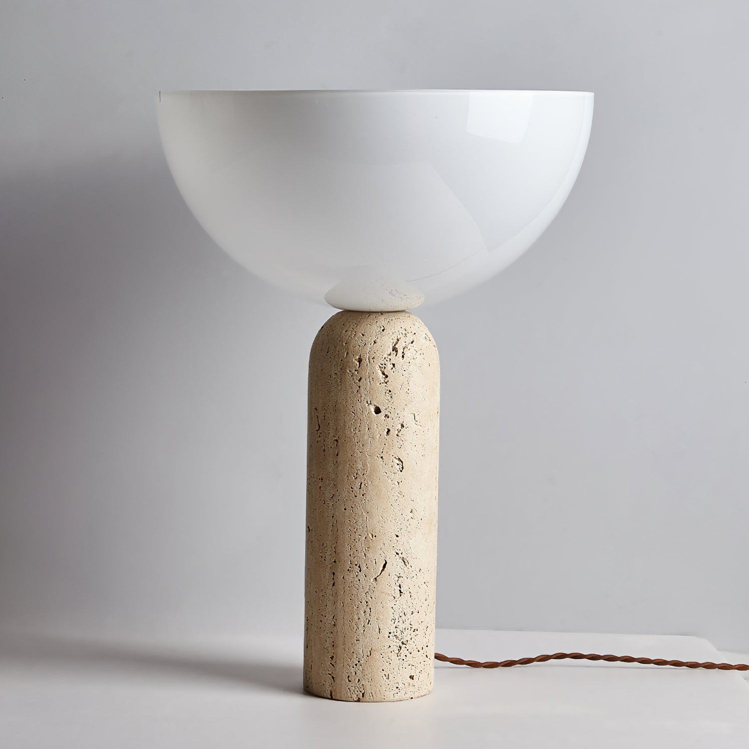The Lella Travertine Table Lamp by Mooijane features a cylindrical travertine base paired with a smooth white glass globe, blending natural texture with modern elegance. Designed to cast light upward, it offers soft, ambient illumination ideal for living rooms, bedrooms, or workspaces. A refined balance of organic material and contemporary form.