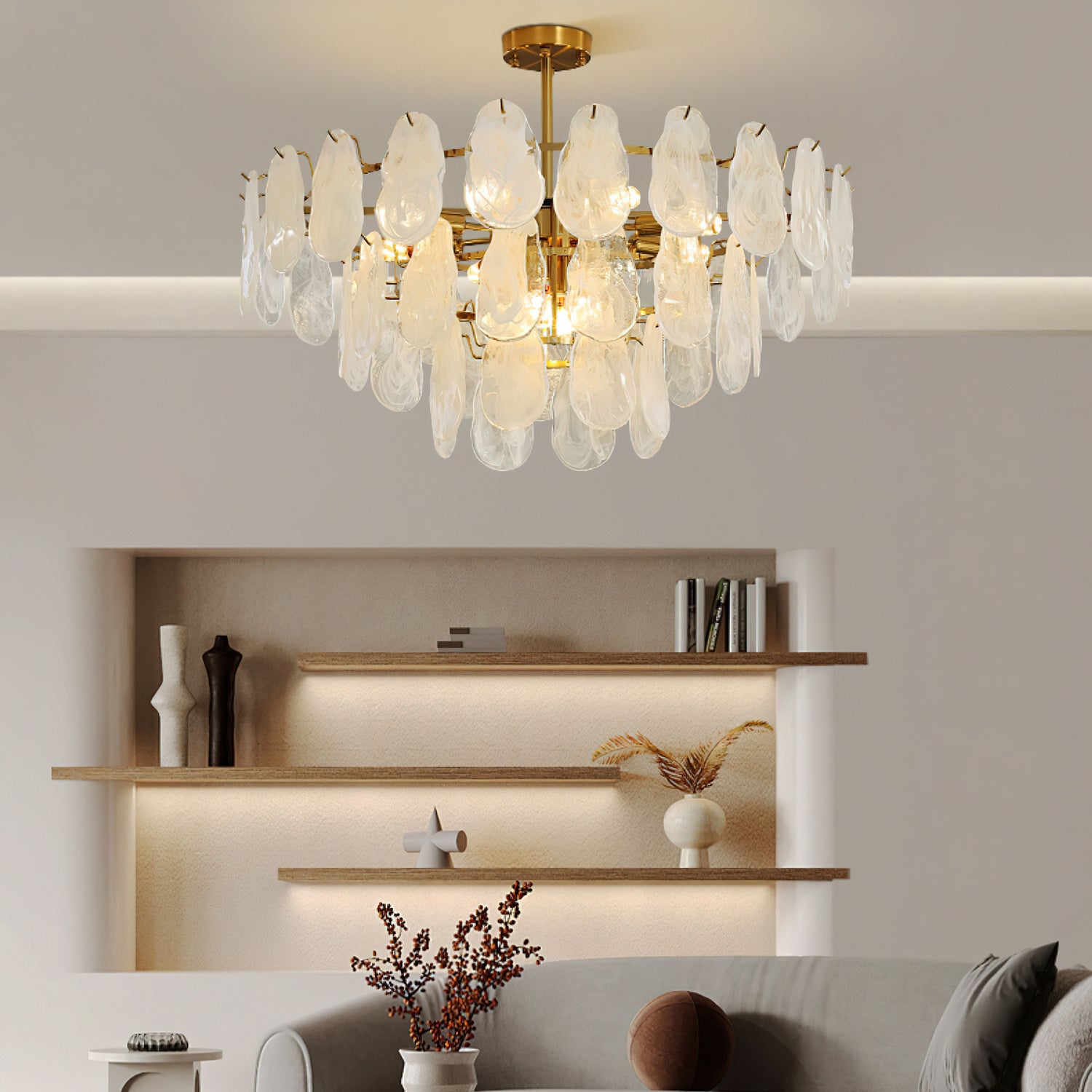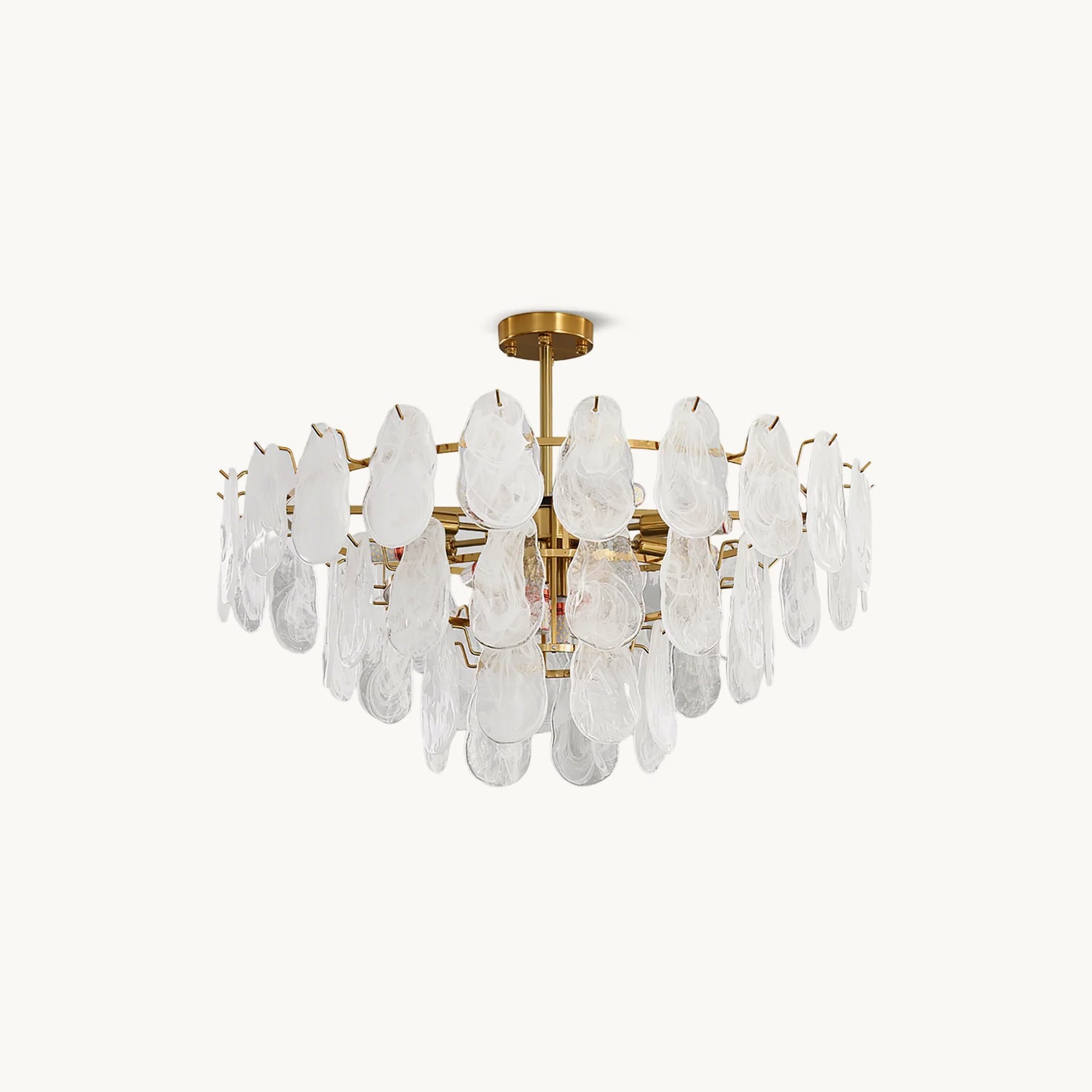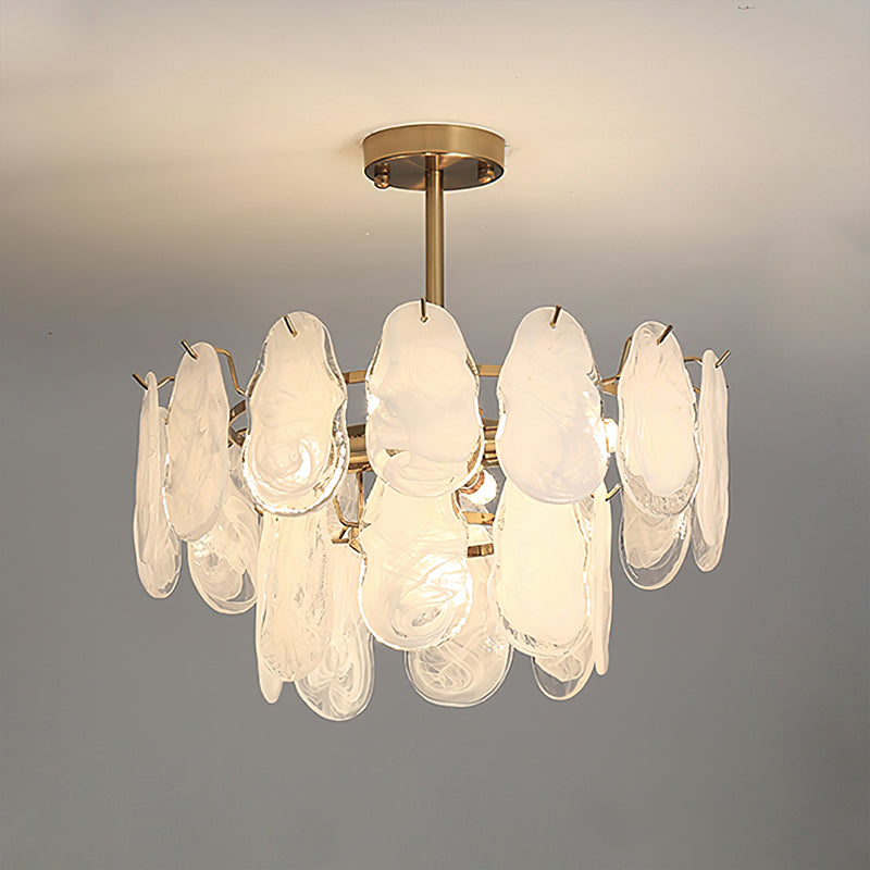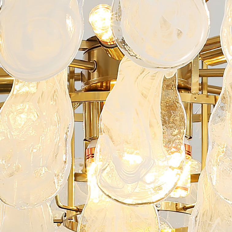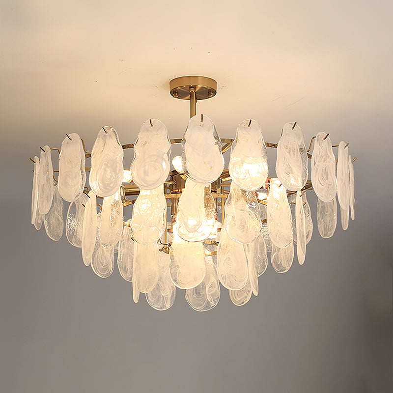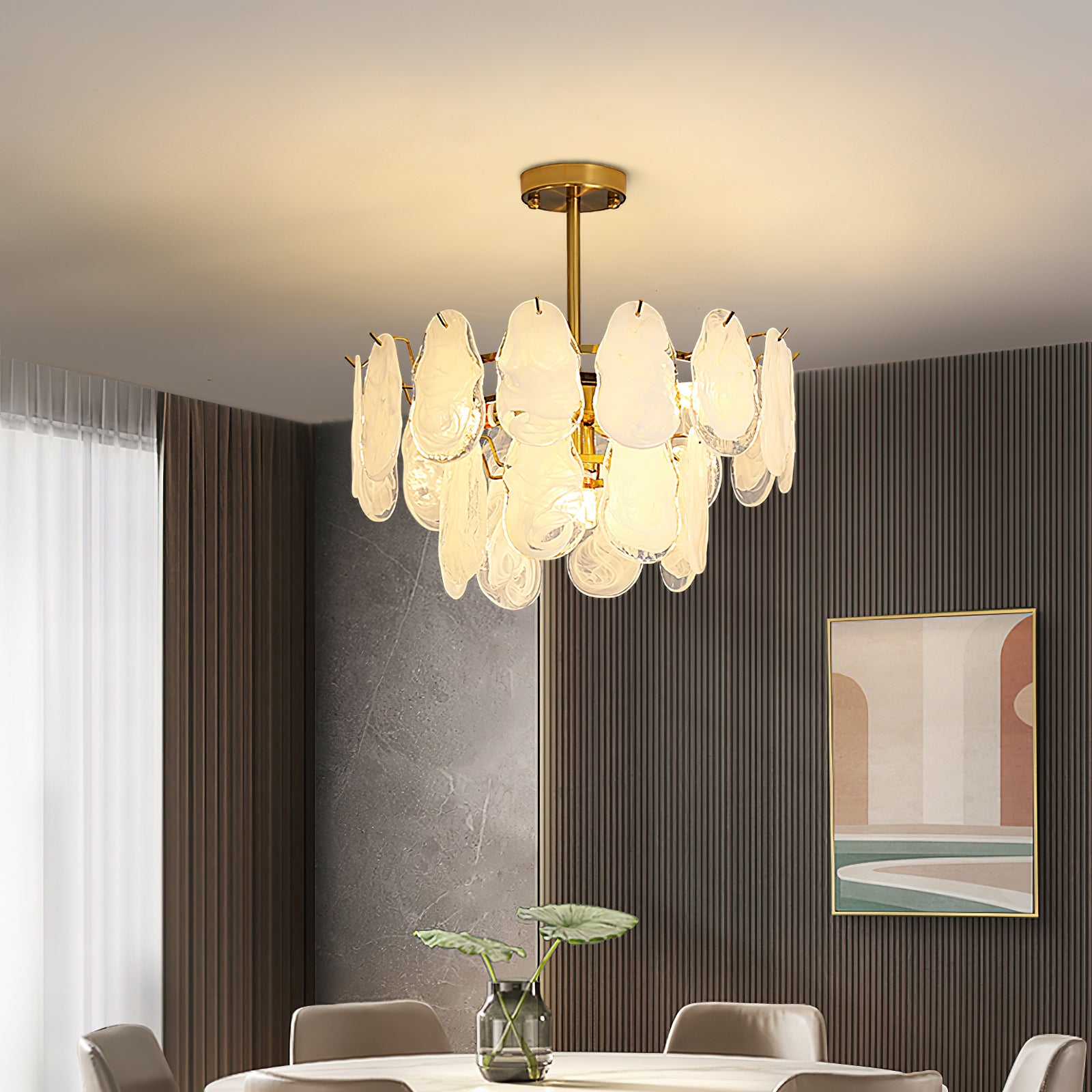 The Leon Chandelier by Mooijane exudes elegance with its unique oyster-shaped white glazed glass panels and gold finish. The soft diffused light from the multiple bulbs creates a warm and inviting atmosphere in any space. The chandelier features a high-quality wrought iron frame and translucent geometric glass layers to elevate your home decor.