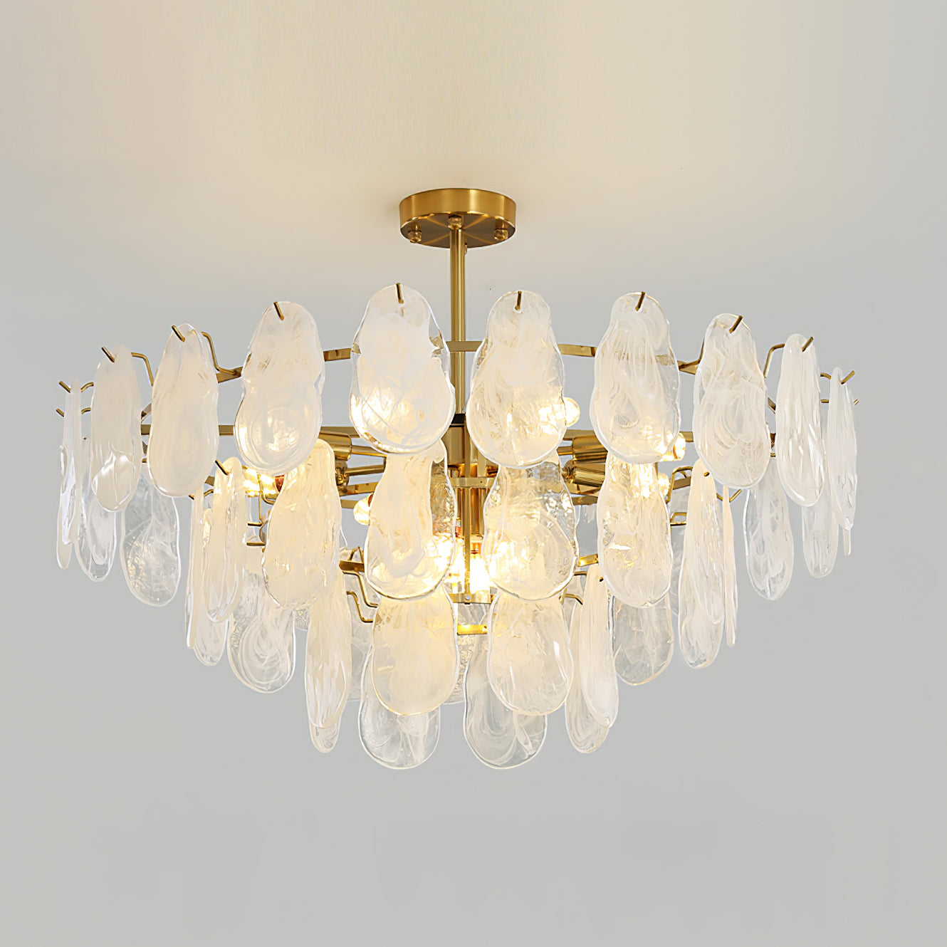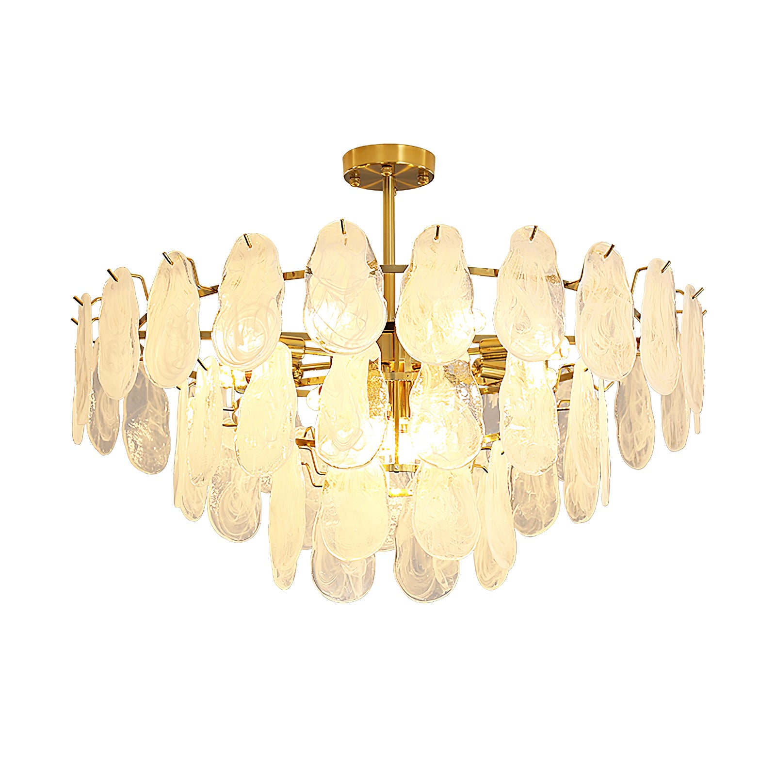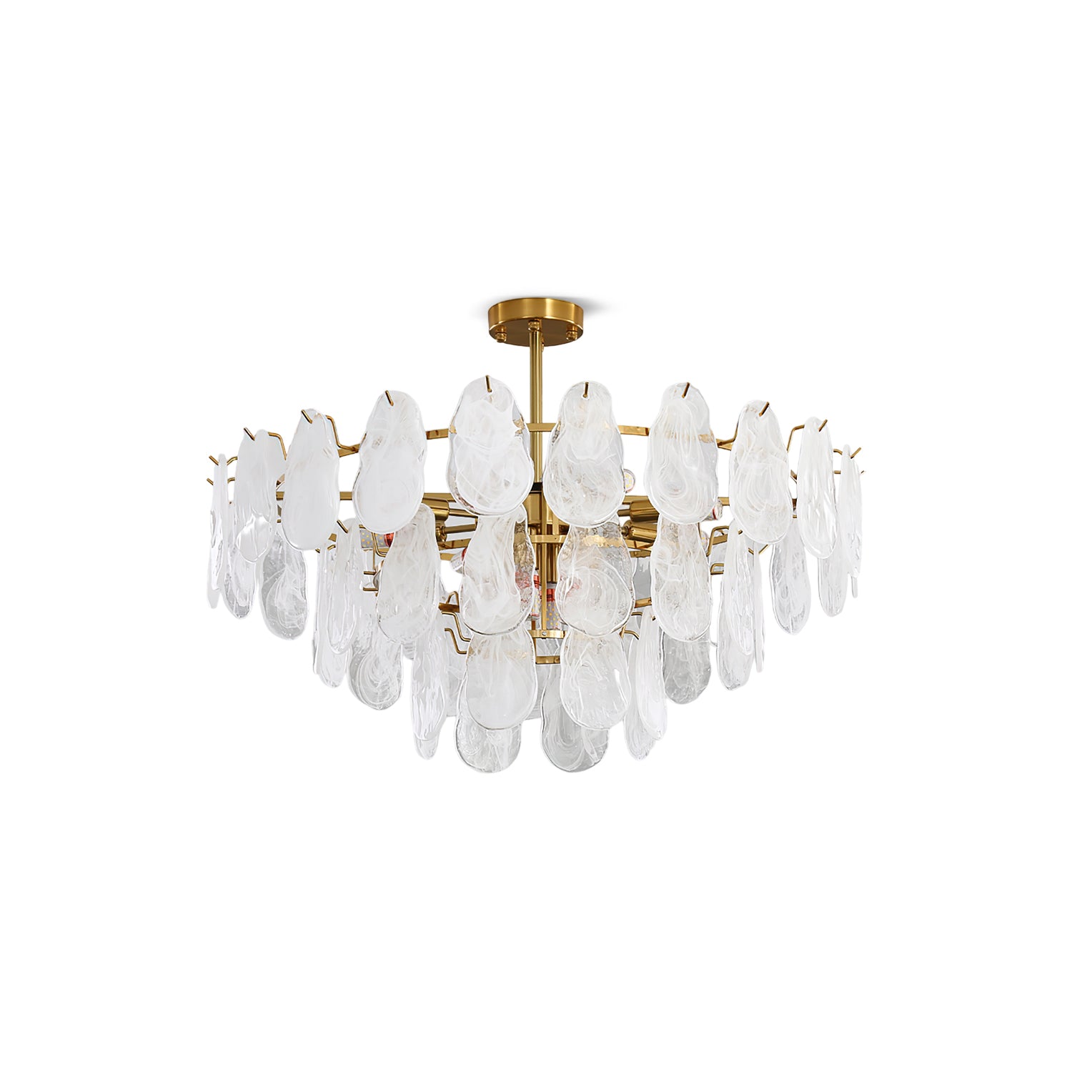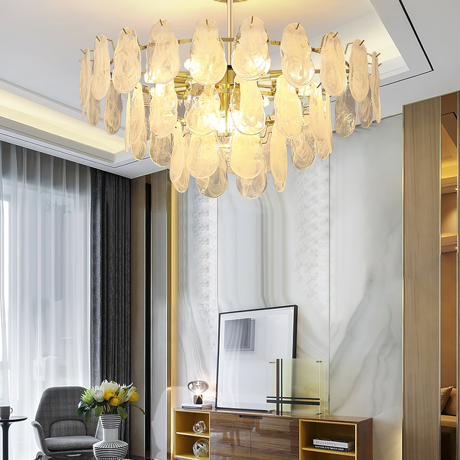 The Leon Chandelier by Mooijane exudes elegance with its unique oyster-shaped white glazed glass panels and gold finish. The soft diffused light from the multiple bulbs creates a warm and inviting atmosphere in any space. The chandelier features a high-quality wrought iron frame and translucent geometric glass layers to elevate your home decor.