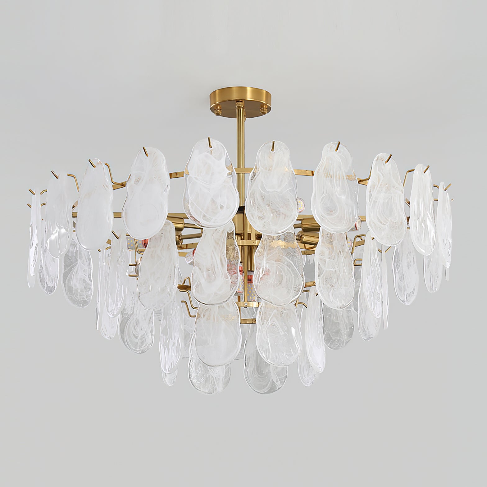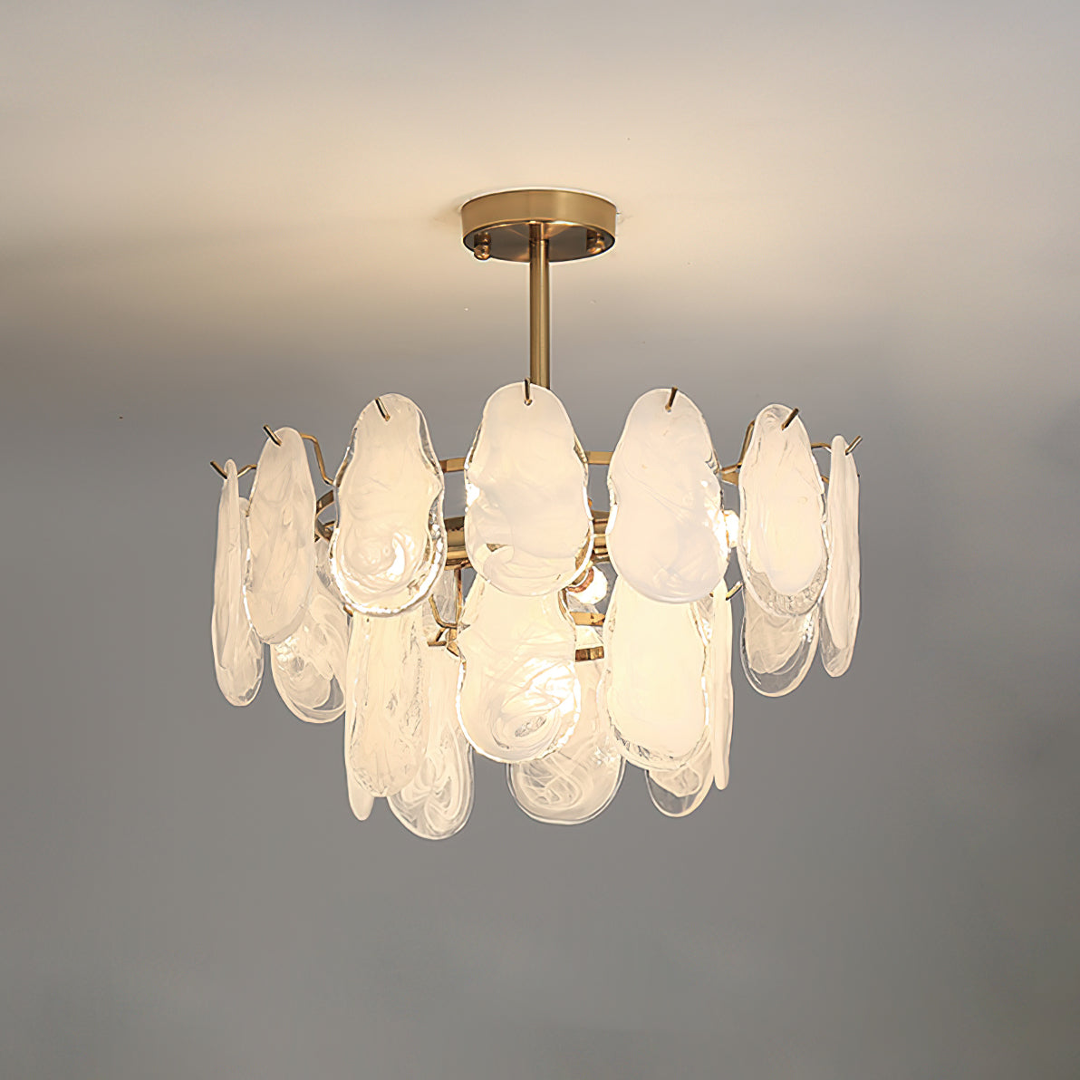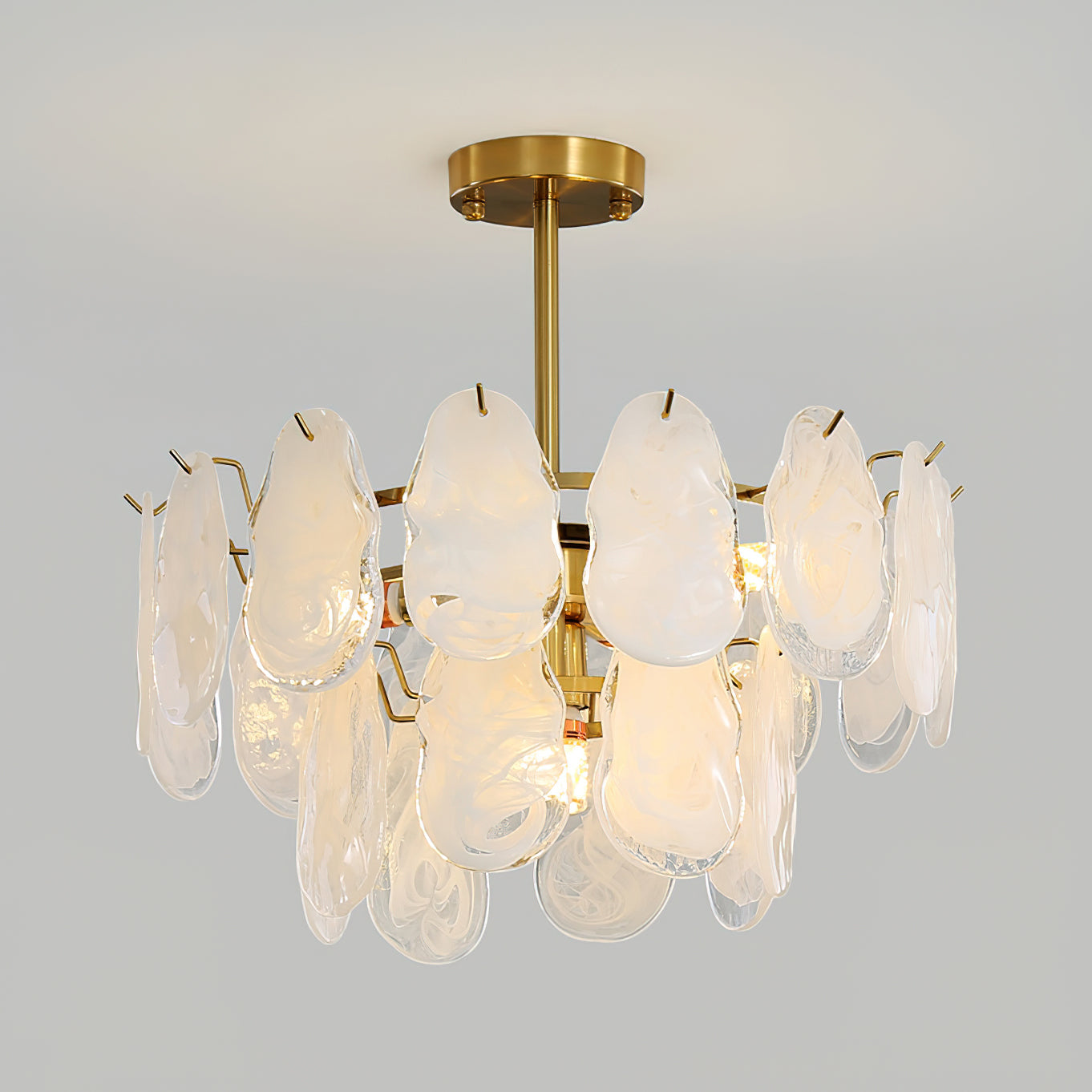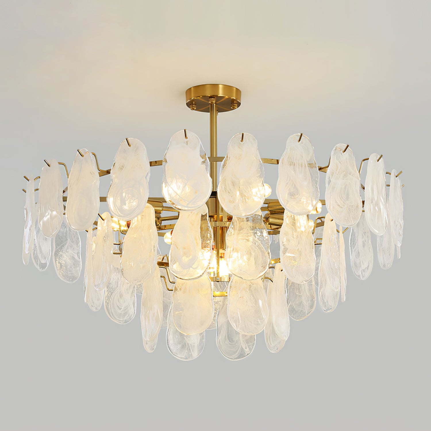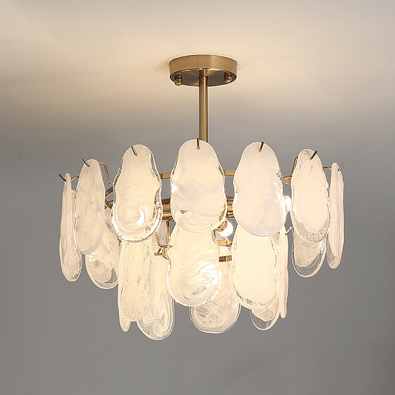 The Leon Chandelier by Mooijane exudes elegance with its unique oyster-shaped white glazed glass panels and gold finish. The soft diffused light from the multiple bulbs creates a warm and inviting atmosphere in any space. The chandelier features a high-quality wrought iron frame and translucent geometric glass layers to elevate your home decor.