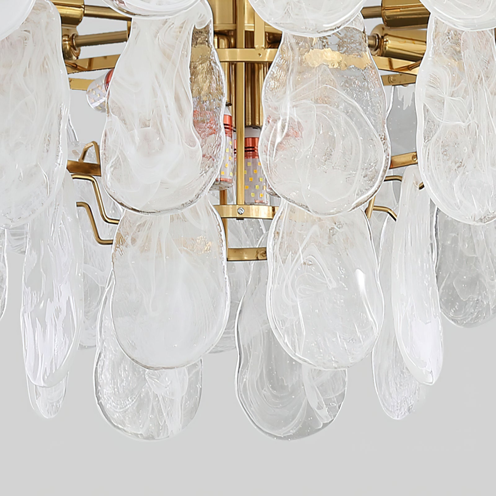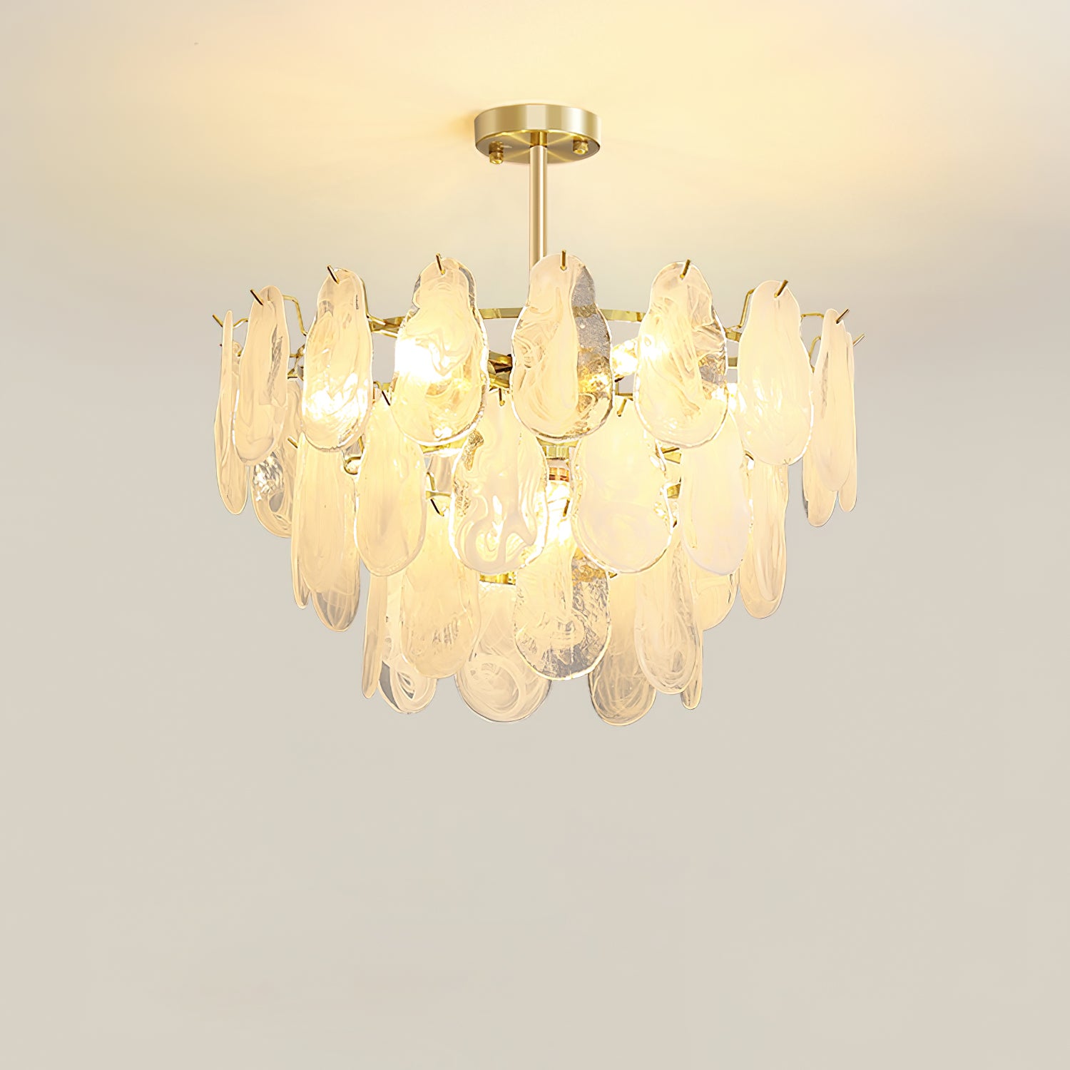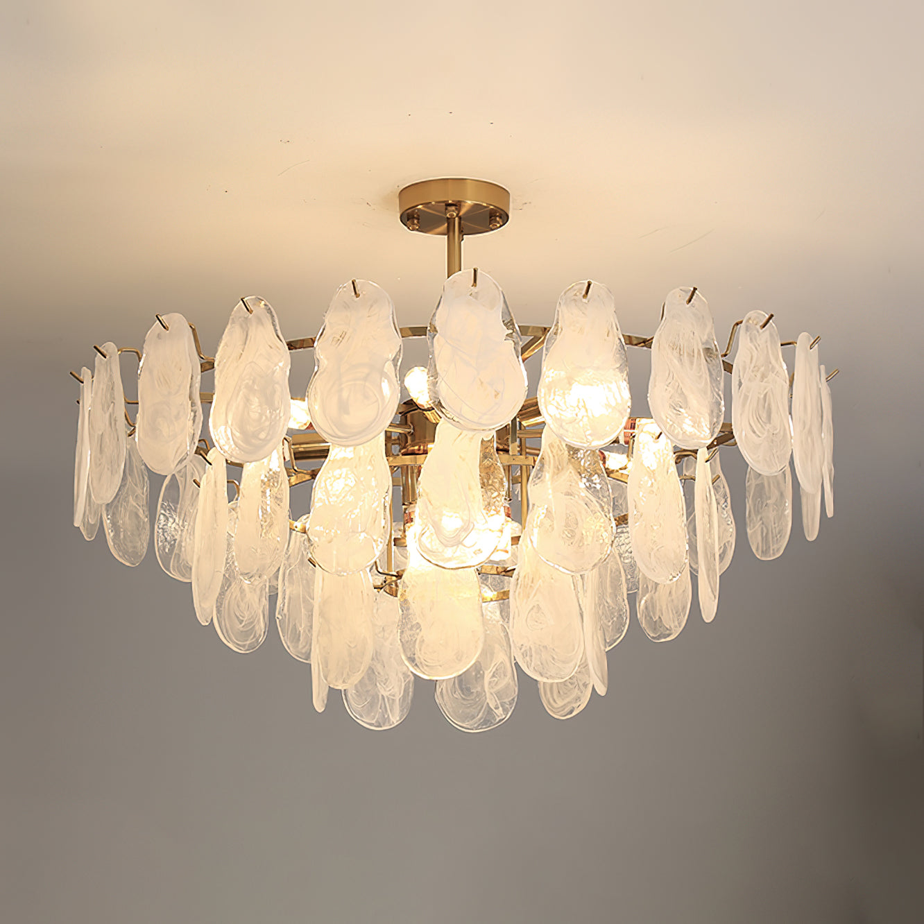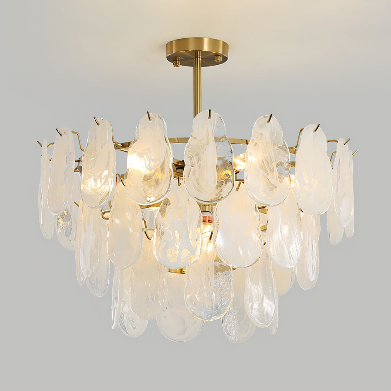 The Leon Chandelier by Mooijane exudes elegance with its unique oyster-shaped white glazed glass panels and gold finish. The soft diffused light from the multiple bulbs creates a warm and inviting atmosphere in any space. The chandelier features a high-quality wrought iron frame and translucent geometric glass layers to elevate your home decor.