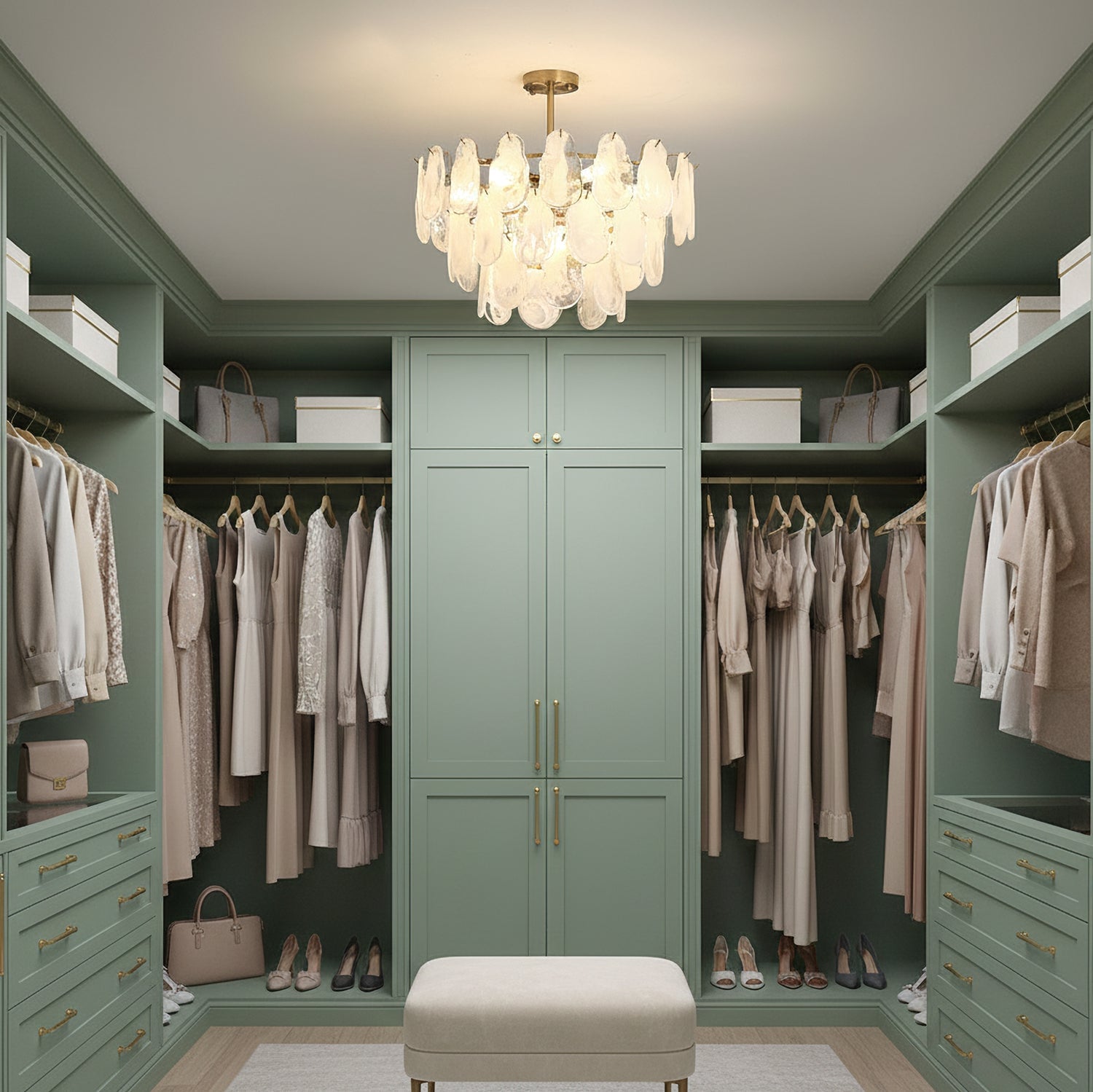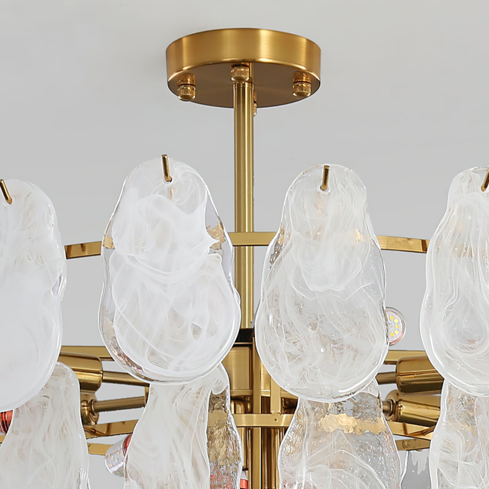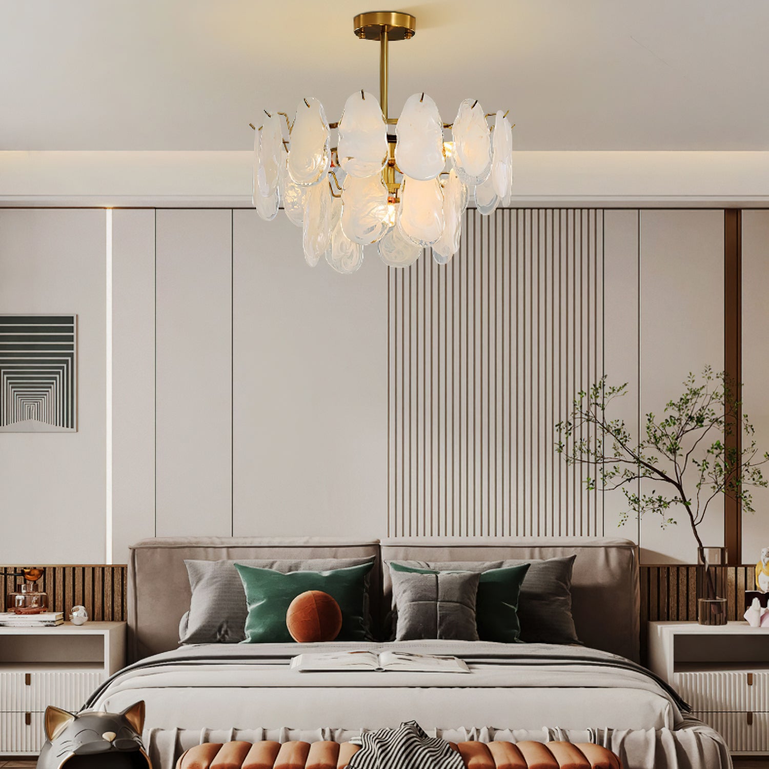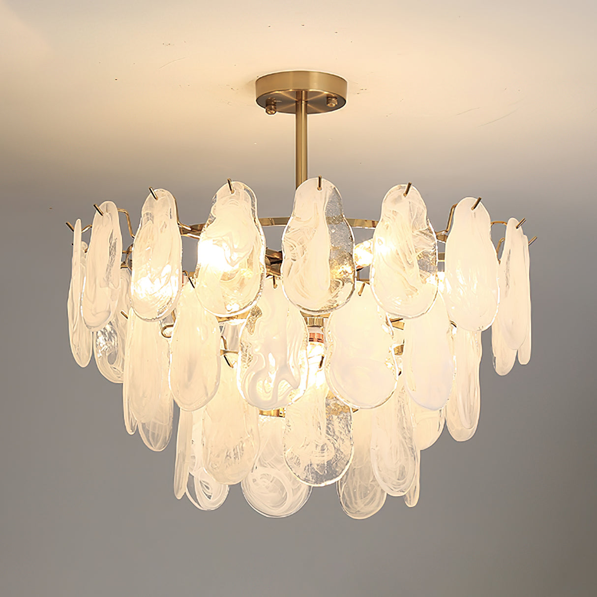 The Leon Chandelier by Mooijane exudes elegance with its unique oyster-shaped white glazed glass panels and gold finish. The soft diffused light from the multiple bulbs creates a warm and inviting atmosphere in any space. The chandelier features a high-quality wrought iron frame and translucent geometric glass layers to elevate your home decor.