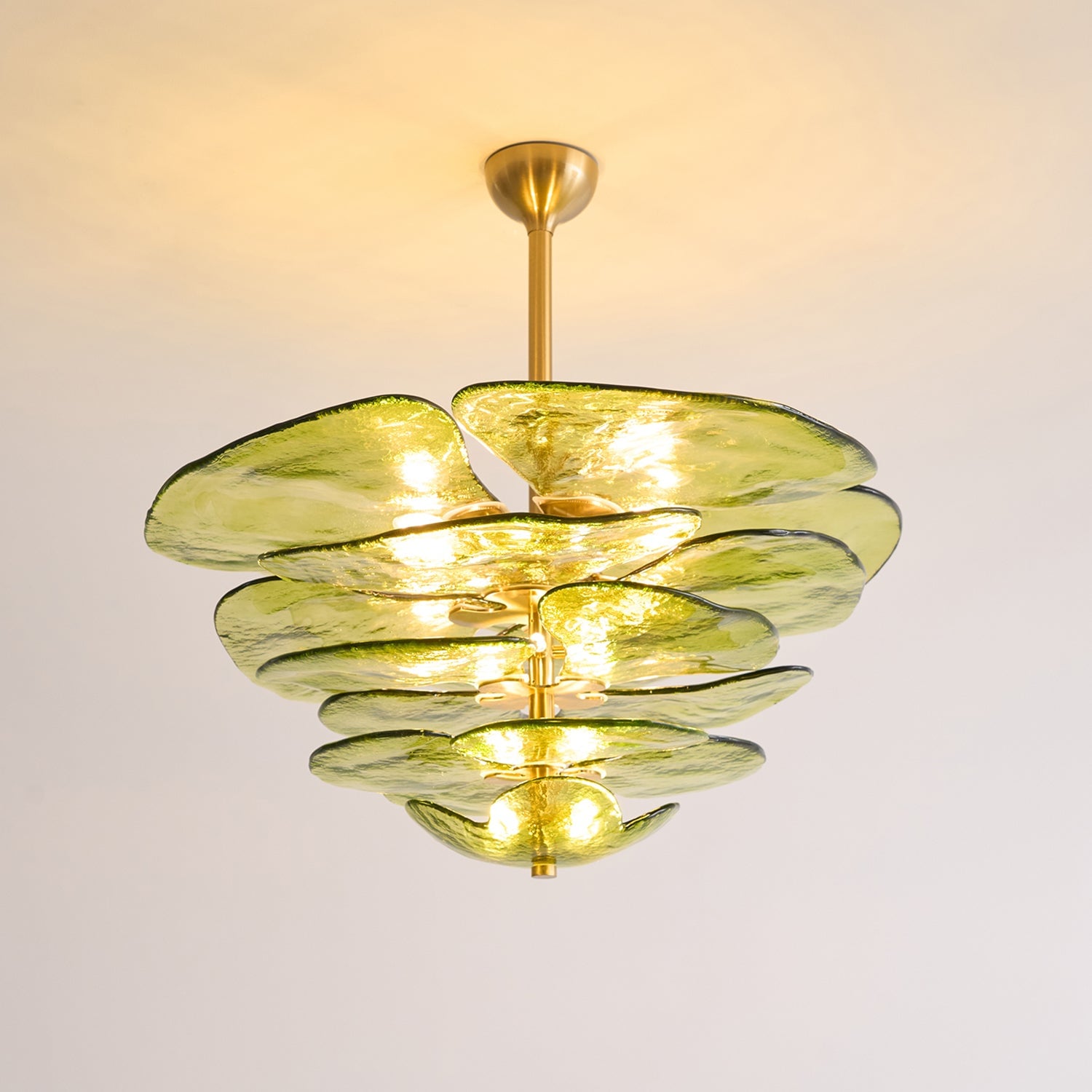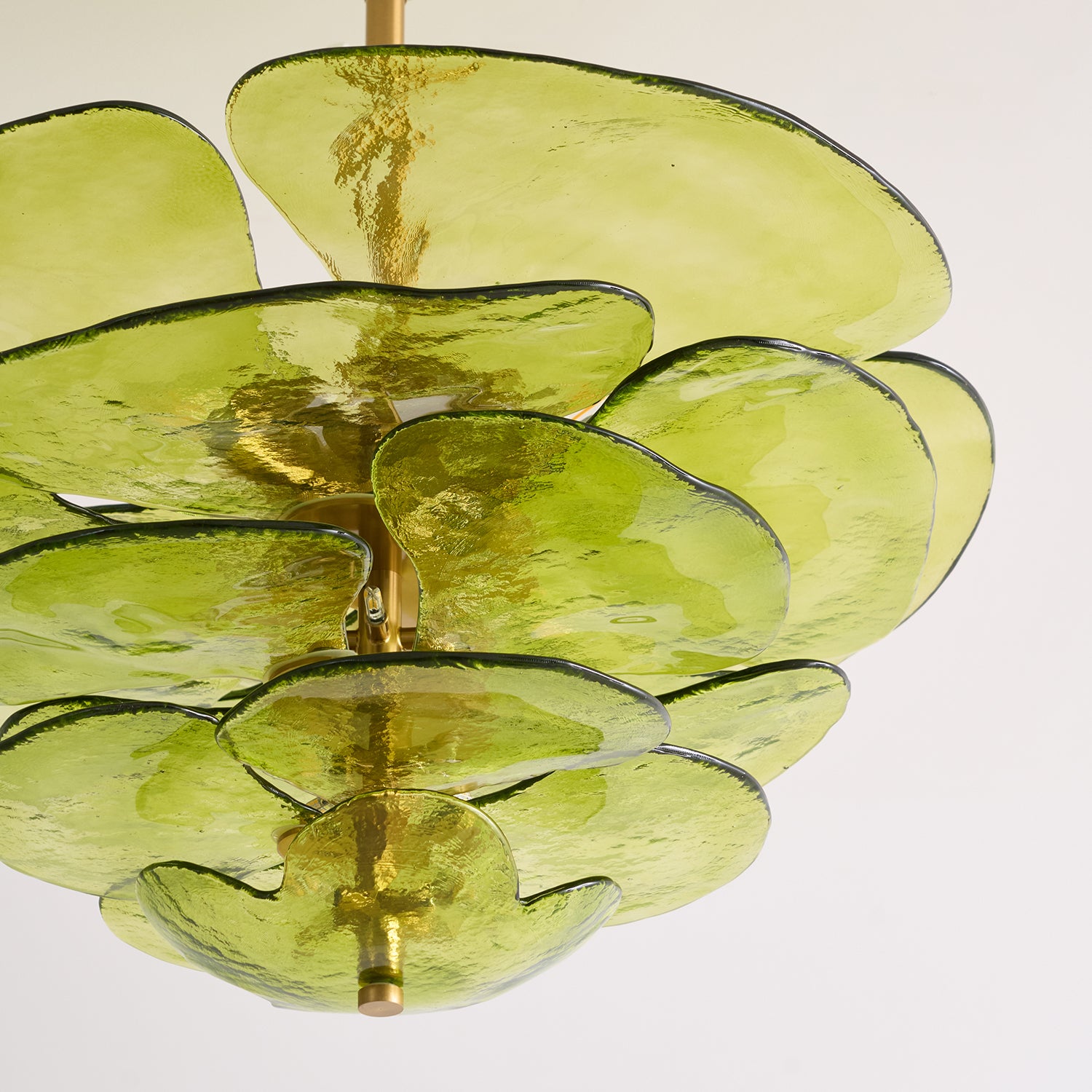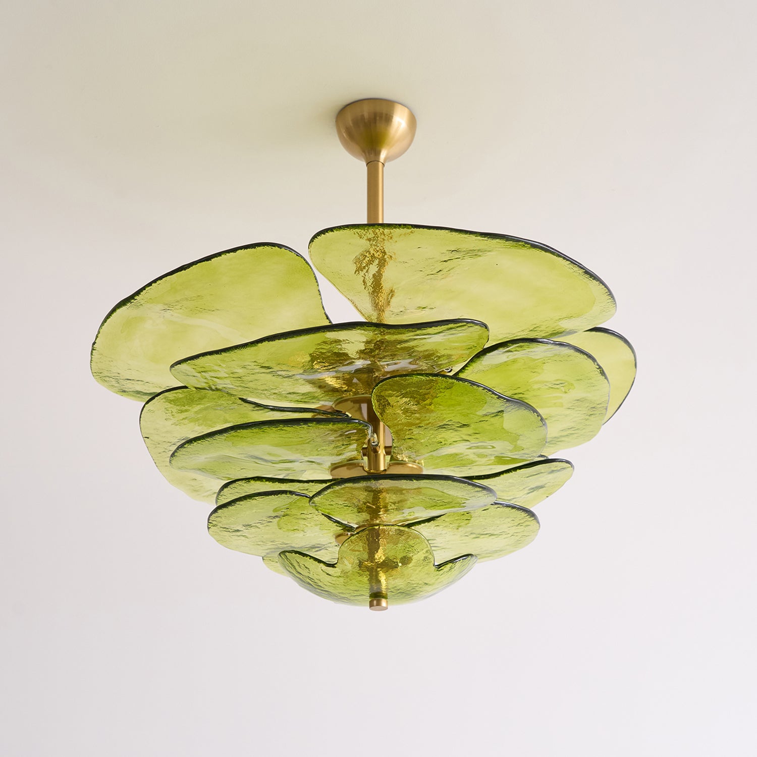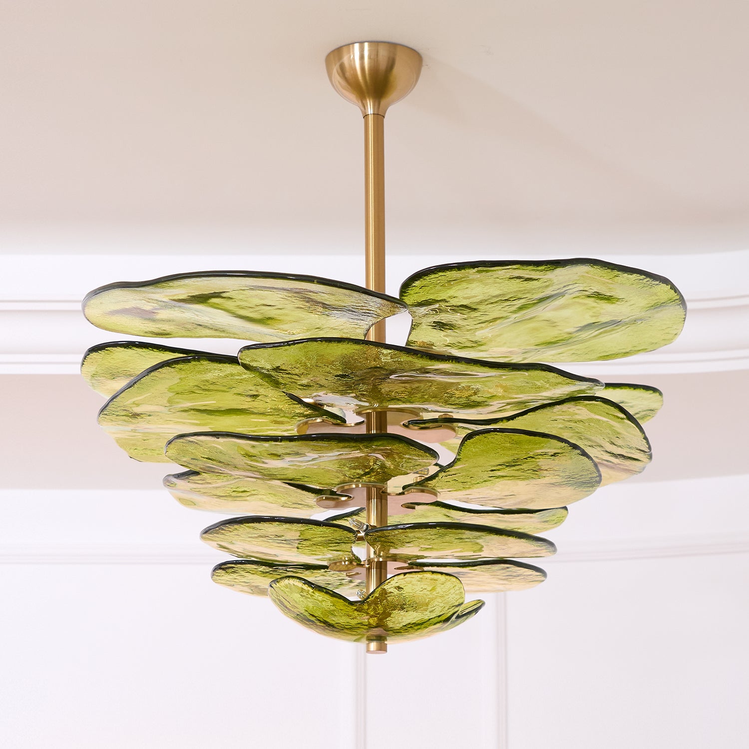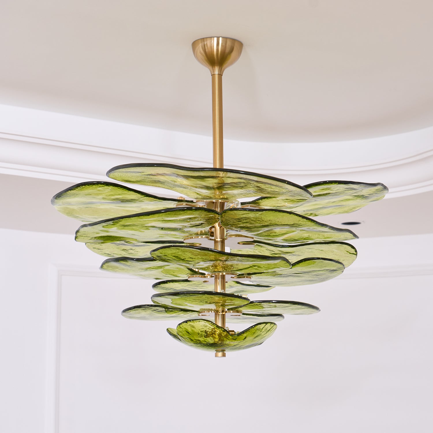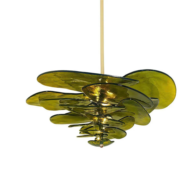 Experience a stunning blend of art and light with the Lilypad Glass Chandelier from Mooijane. Delicate glass "lilypads" create a unique interplay of light and shadow, available in various colors. Elevate any space with this elegant and modern design that combines functional lighting with striking beauty.