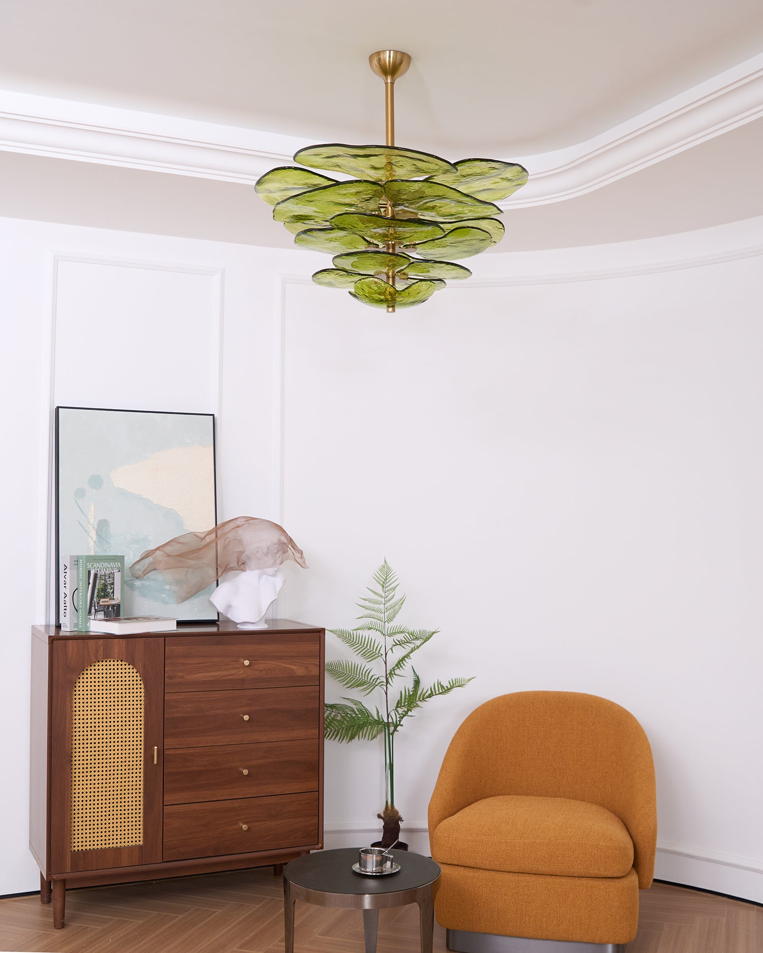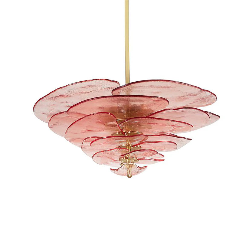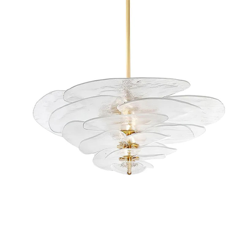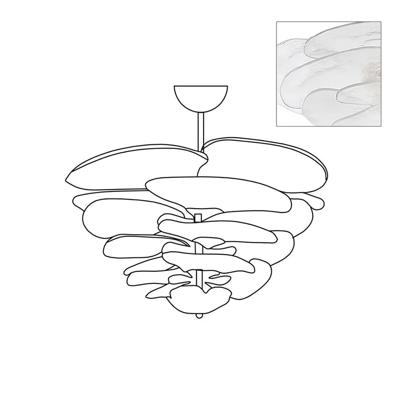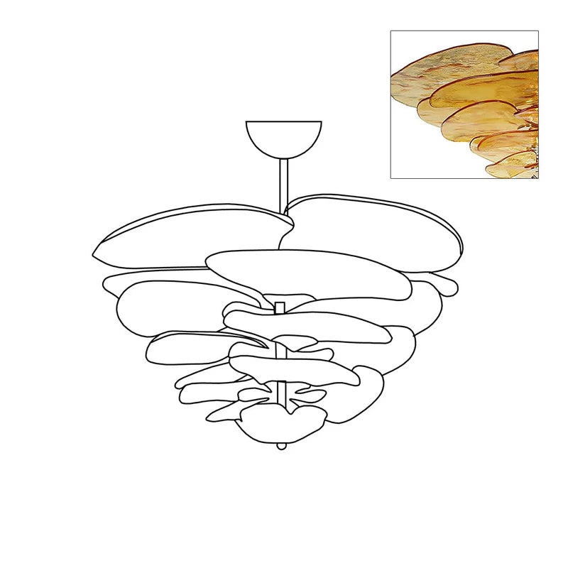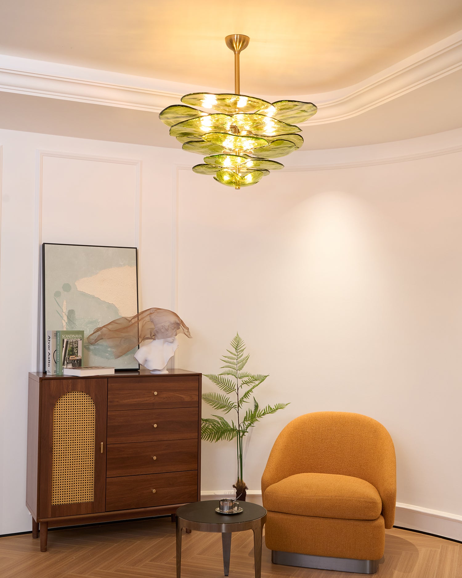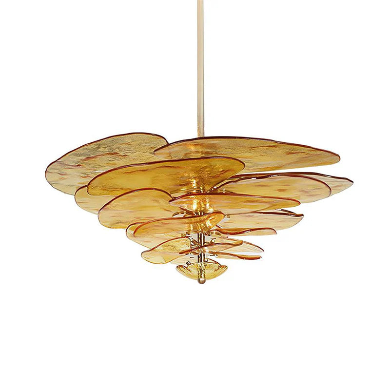 Experience a stunning blend of art and light with the Lilypad Glass Chandelier from Mooijane. Delicate glass "lilypads" create a unique interplay of light and shadow, available in various colors. Elevate any space with this elegant and modern design that combines functional lighting with striking beauty.