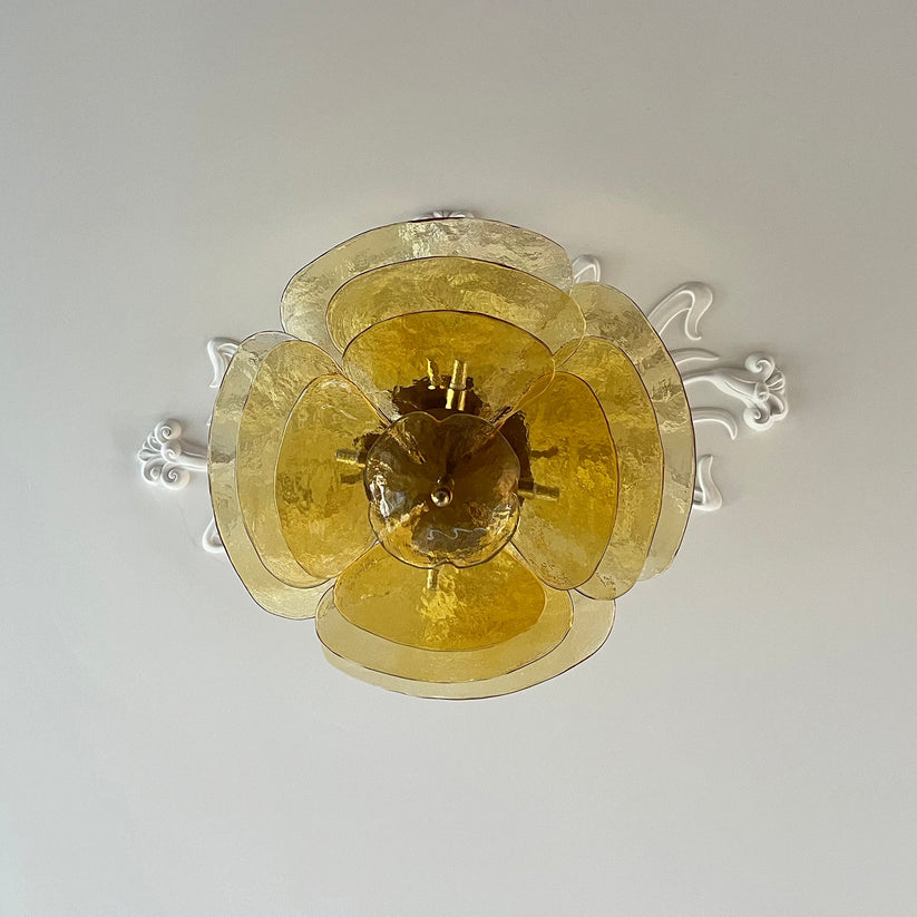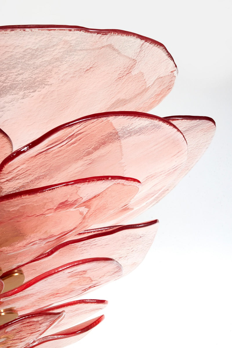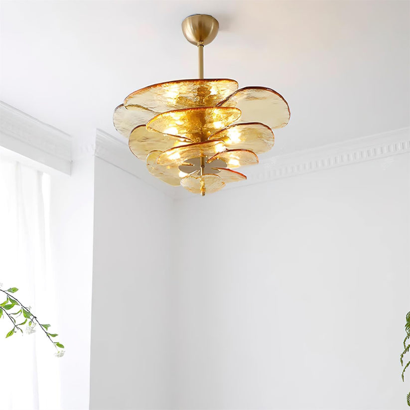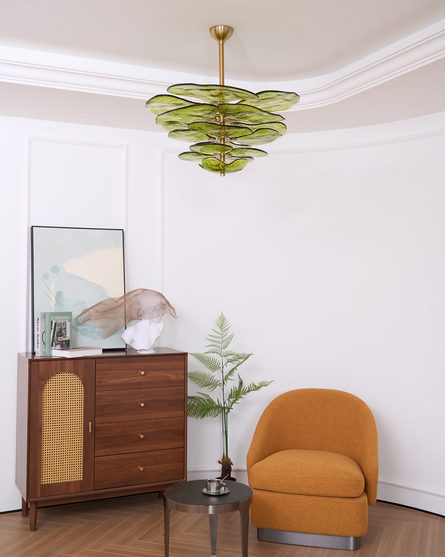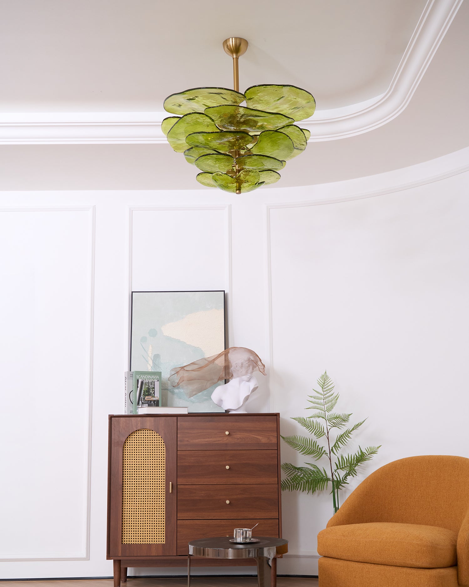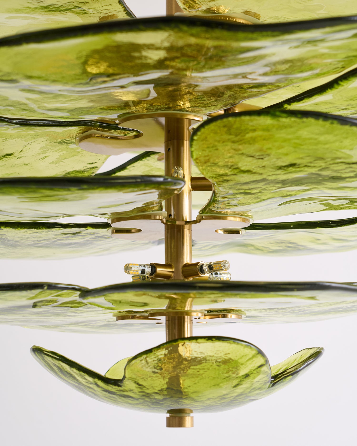 Experience a stunning blend of art and light with the Lilypad Glass Chandelier from Mooijane. Delicate glass "lilypads" create a unique interplay of light and shadow, available in various colors. Elevate any space with this elegant and modern design that combines functional lighting with striking beauty.