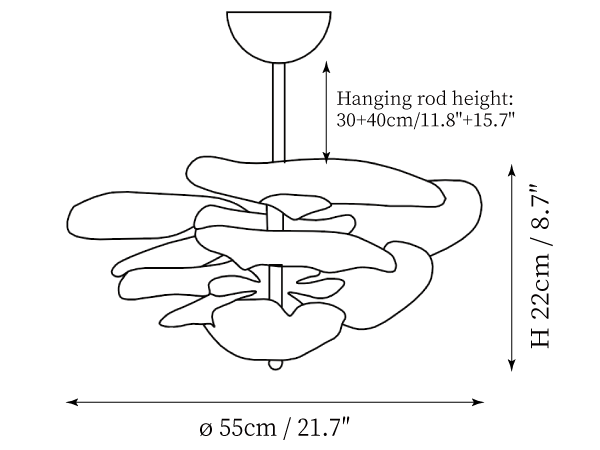 - Dia 55cm x H 22cm / ∅ 21.7″ x H 8.7" (Weight: 10KG/22 Ibs), (E14 bulbs x 8 pieces)