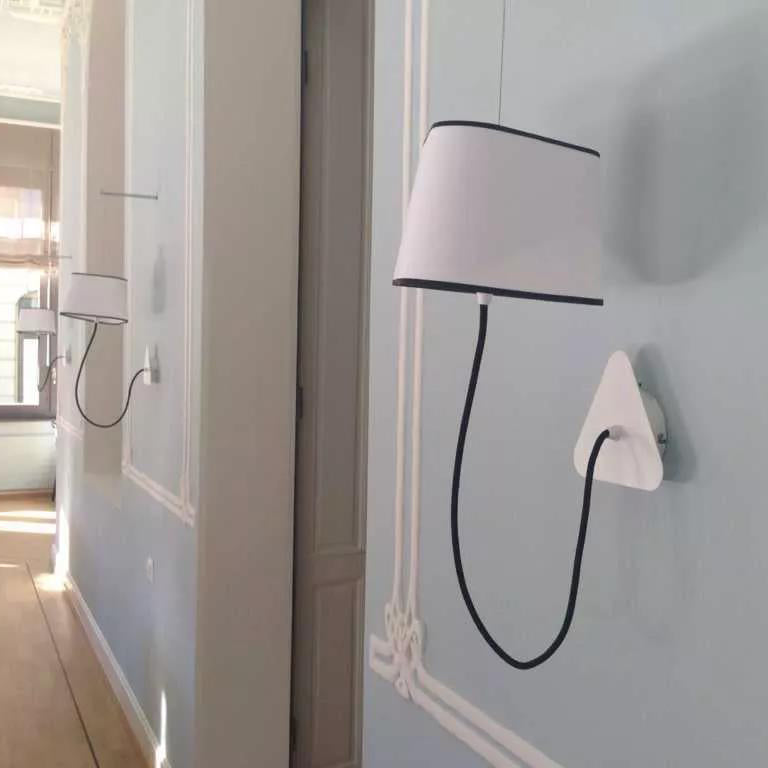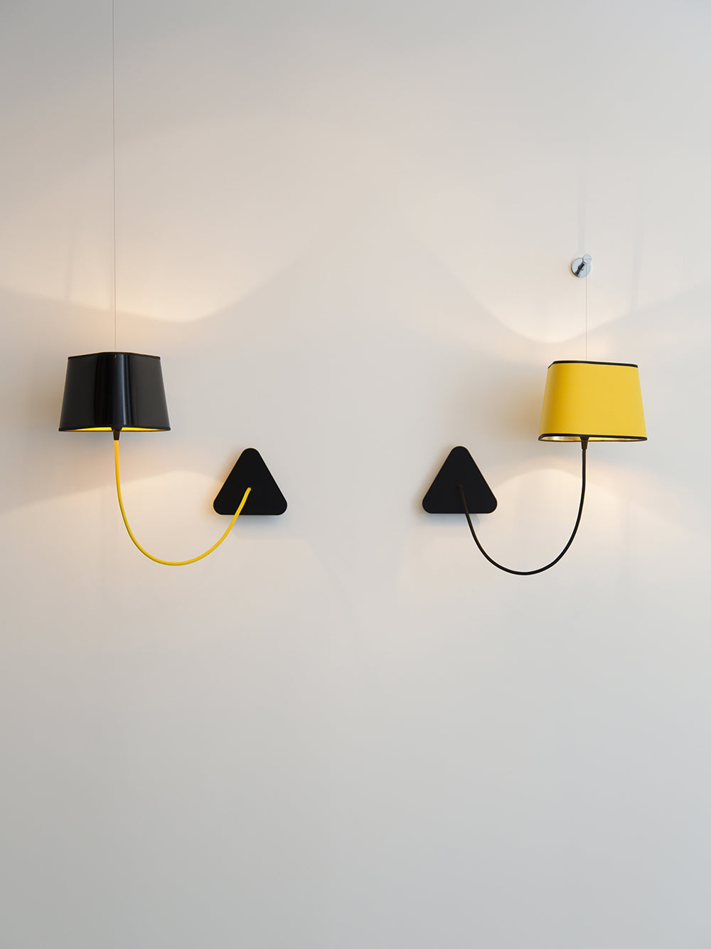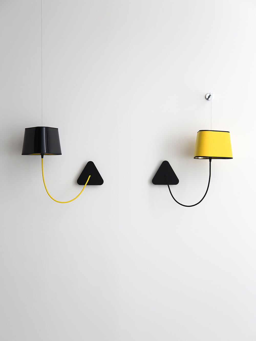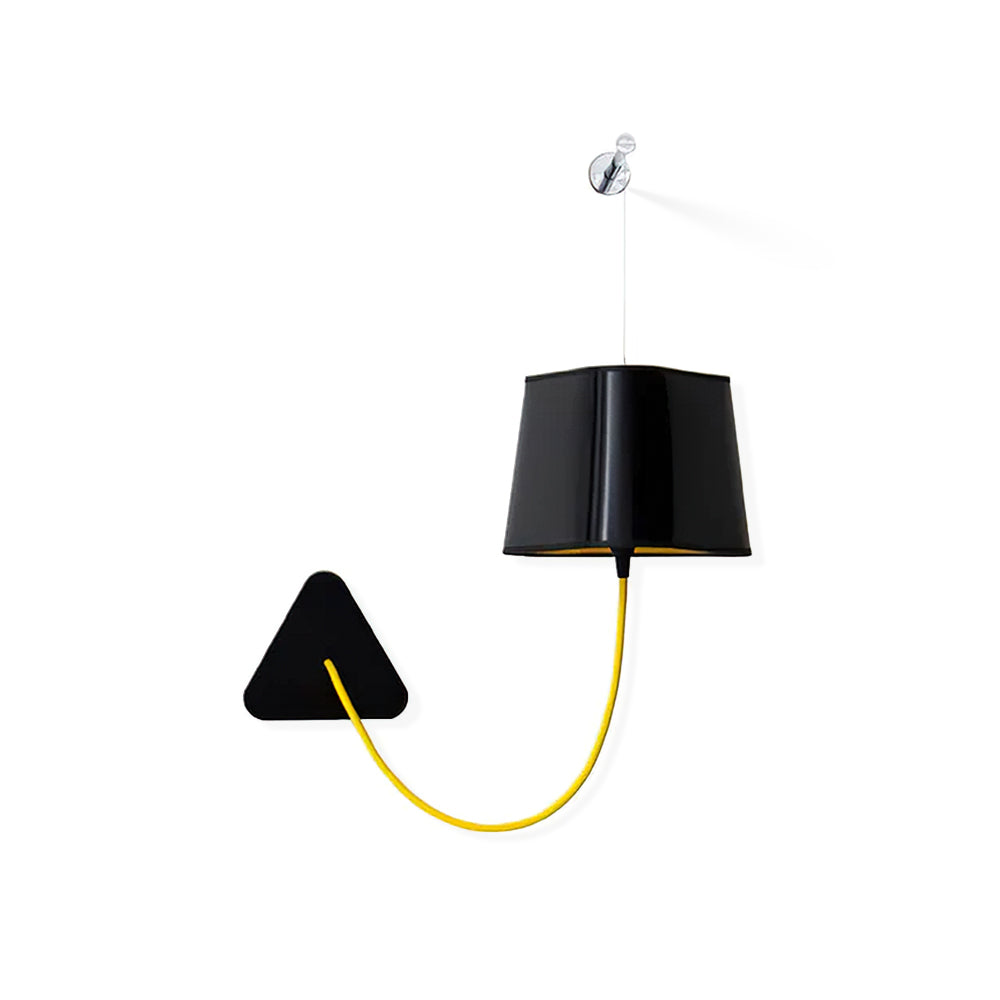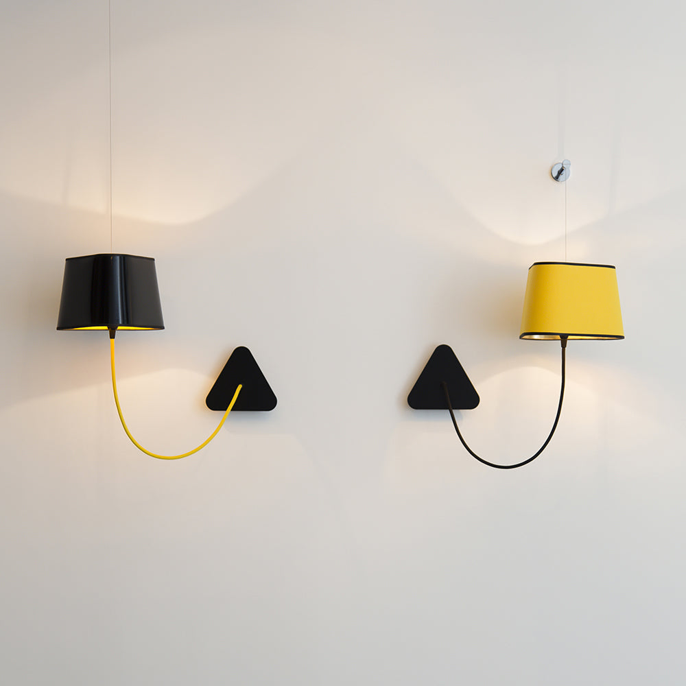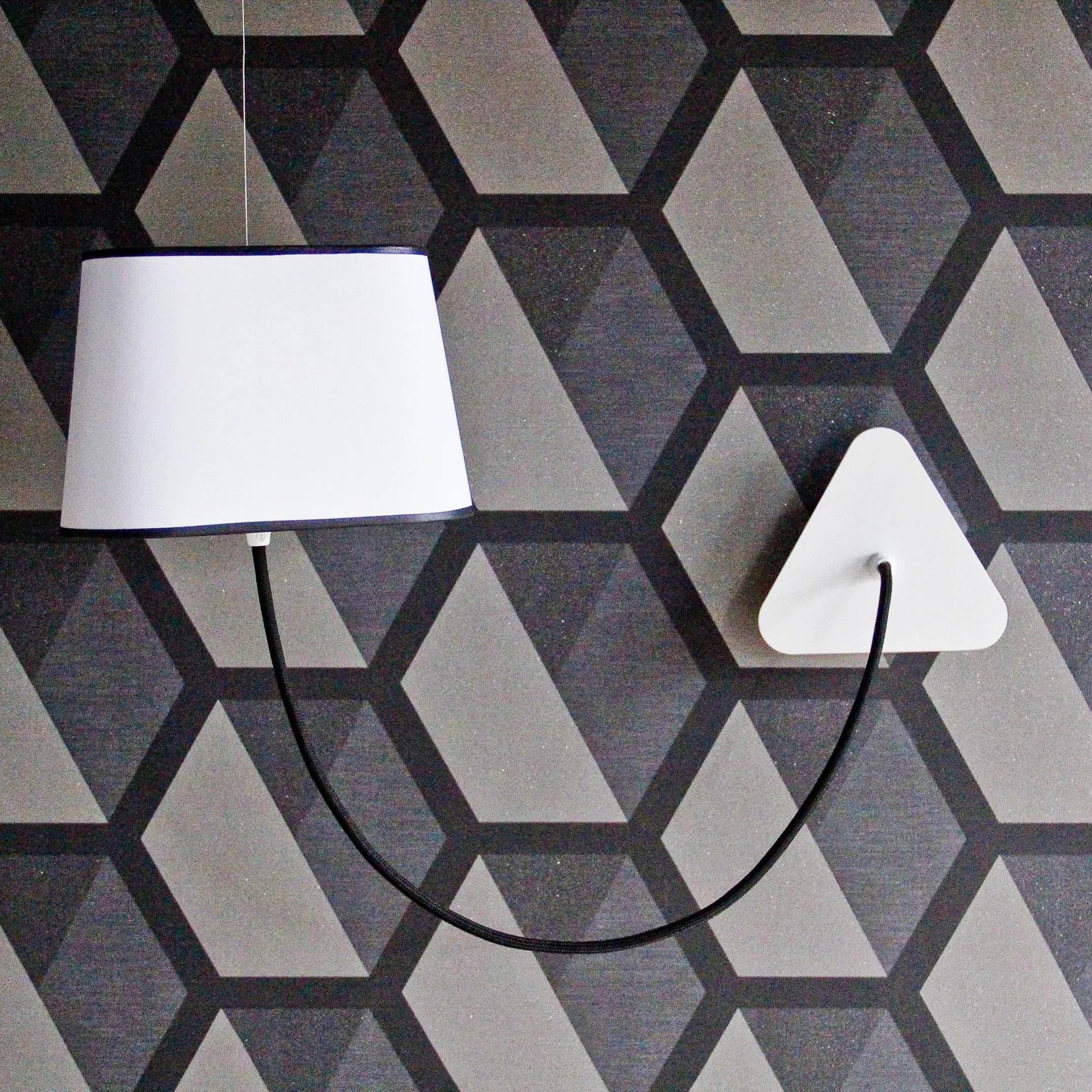A small wall lamp is composed of a lampshade, a woven power cable, a ceiling fixing, and an adjustable steel suspension cable. Simplicity and purity of lines are the keywords for this practical and modular wall lamp. The triangular lampshade produces a very particular light, cutting out space in an architectural way. Its advantage: flexibility in the choice of its location thanks to the modularity of its height.