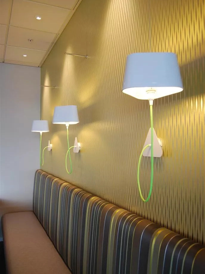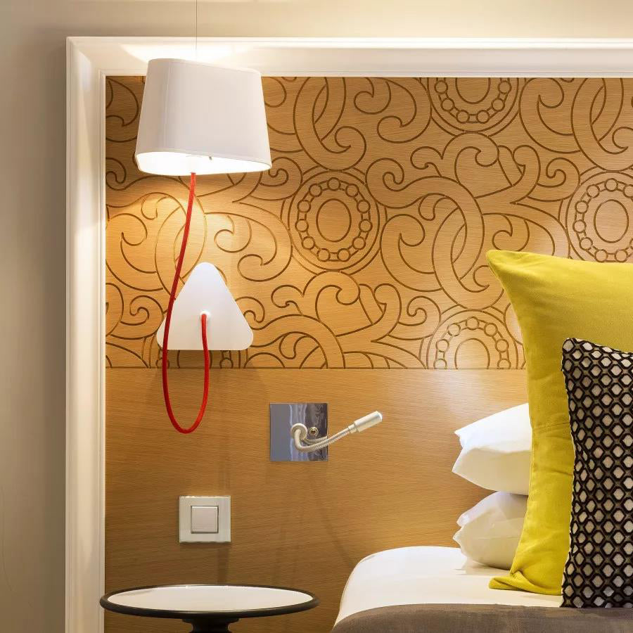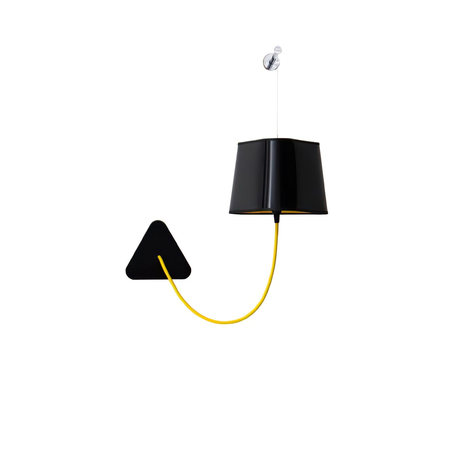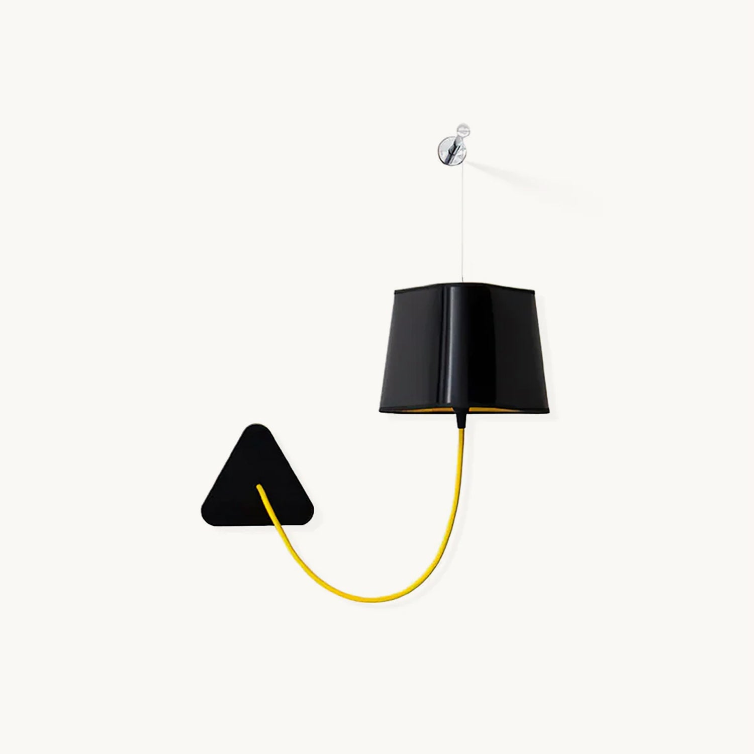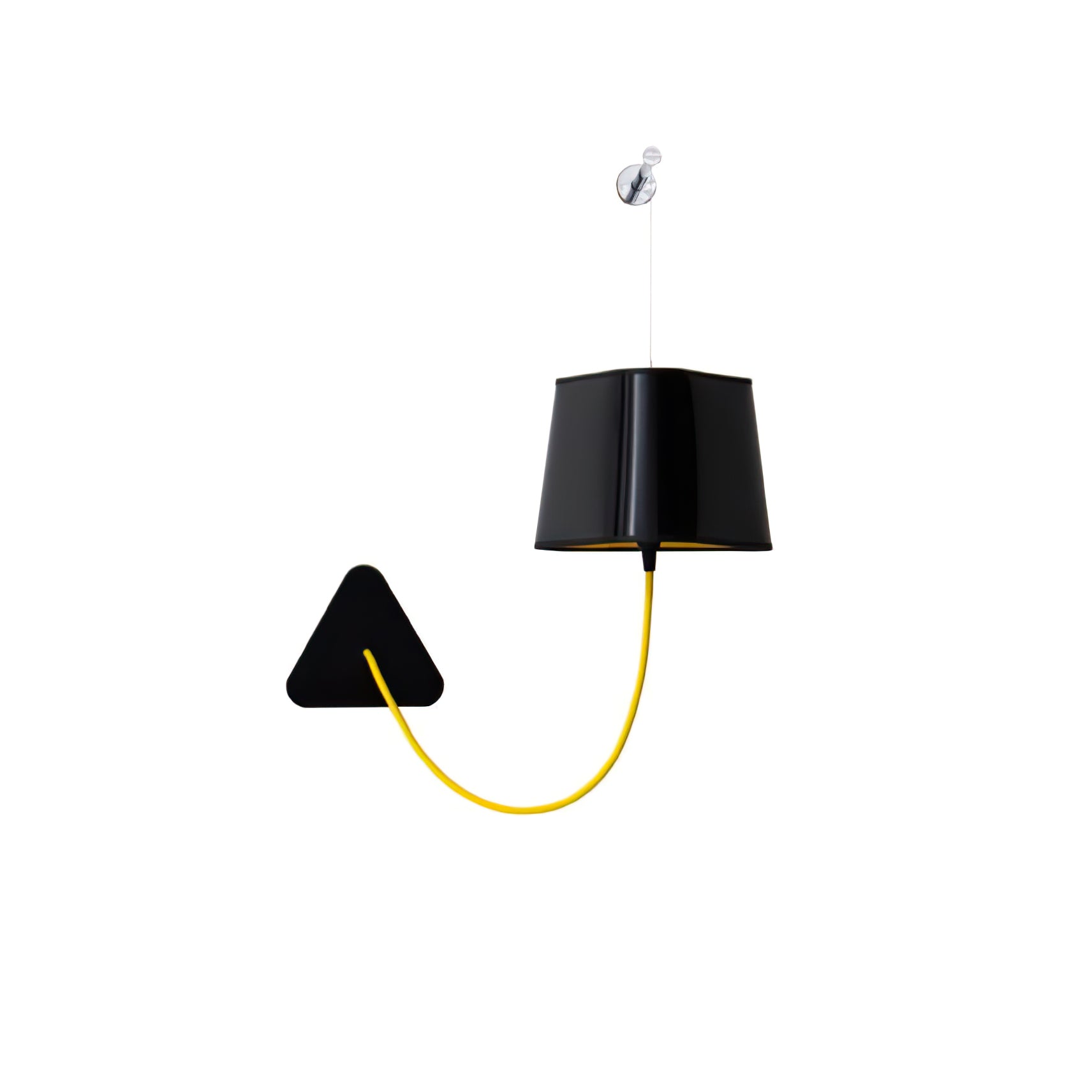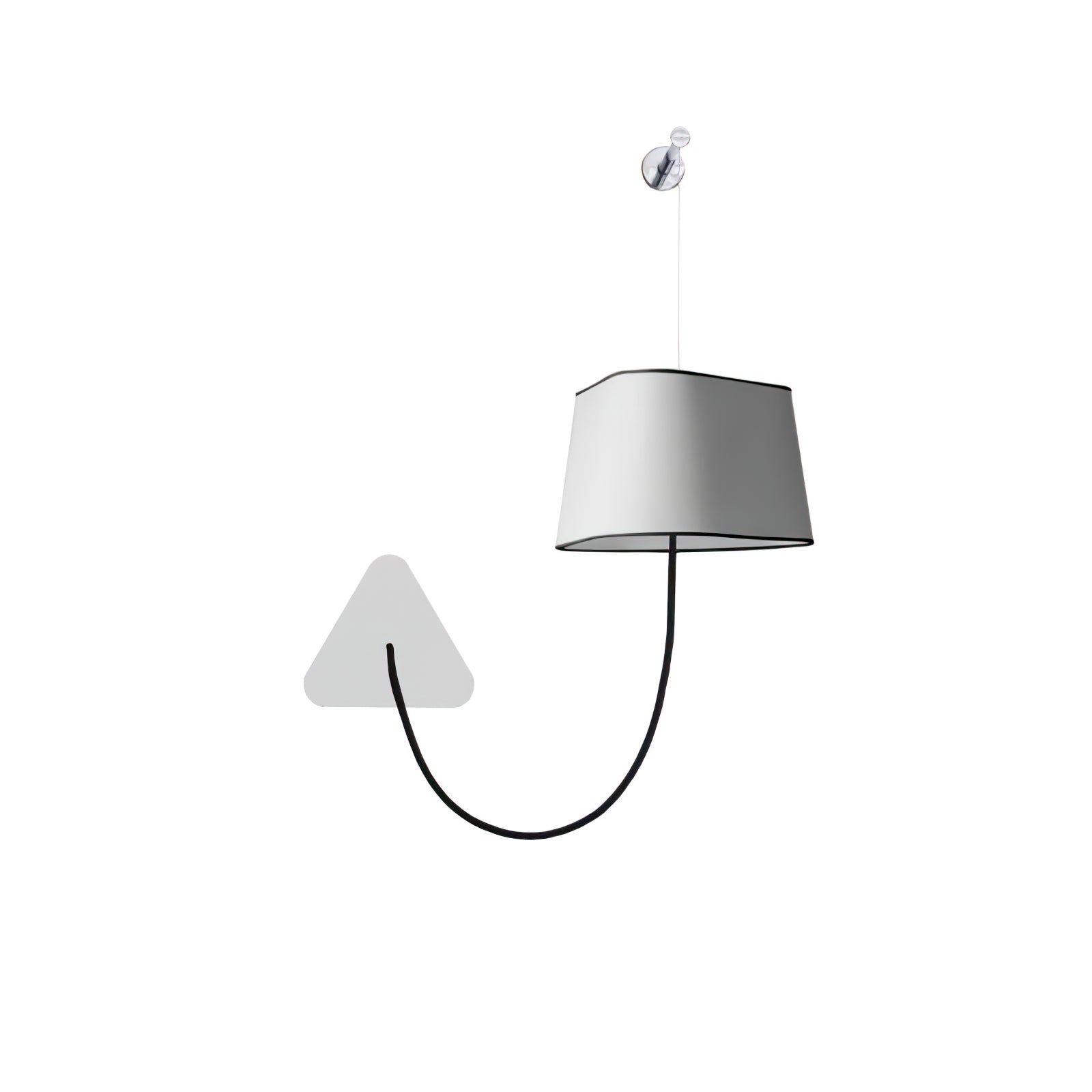 A small wall lamp is composed of a lampshade, a woven power cable, a ceiling fixing, and an adjustable steel suspension cable. Simplicity and purity of lines are the keywords for this practical and modular wall lamp. The triangular lampshade produces a very particular light, cutting out space in an architectural way. Its advantage: flexibility in the choice of its location thanks to the modularity of its height.