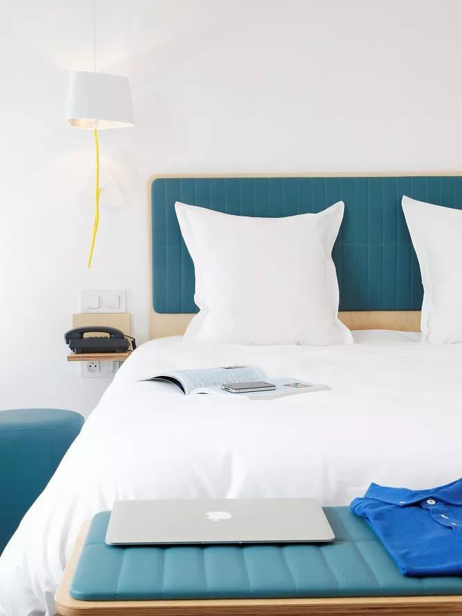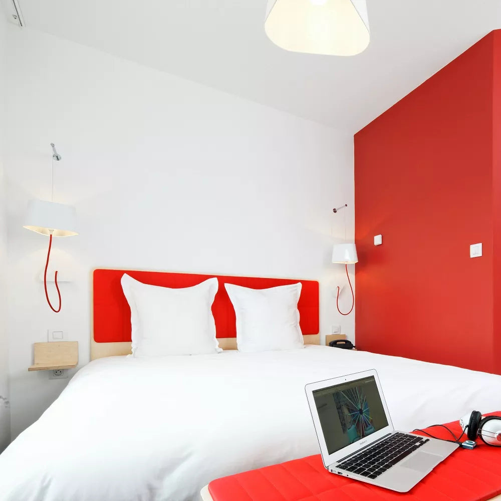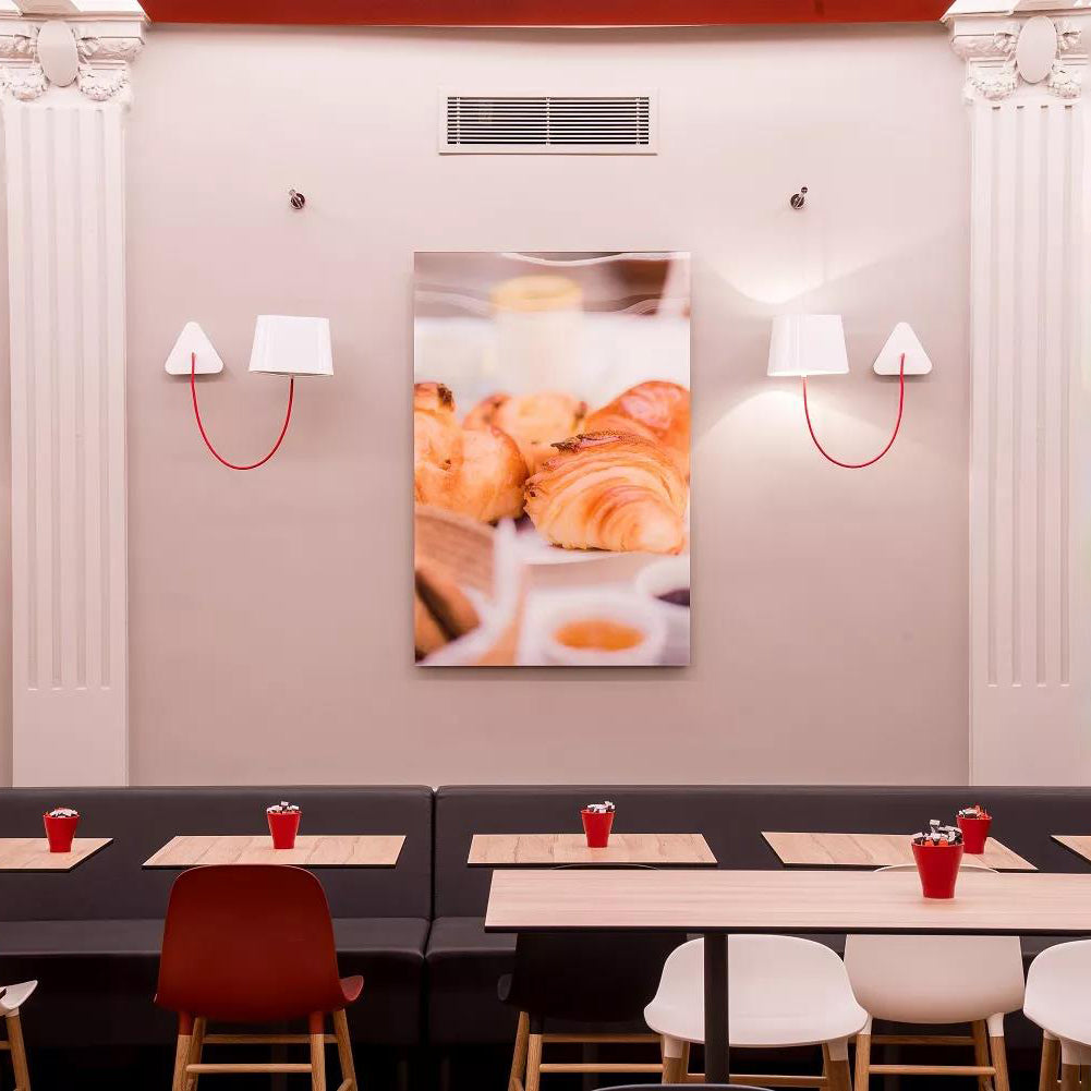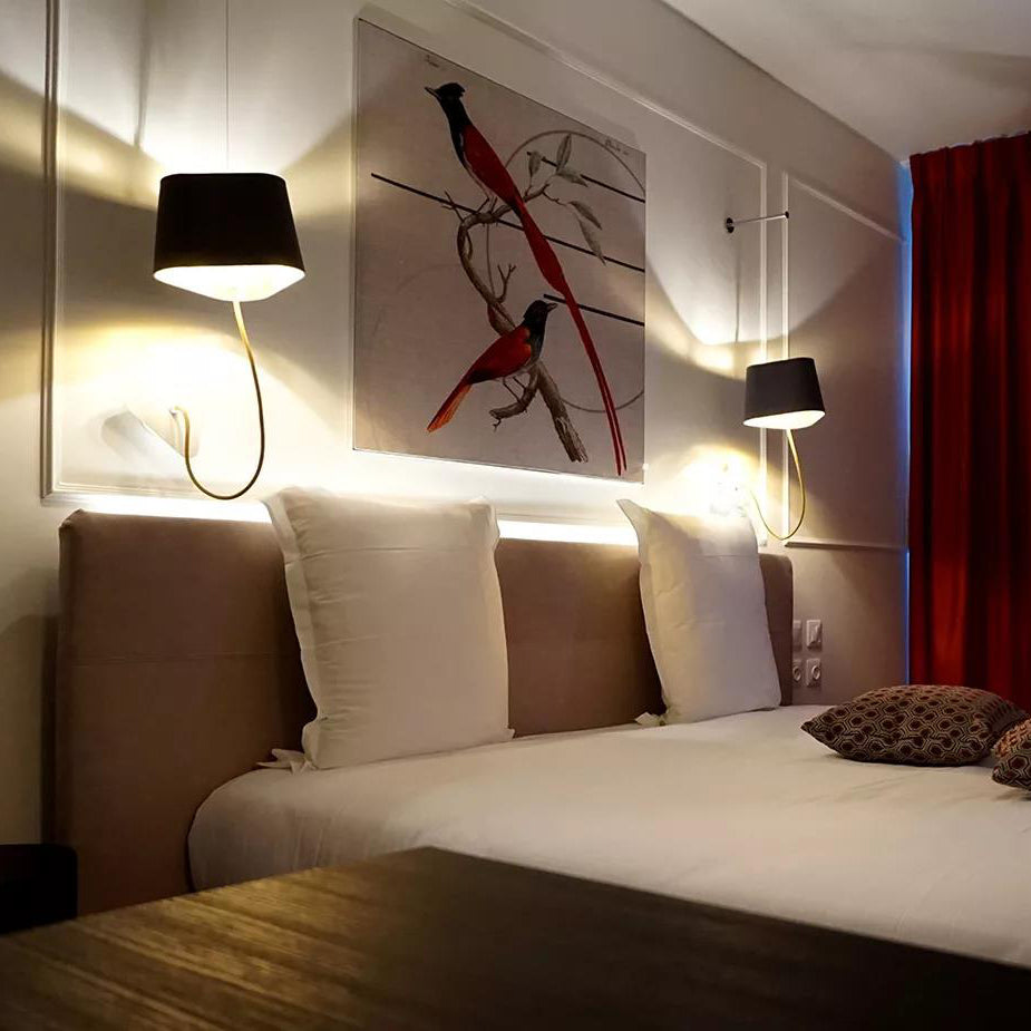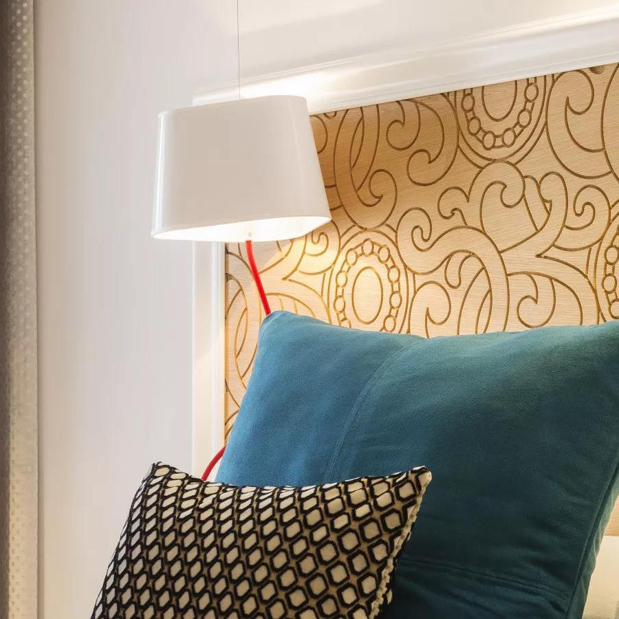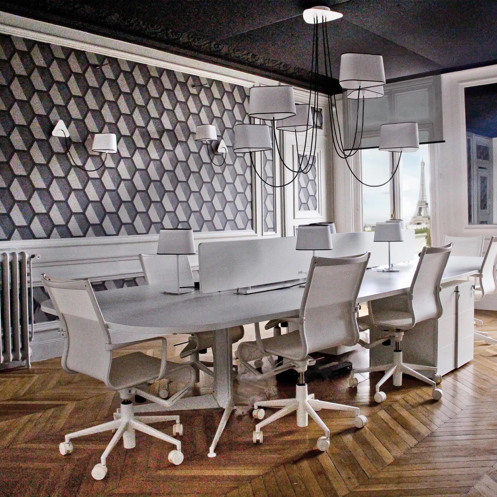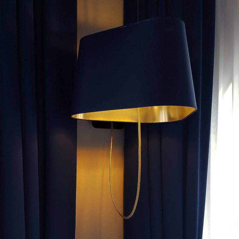 A small wall lamp is composed of a lampshade, a woven power cable, a ceiling fixing, and an adjustable steel suspension cable. Simplicity and purity of lines are the keywords for this practical and modular wall lamp. The triangular lampshade produces a very particular light, cutting out space in an architectural way. Its advantage: flexibility in the choice of its location thanks to the modularity of its height.